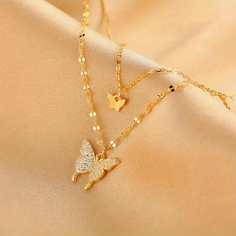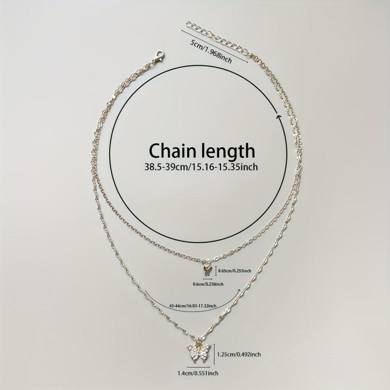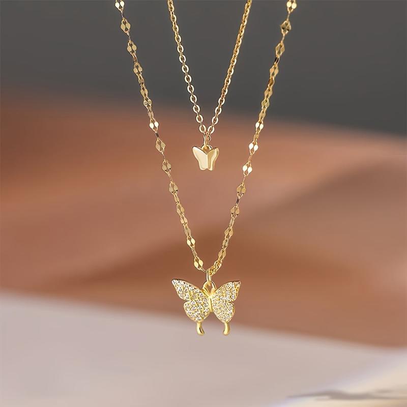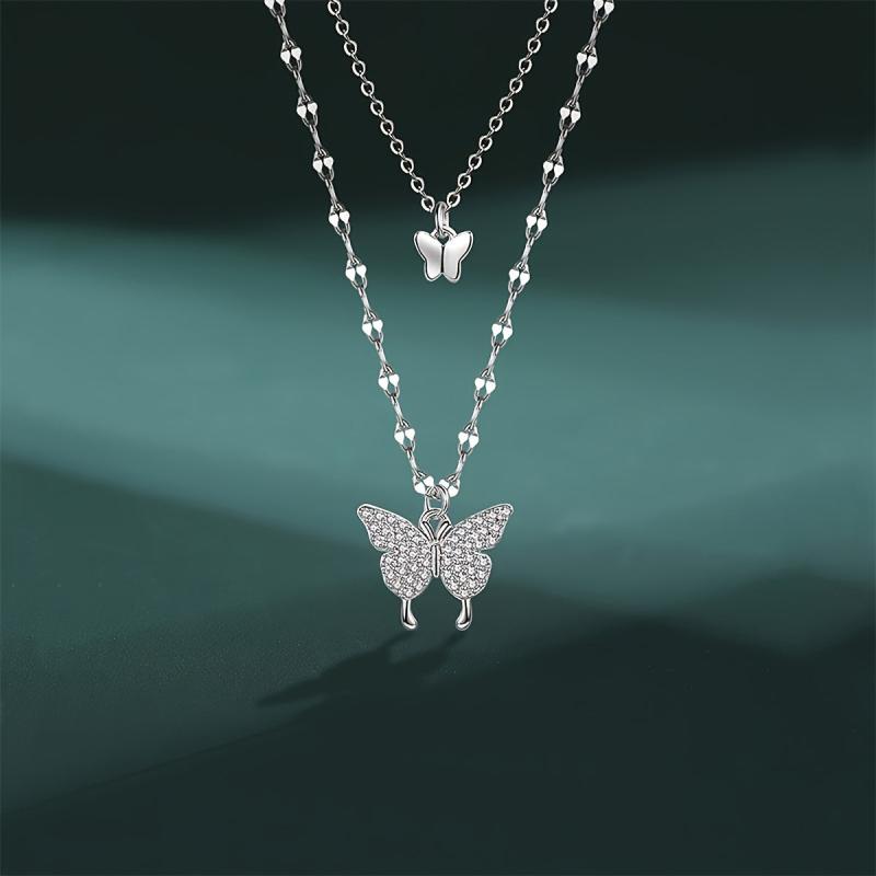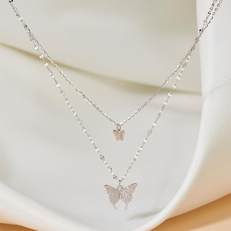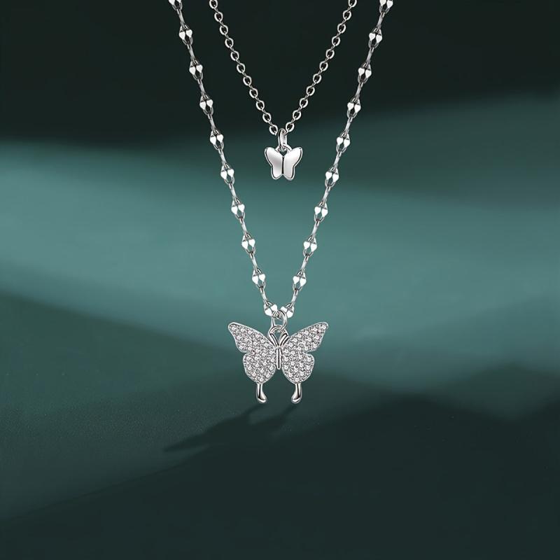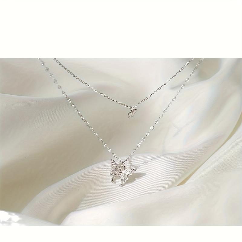 This elegant butterfly pendant necklace features a double layer design with stunning glass detail. It is a versatile clavicle chain perfect for women. Ideal gift for girlfriend, suitable for daily wear or date night.