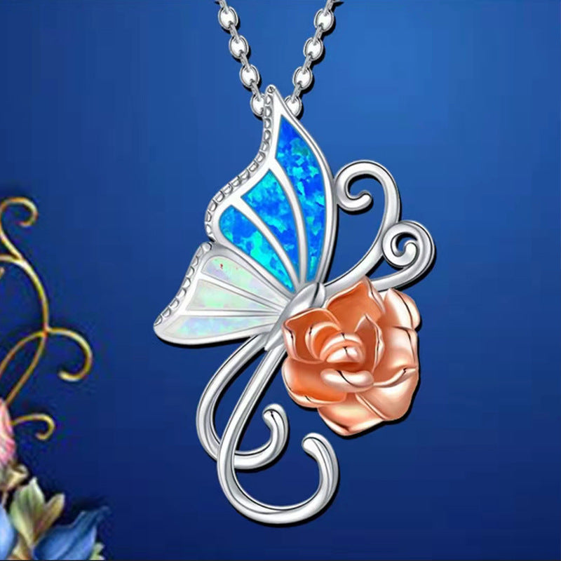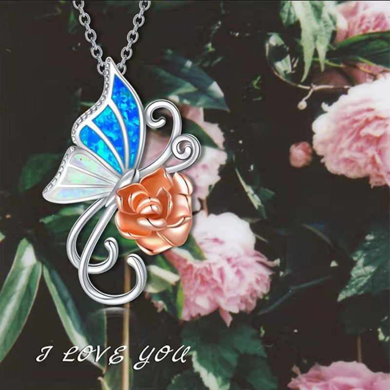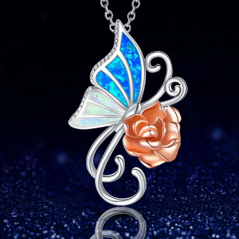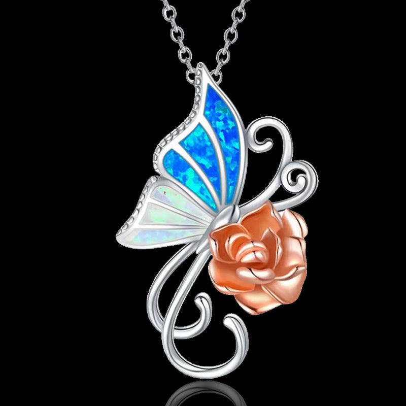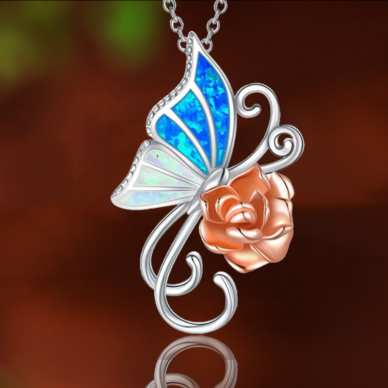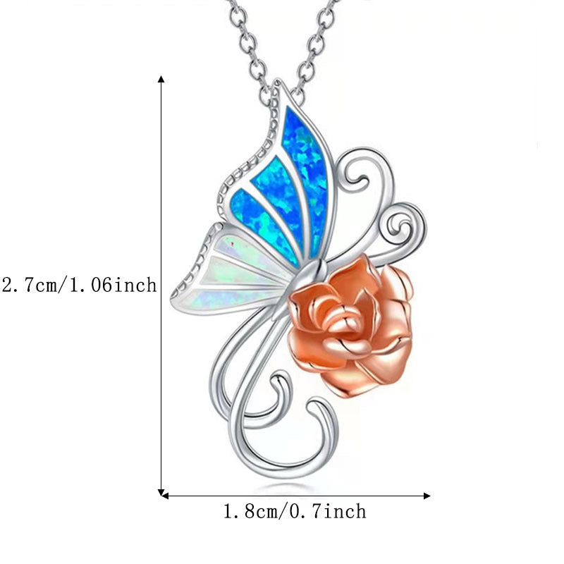 This delicate necklace features a butterfly and rose pendant, crafted from high-quality alloy. Suitable for both males and females.