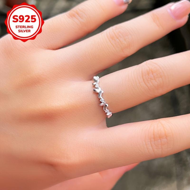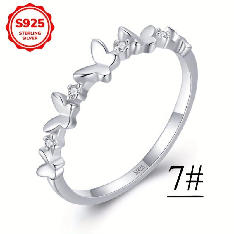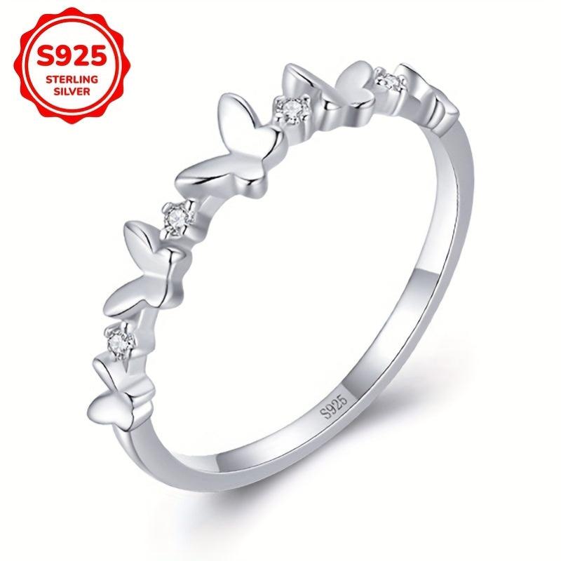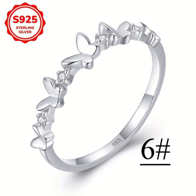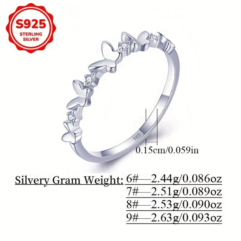 This butterfly-shaped engagement ring is made of hypoallergenic 925 sterling silver and weighs 2.44g to 2.63g per piece. It is adorned with sparkling synthetic zirconia.