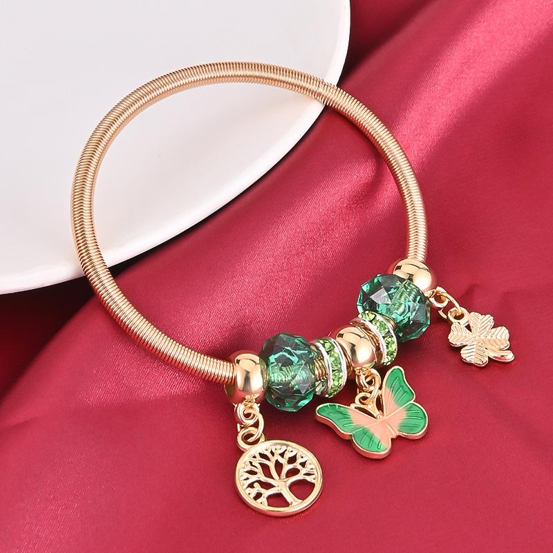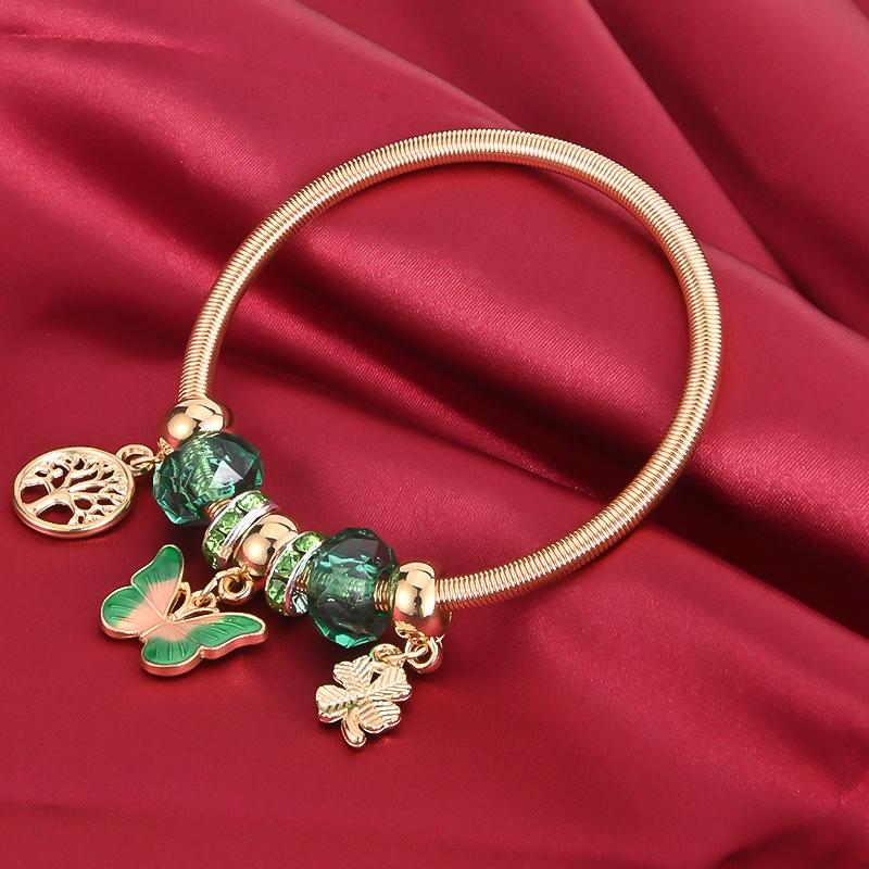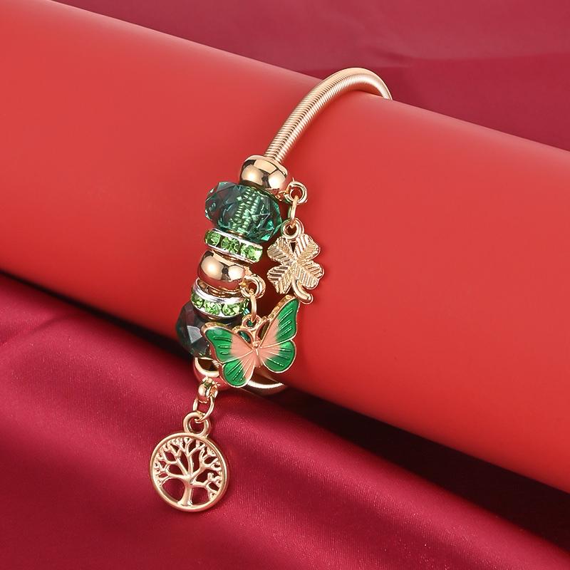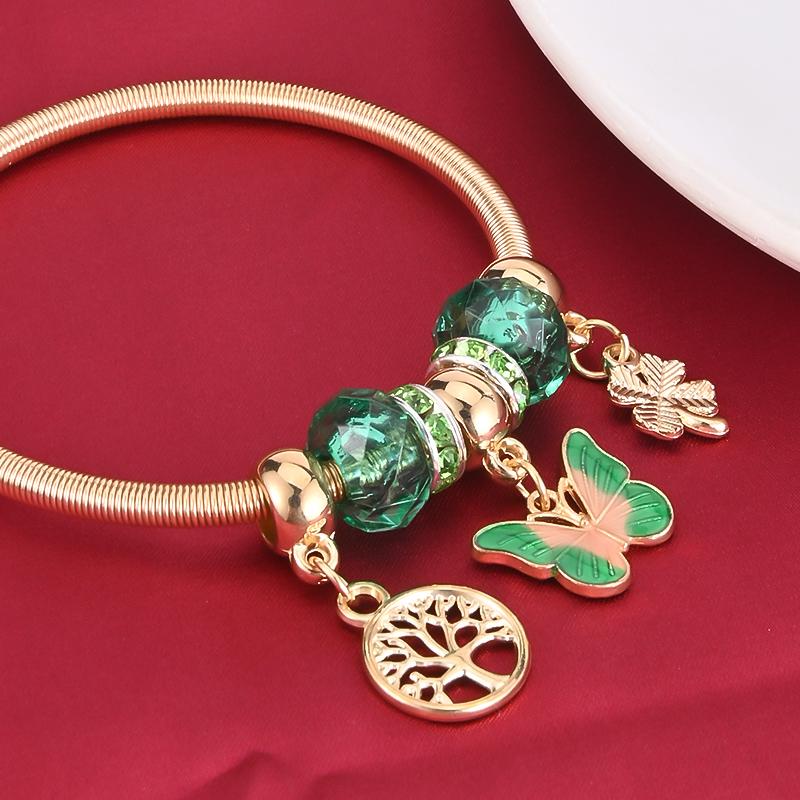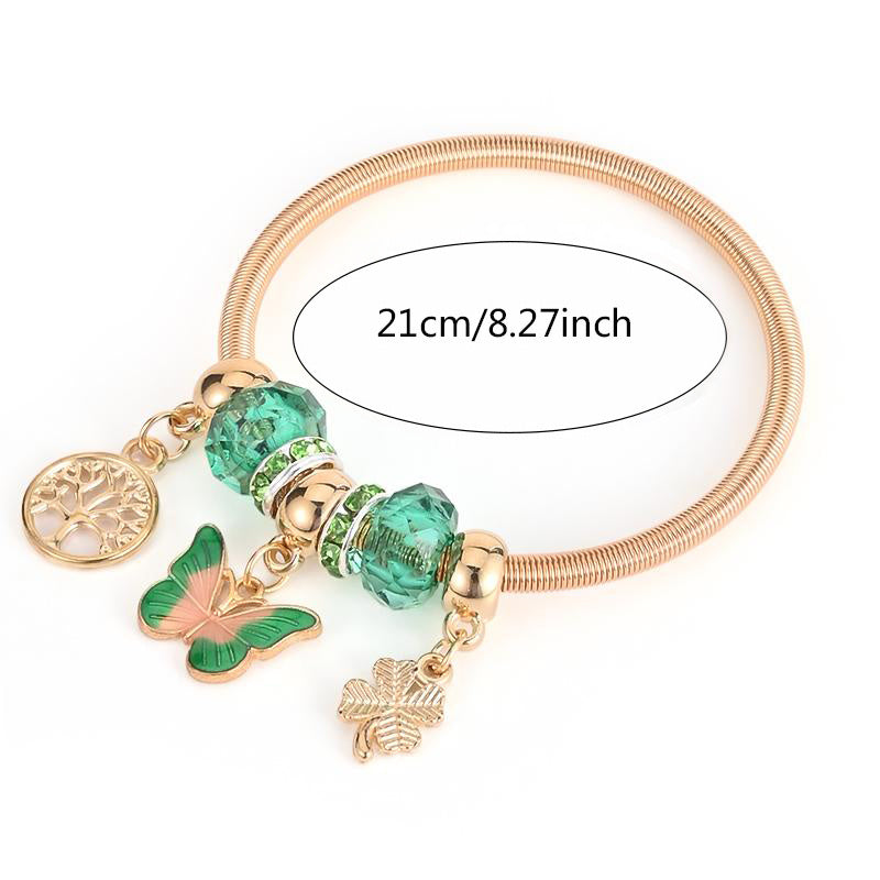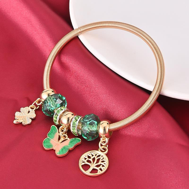 Add a touch of elegance with this butterfly spring bracelet featuring a golden tree of life pendant. A perfect gift for women, this charming bracelet adds a floral charm to any outfit.