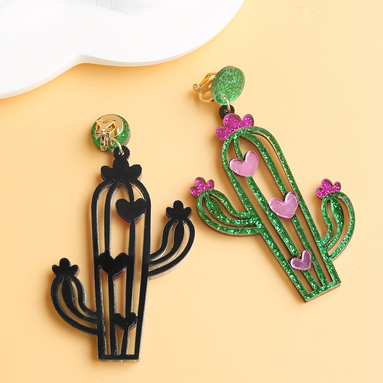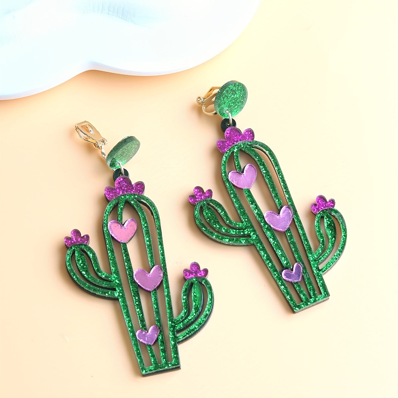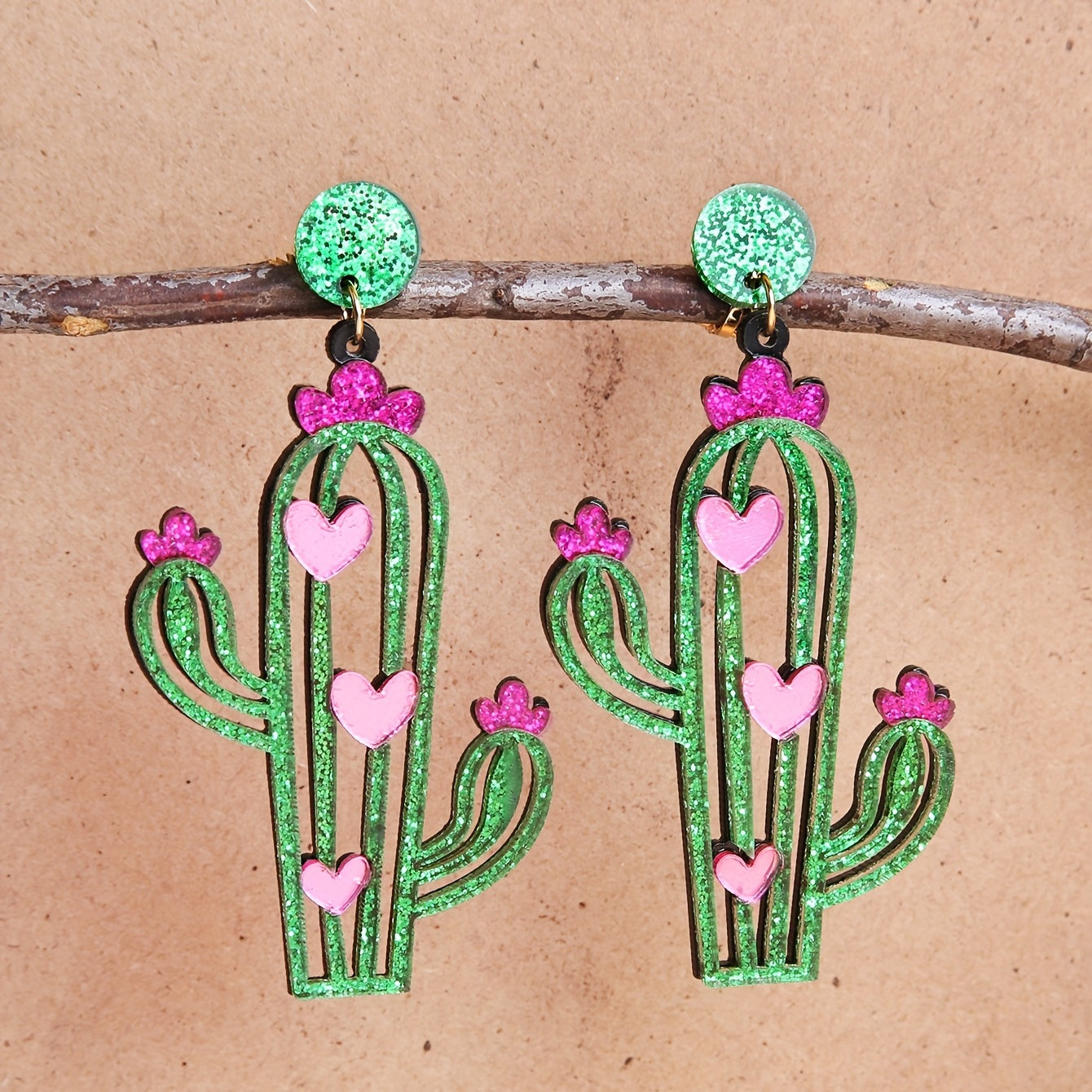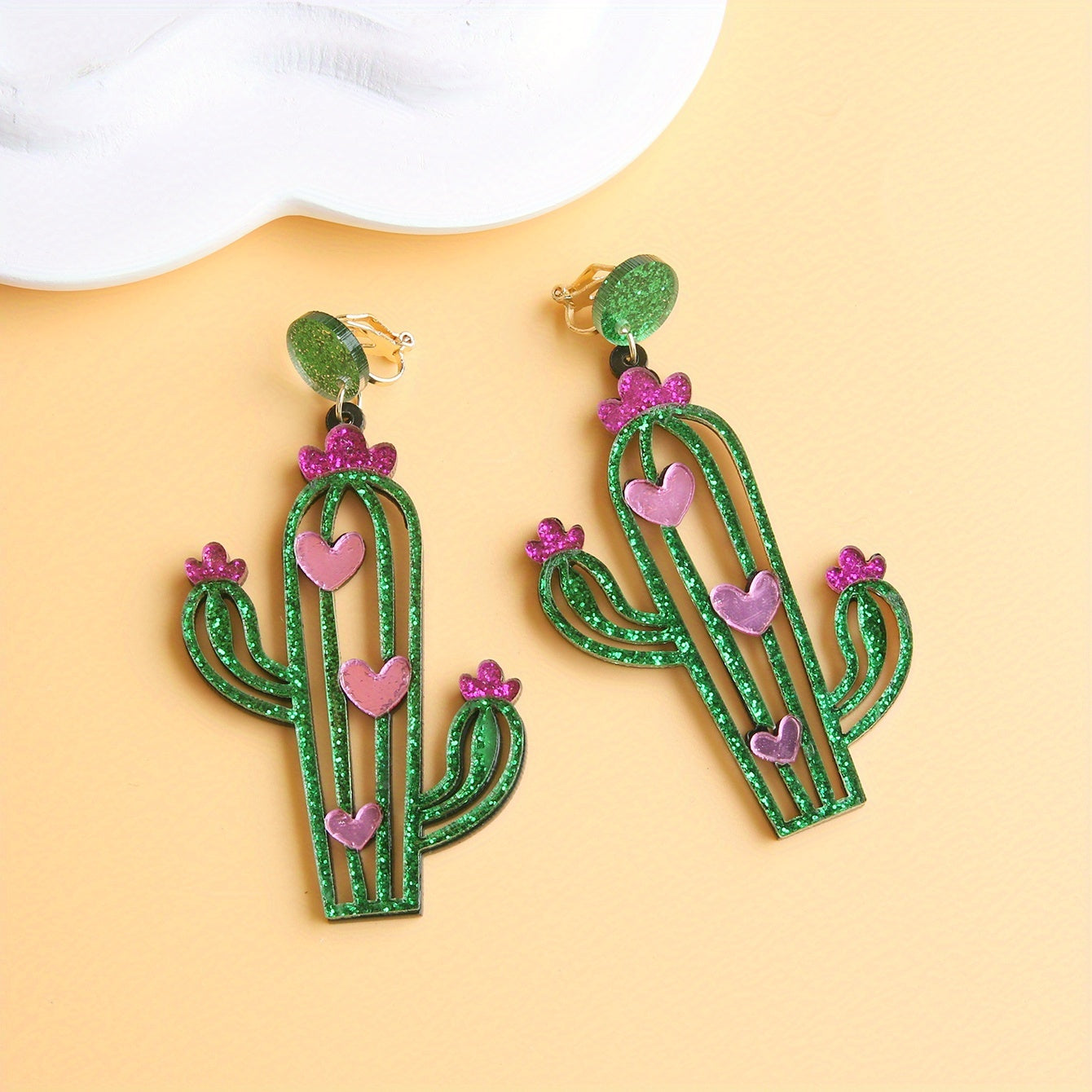 These green cactus earrings with heart pattern are made of acrylic, light weight, and perfect as a creative gift for females.
