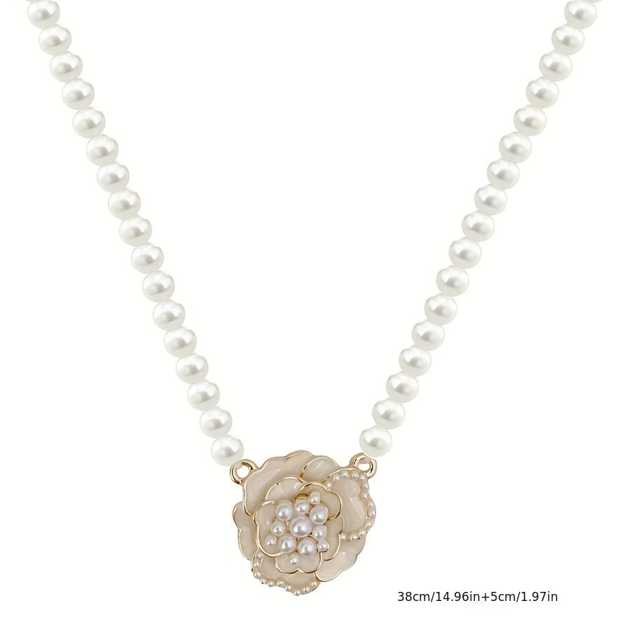 Enhance your summer look with this unique Camellia & Faux Pearl Necklace. Add a touch of personality and elegance to your style with this niche accessory.