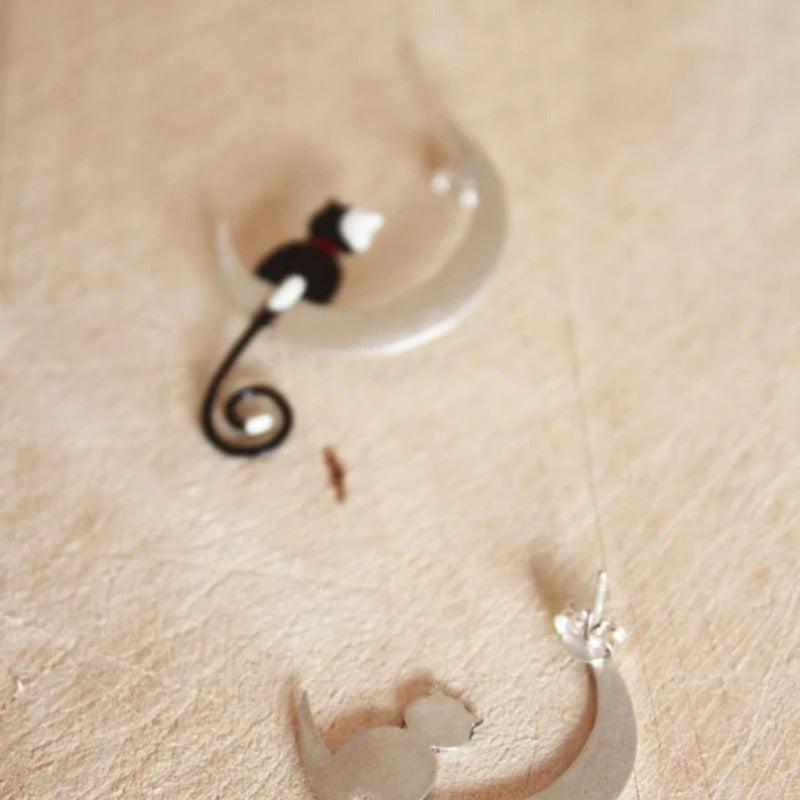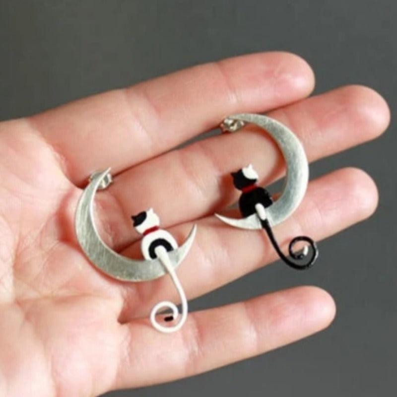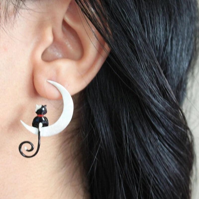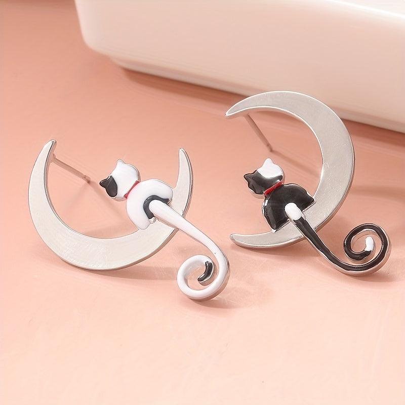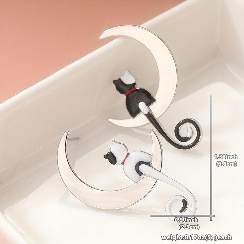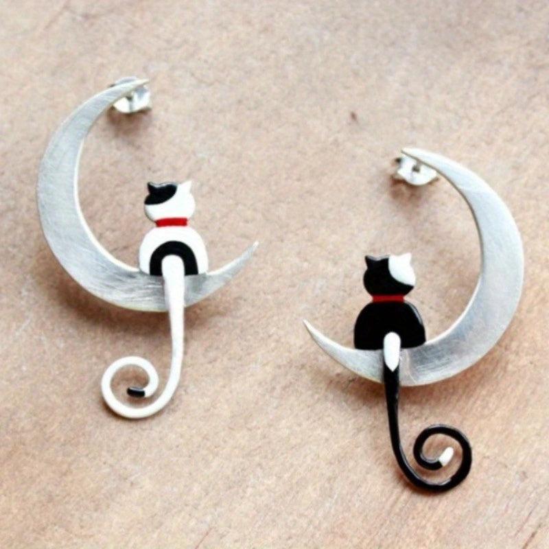 Adorn your ears with these romantic cat and moon earrings featuring enamel jewelry in a vintage bohemian style. These earrings come in dangle or stud designs and are made of 925 silver plated copper. Perfect for Christmas gifts.