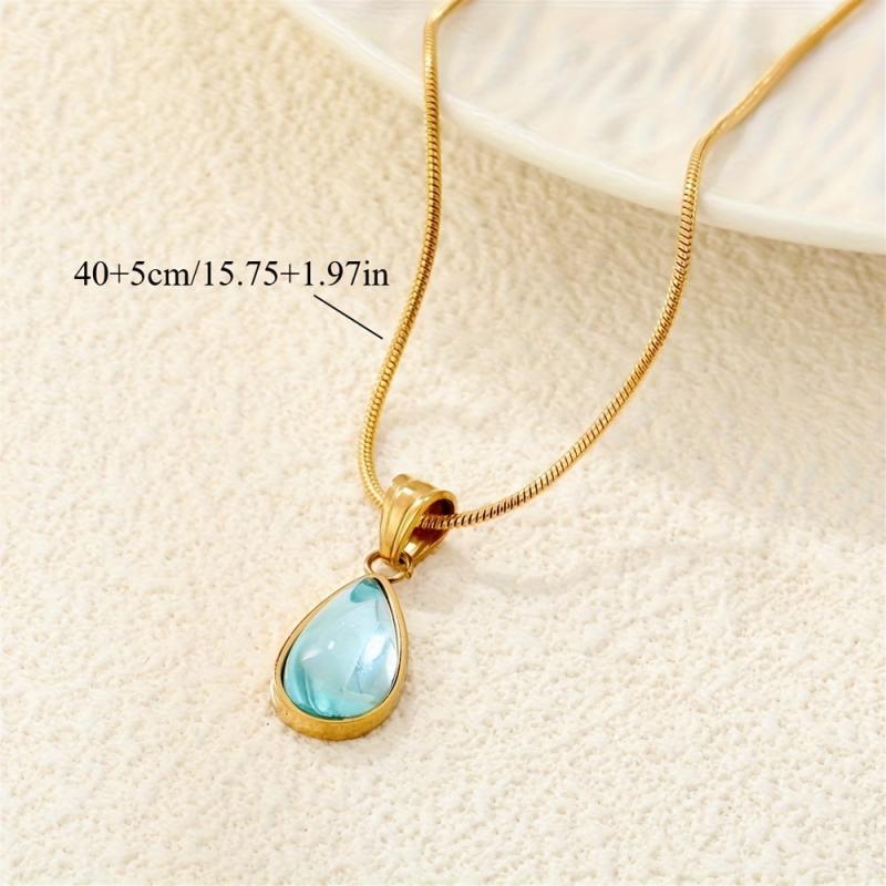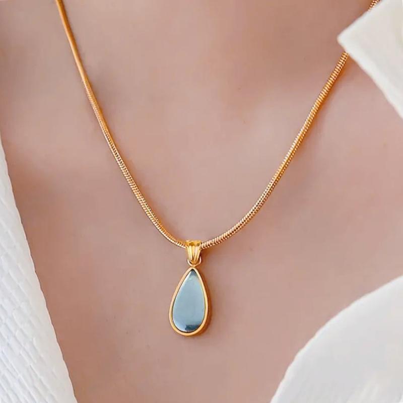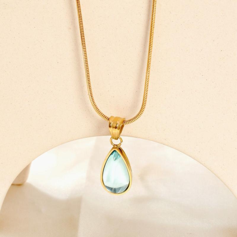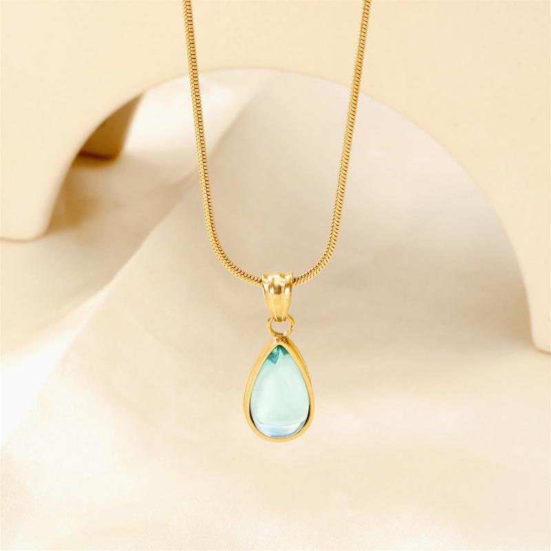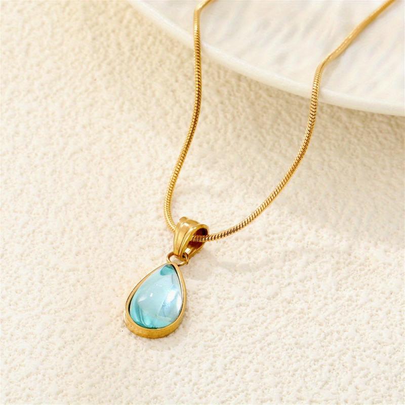 Elevate your summer vacation and casual attire with this vintage and sexy style pendant necklace featuring a cat's eye stone teardrop. The necklace is crafted with a golden tone stainless steel chain for a luxurious look.