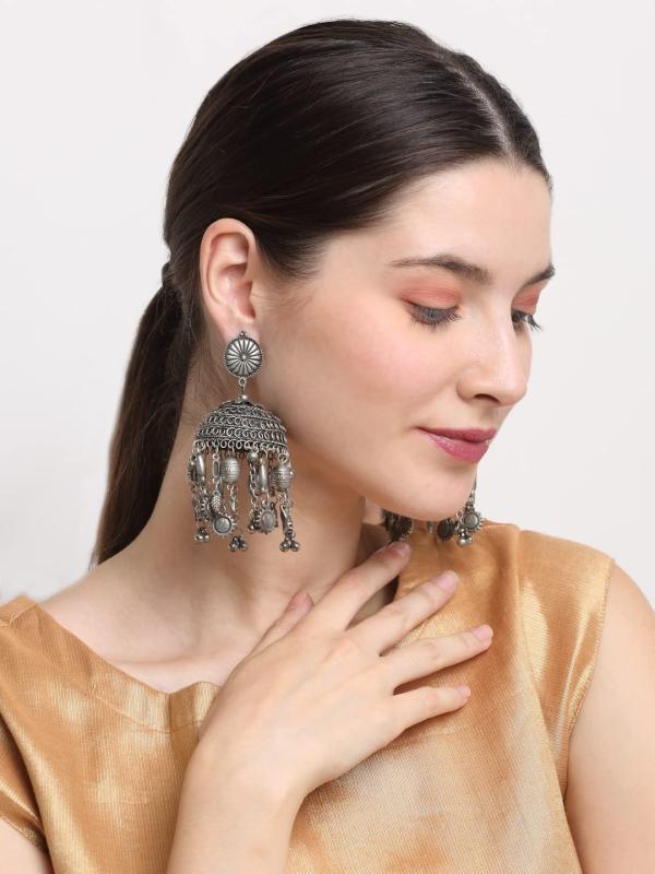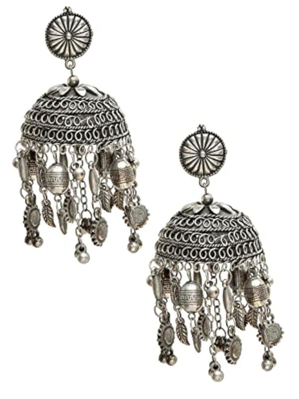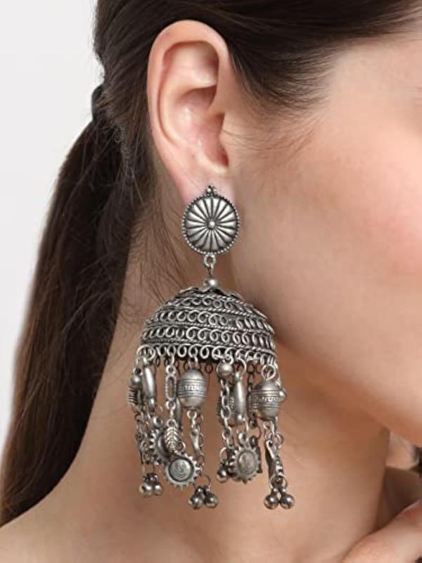 Elegant and stylish jhumki earrings inspired by celebrity fashion trends. Made from oxidised silver for a unique look.