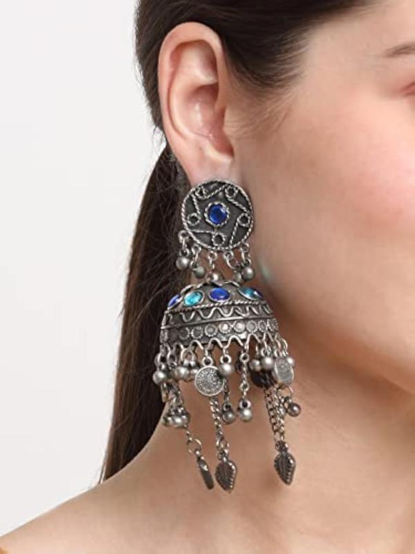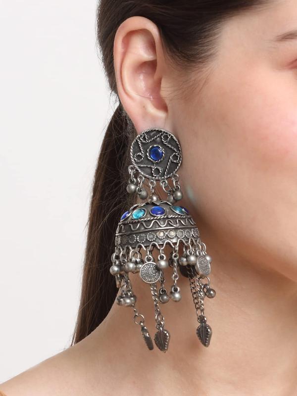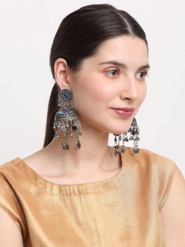 Make a statement with these stylish oxidised silver jhumki earrings inspired by celebrities. Perfect for any occasion.