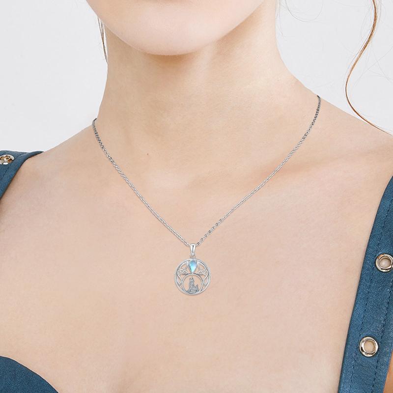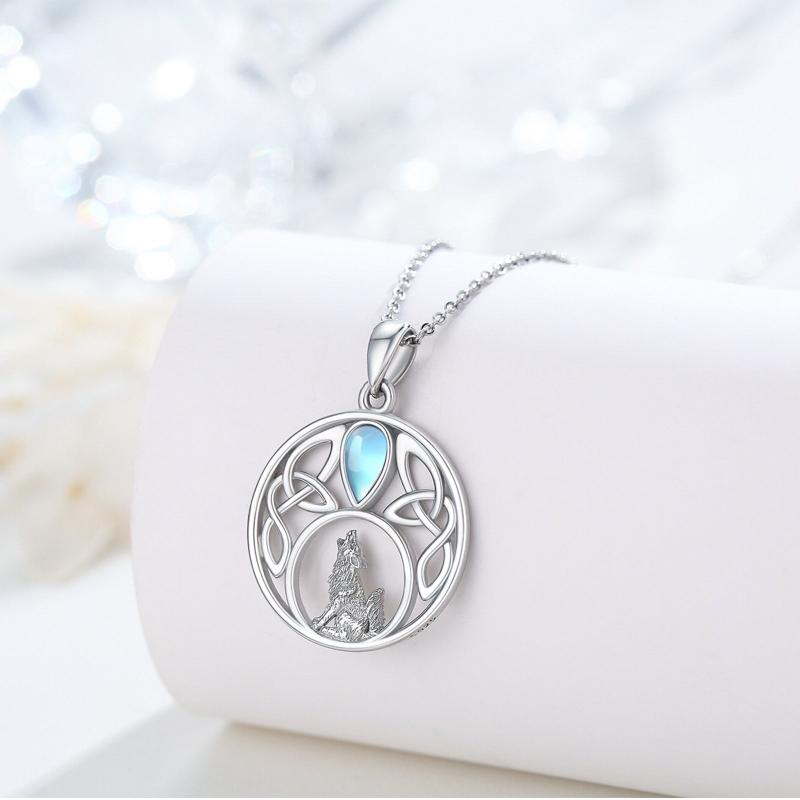 This Celtic Knot Wolf Moonstone Necklace is made of 925 Sterling Silver featuring a crescent moon design with a moonstone in the center. Perfect for girls and women who love Celtic knot designs.