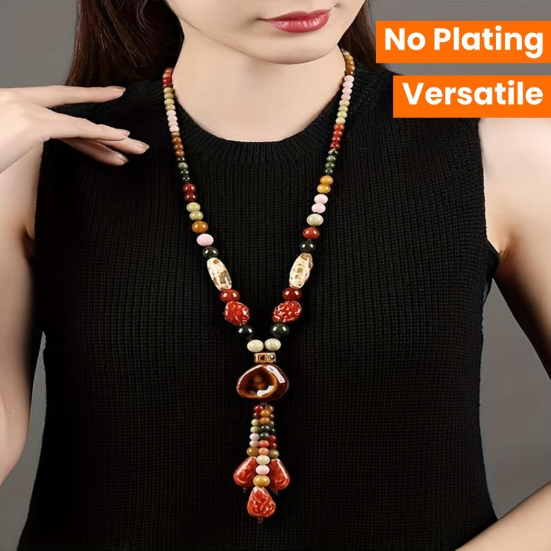 This fashionable ceramic Y necklace features a unique design inspired by tribal and Chinese styles. It is a perfect accessory for daily wear or as a gift for any occasion. The pendant is handcrafted and the chain has no plating, making it a durable and stylish choice.