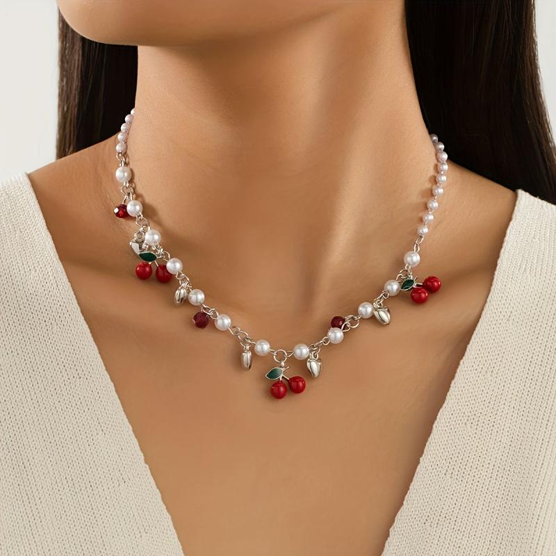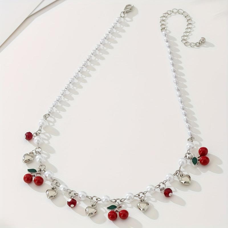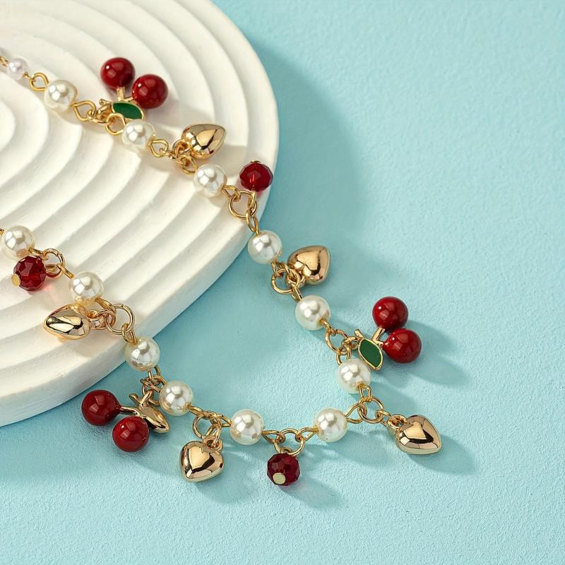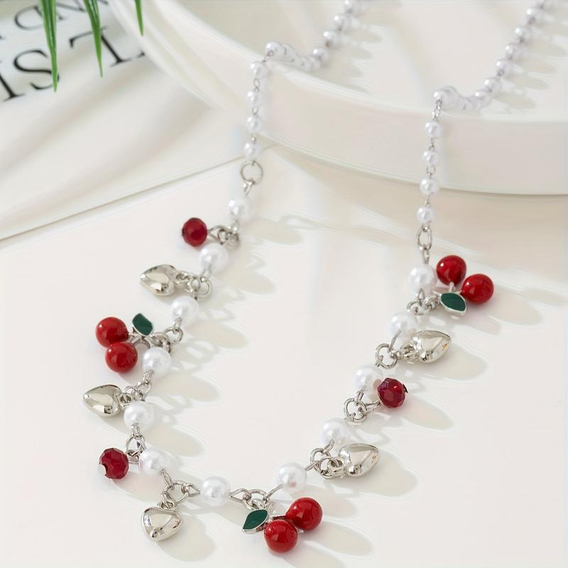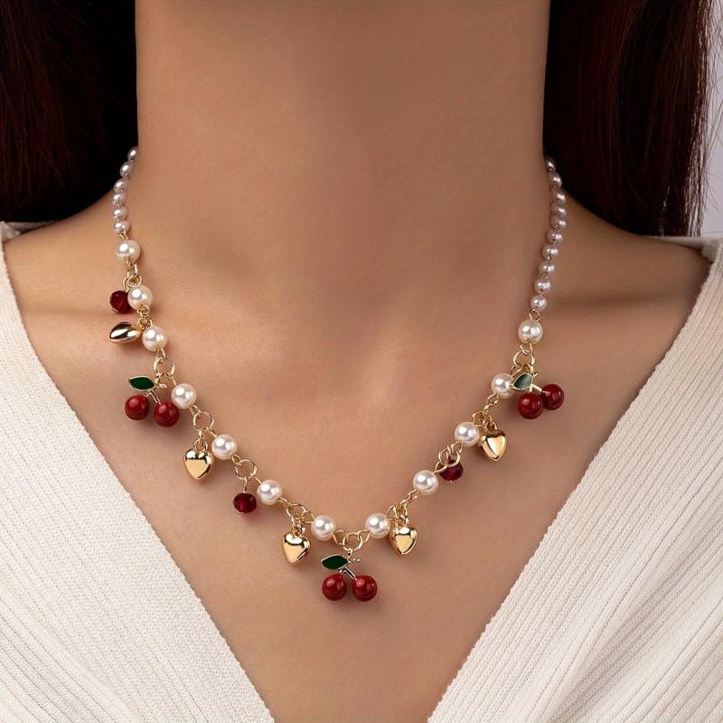 This charming necklace features cherry beads and golden heart shape charms, perfect for adding a touch of personality to your look. Ideal for parties, banquets, or daily wear.