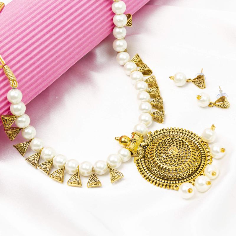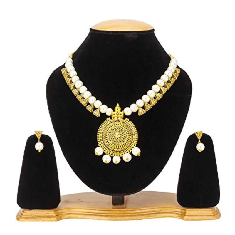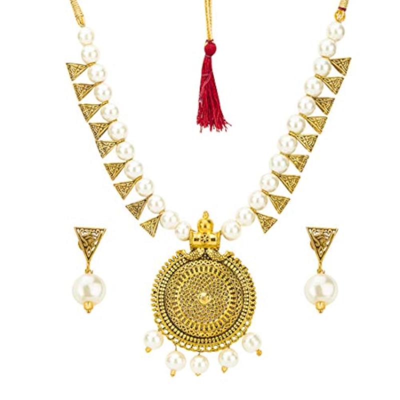 Enhance your outfit with this elegant gold jewelry set. The necklace and earrings feature a stunning design that adds a touch of sophistication to any look.