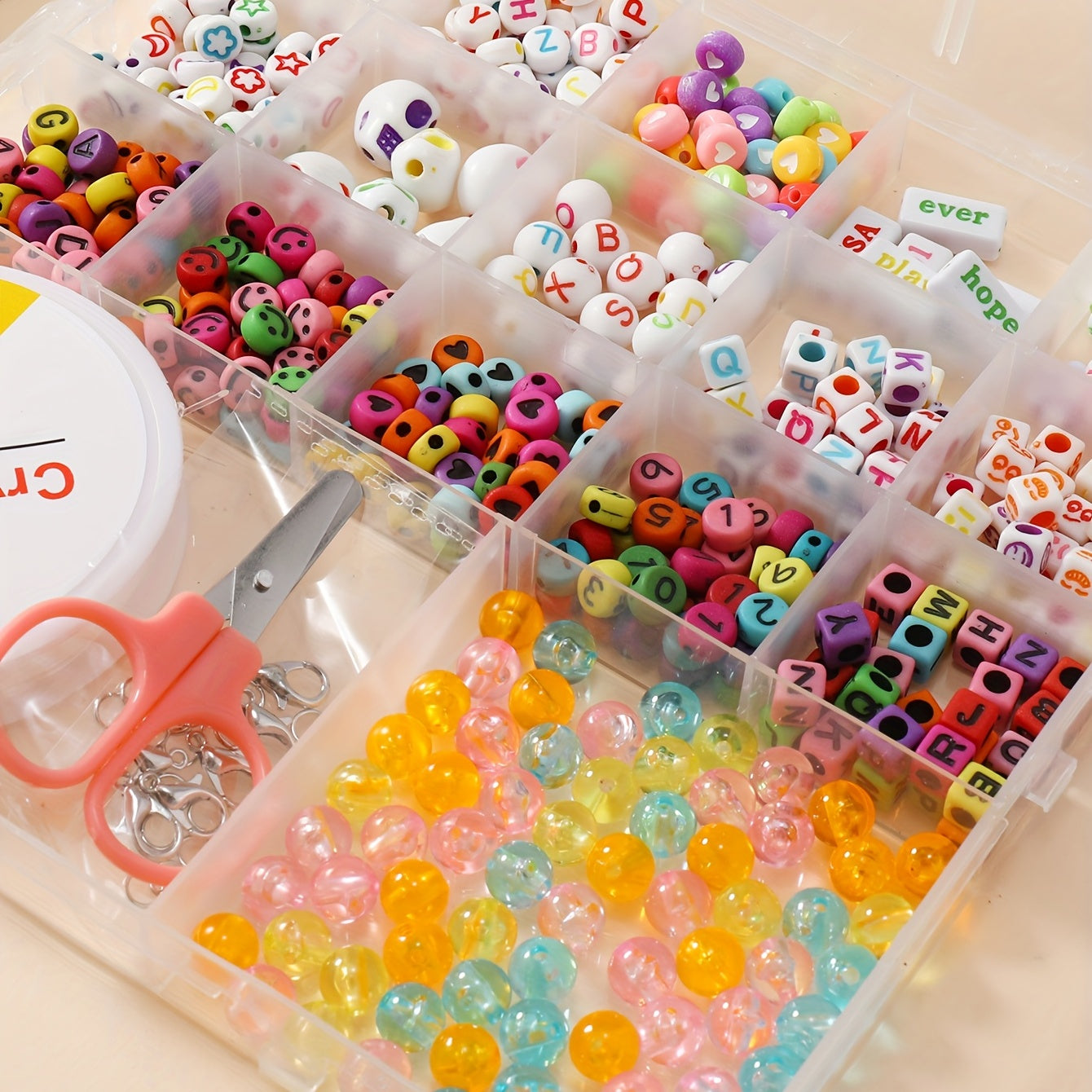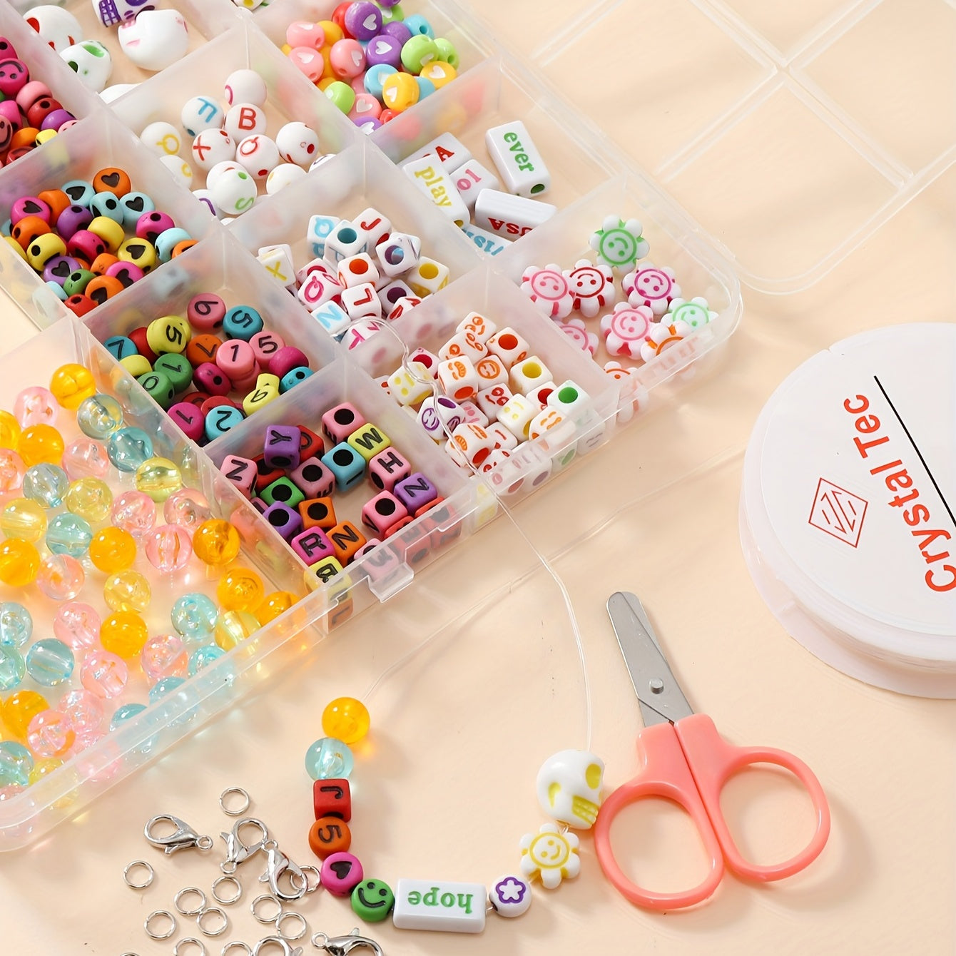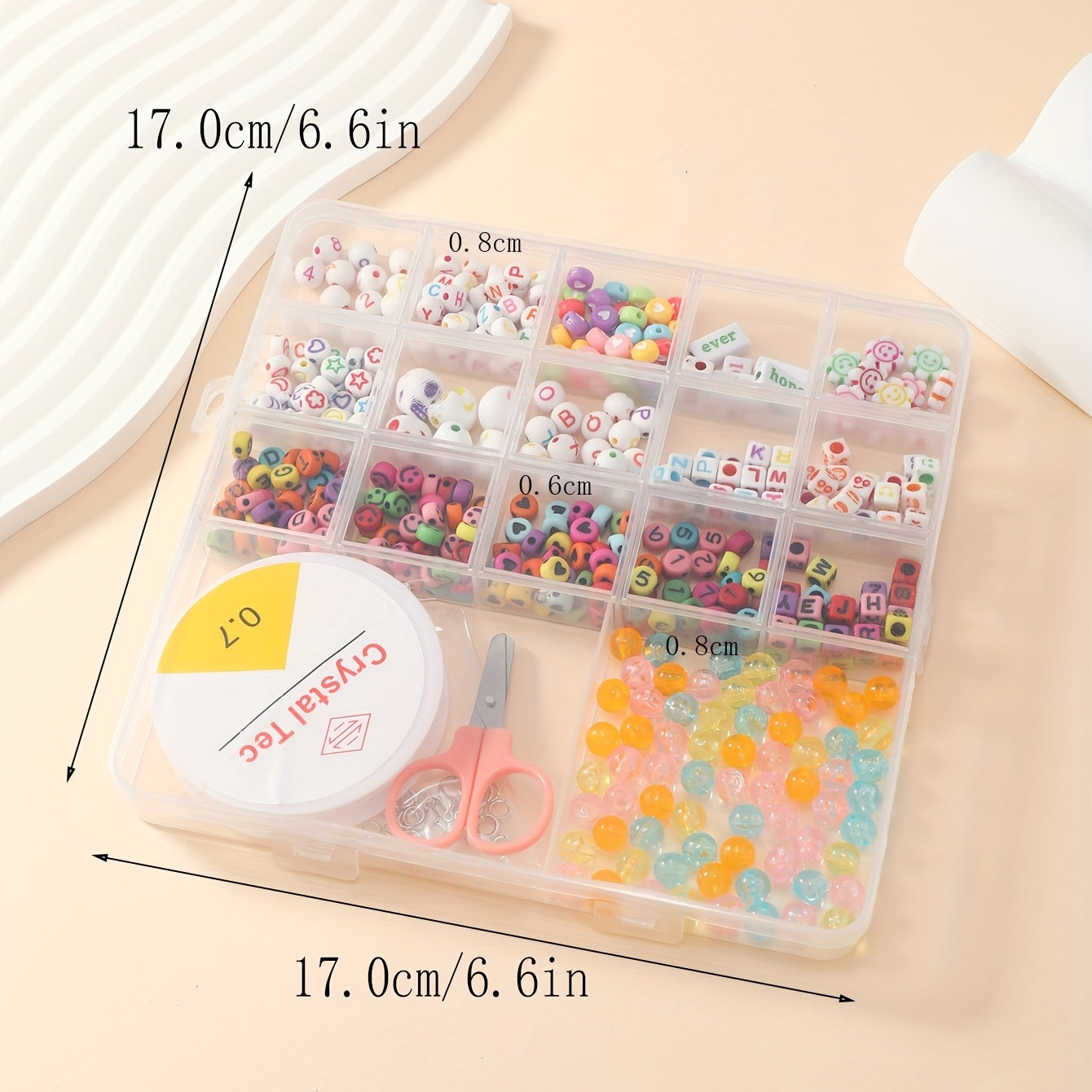 This 17 compartments box contains a variety of soft pottery beads, letter beads, glass rice beads for kids to create their own unique jewelry pieces. Perfect for educational and creative play.