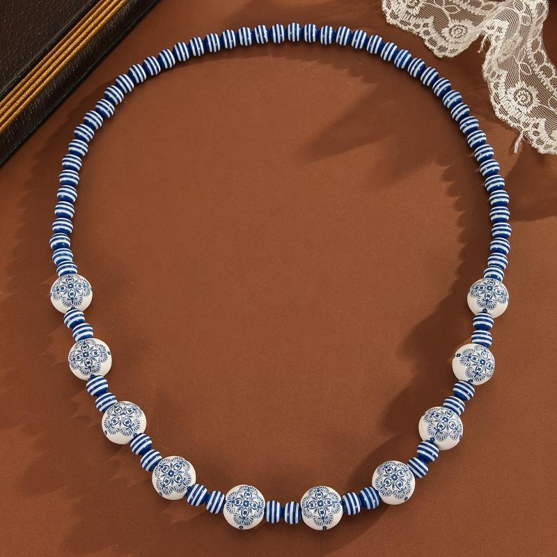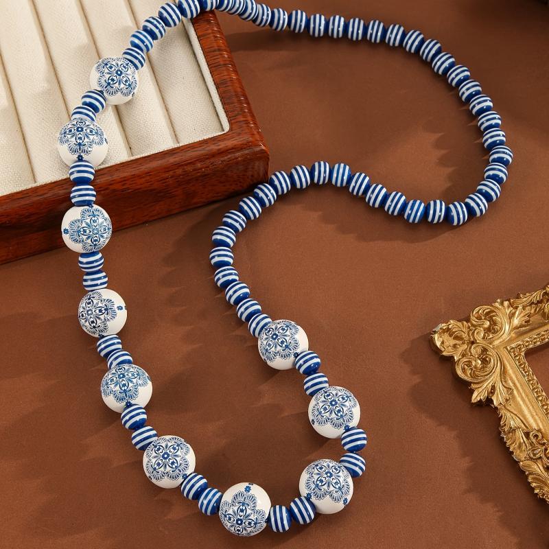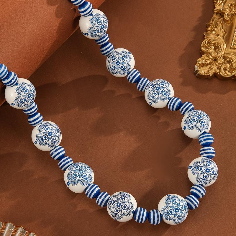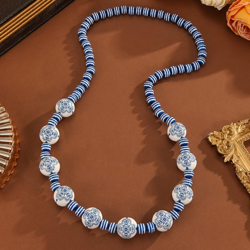 This Chinese-inspired necklace features a porcelain floral print on wood beads, perfect for vacation and daily wear. It makes a lovely birthday gift.