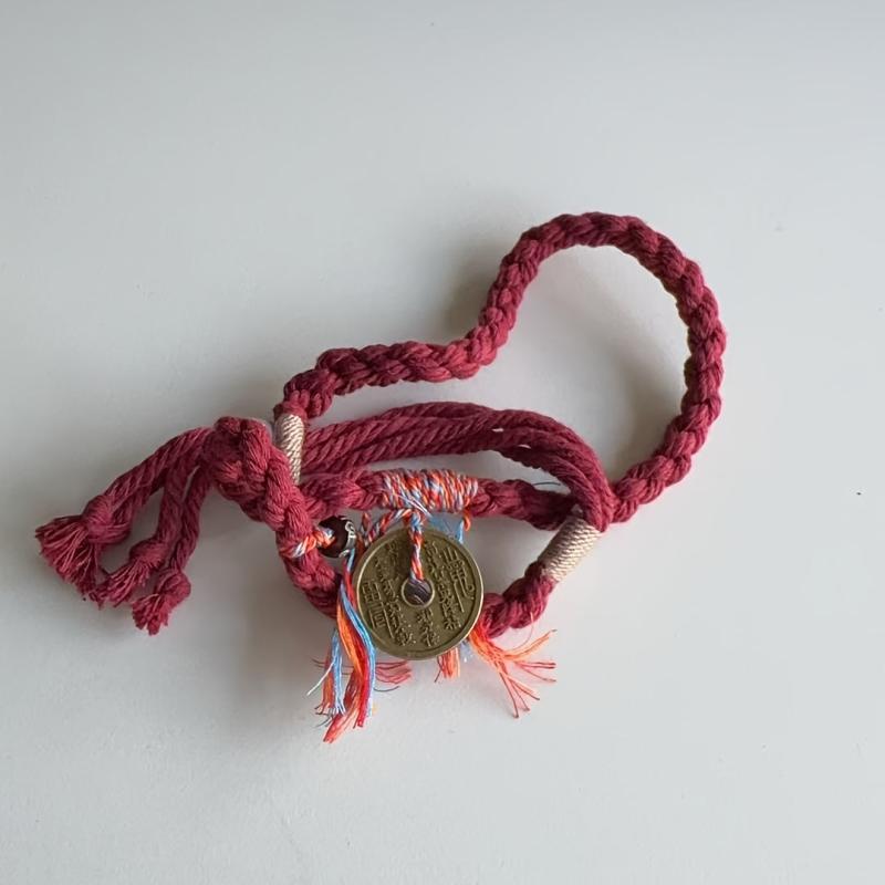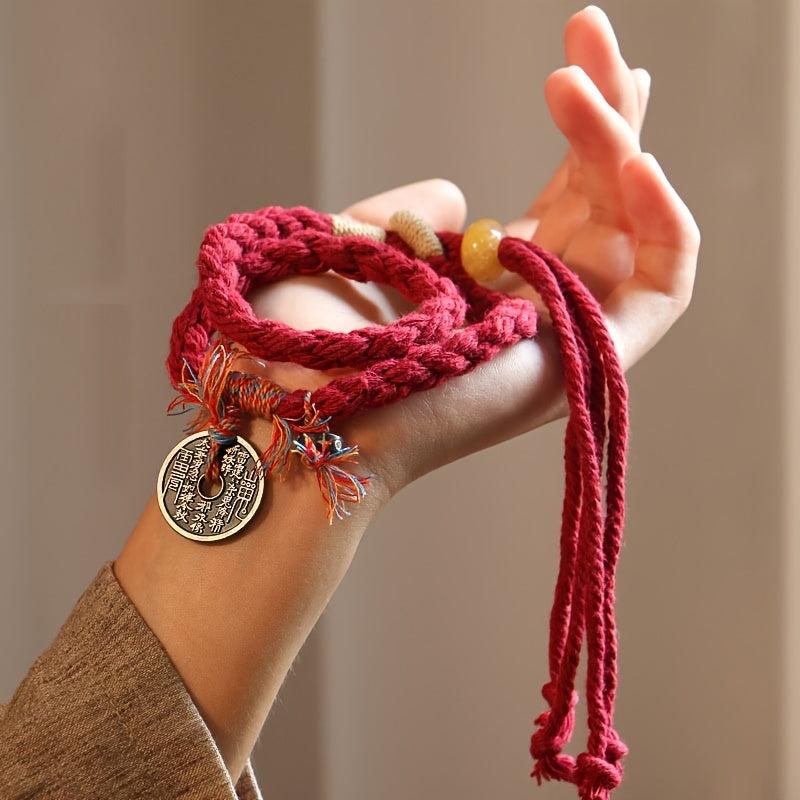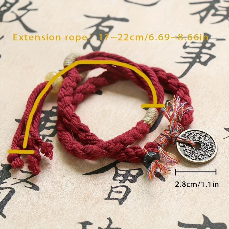 Elegant red Chinese knot bracelet with a golden coin pendant. Handwoven for a traditional look and stretch design for comfortable wear.