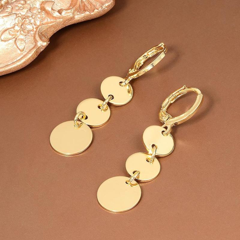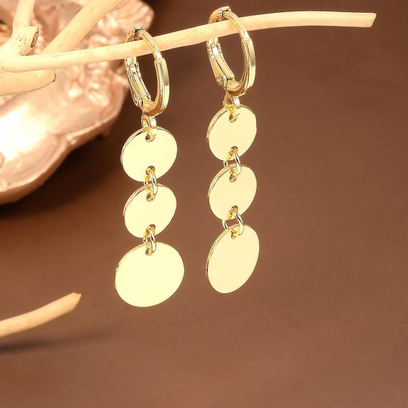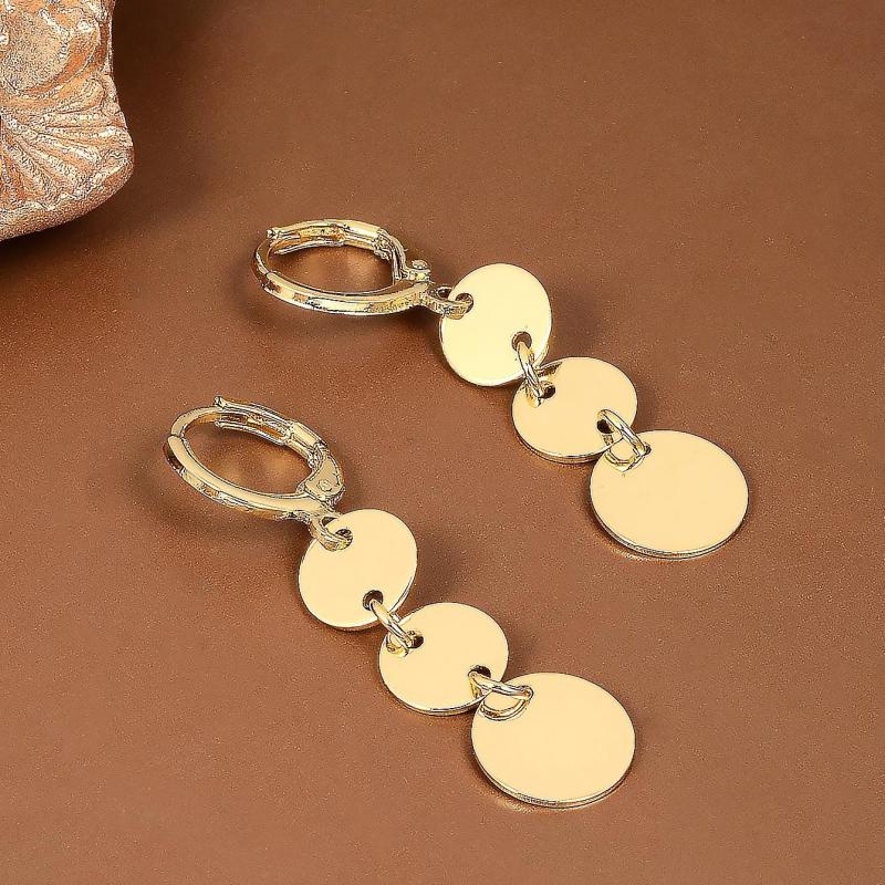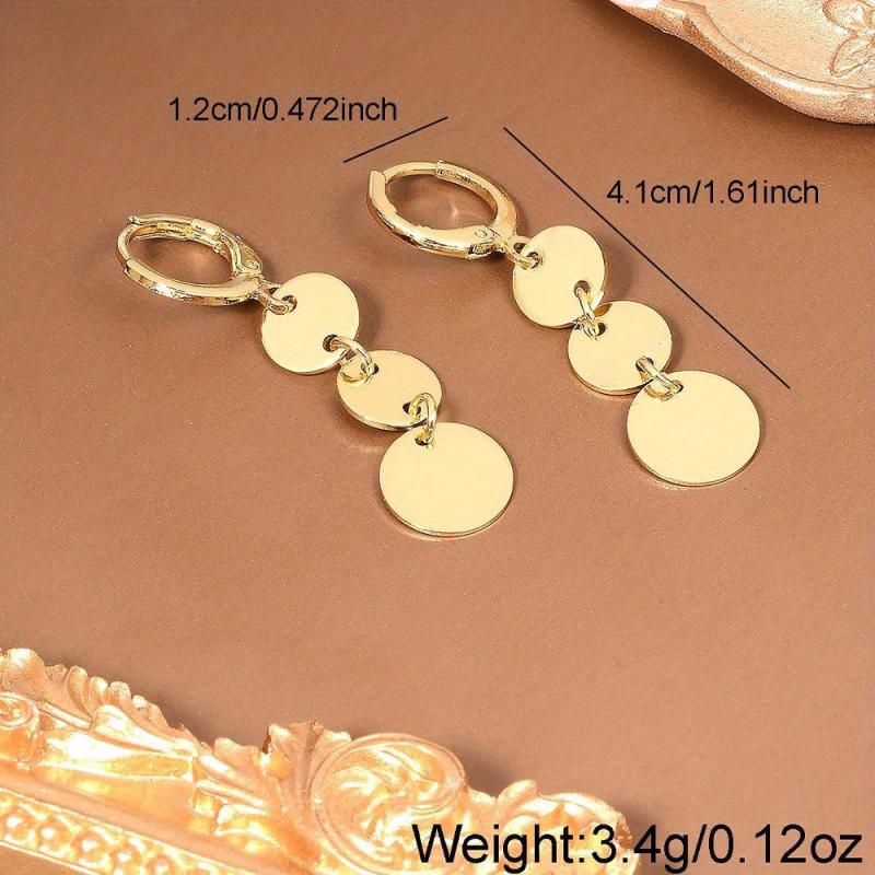 These geometric circular disc dangle earrings feature a golden tone metal design, perfect for everyday wear or special occasions. Versatile and stylish, these earrings are a must-have for any woman's jewelry collection.