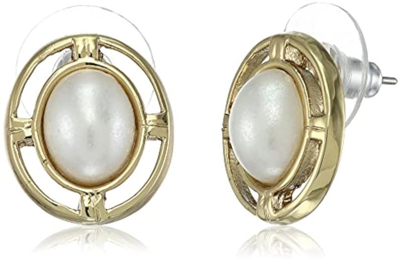 Elegant circular stud earrings featuring a glowing pearl, plated in 24kt gold.