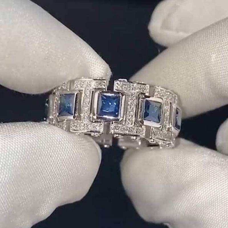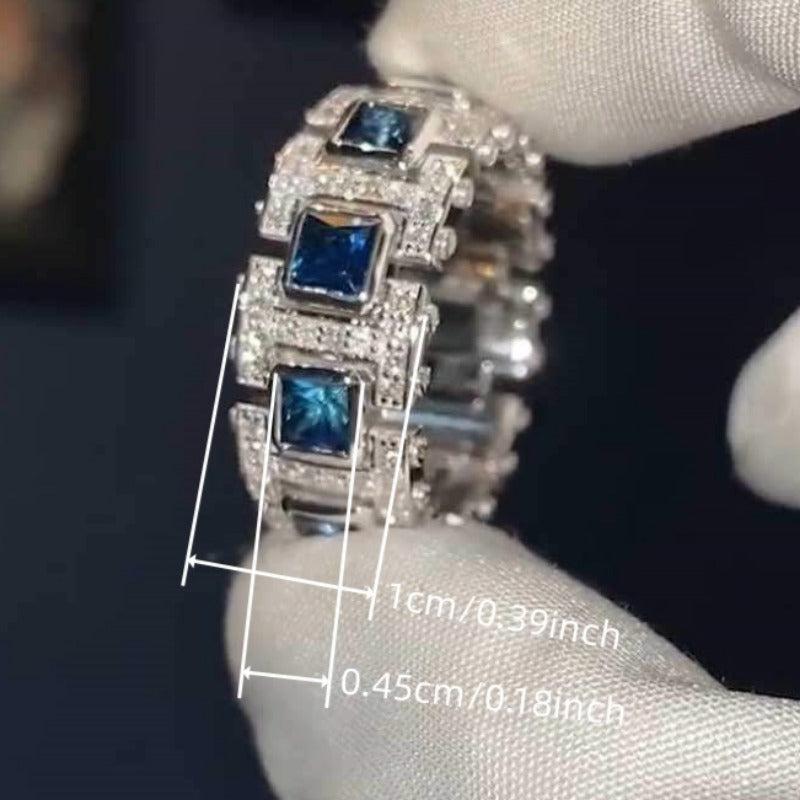 Stylish wide band ring featuring synthetic zirconia and clear gemstones in a platinum-plated setting. This versatile piece is perfect for daily wear and makes a great gift for September birthdays.