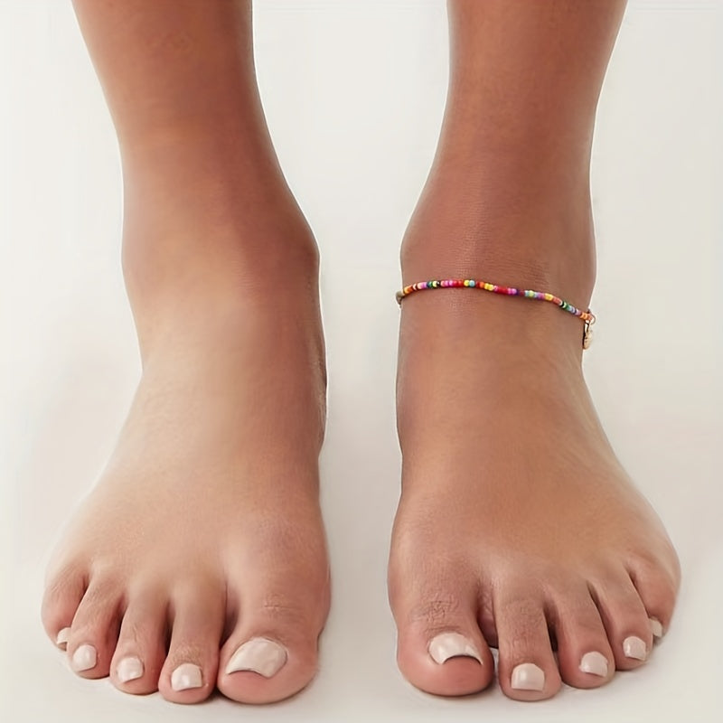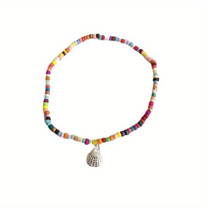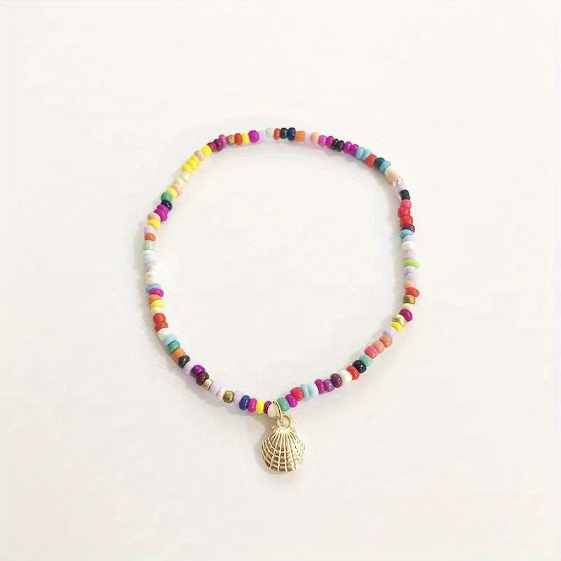 Add a touch of coastal charm to your summer look with this colorful beaded shell anklet. Perfect for beach holidays and adding a pop of color to your outfit.