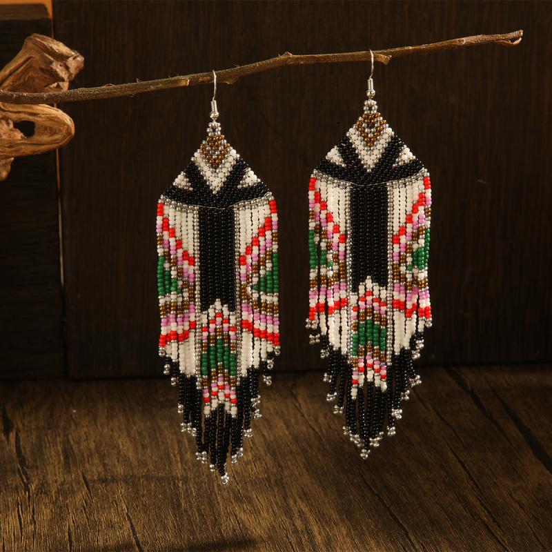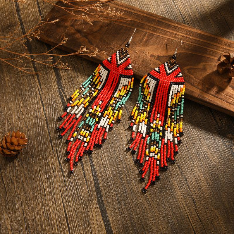 These large, boho-inspired earrings feature a colorful beaded fringe design with tribal seed beads, perfect for adding a pop of color to any outfit.