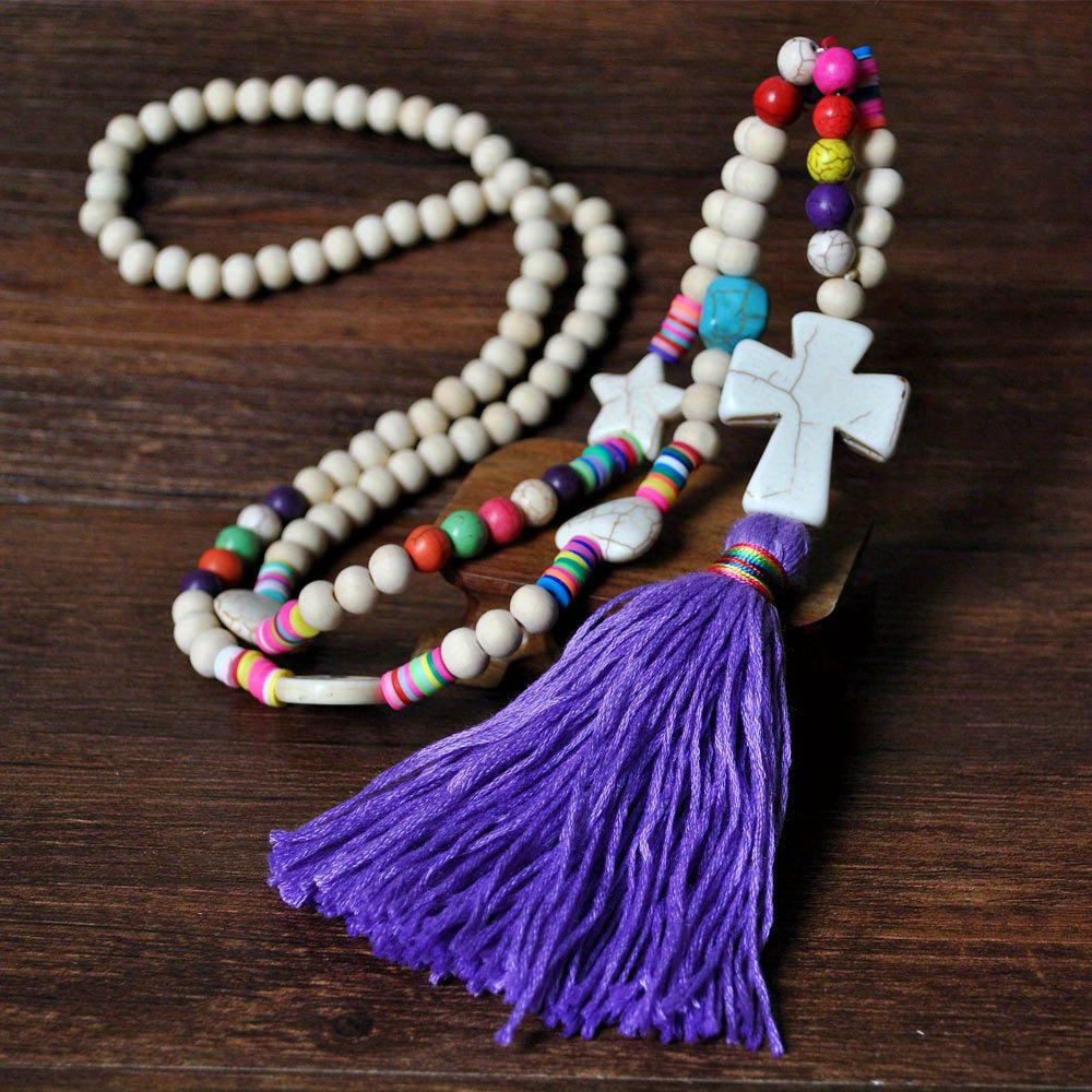 Add a touch of bohemian flair to your summer outfits with this colorful beaded tassel necklace. The stone pendant adds an earthy vibe, perfect for holiday wear.