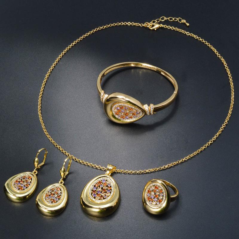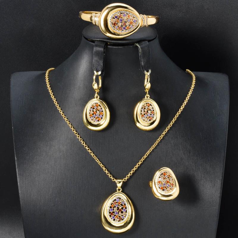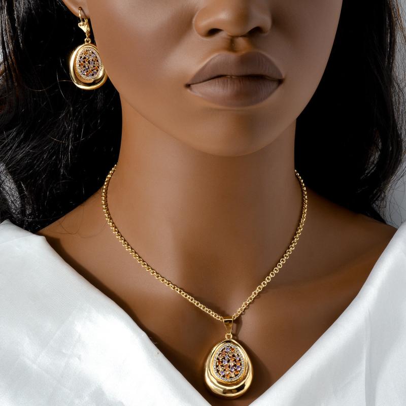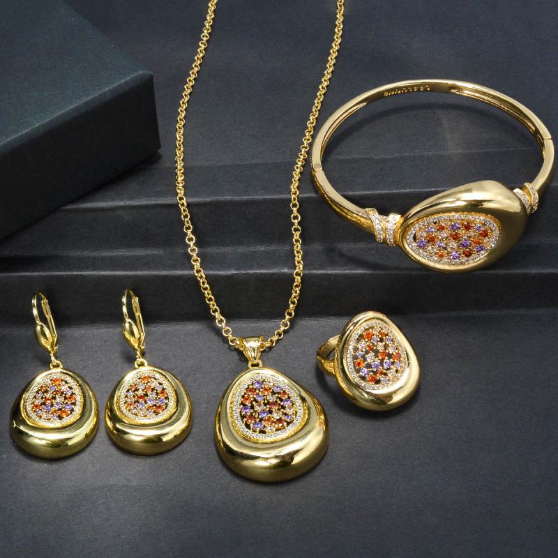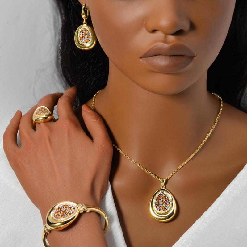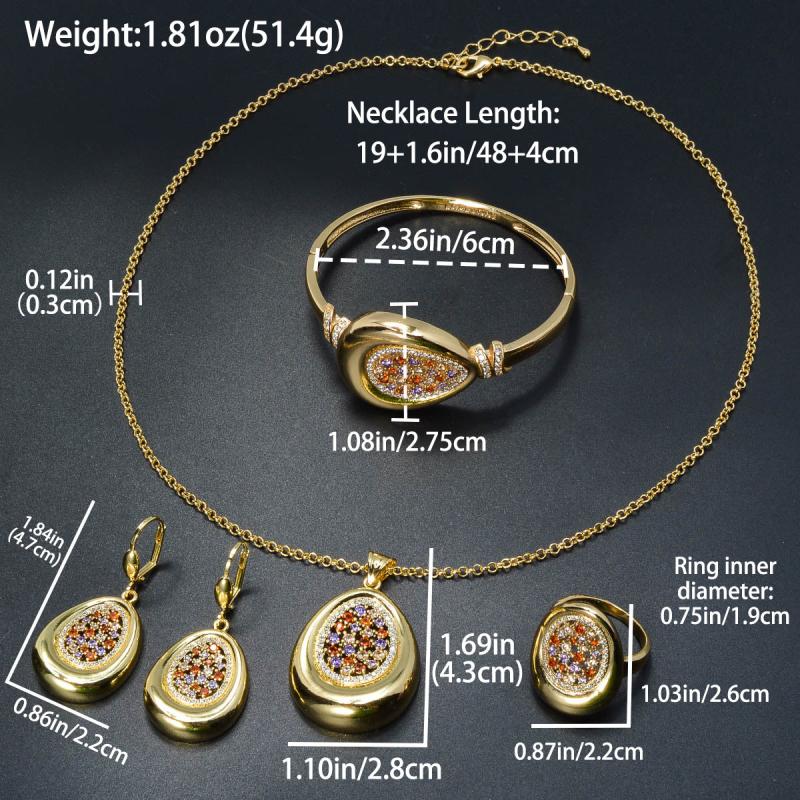Elevate your look with this 5-piece set of retro-inspired Zirconia jewelry, including a pendant necklace, bracelet, ring, and earrings. The inlaid colorful gems add a touch of bohemian style perfect for any occasion.