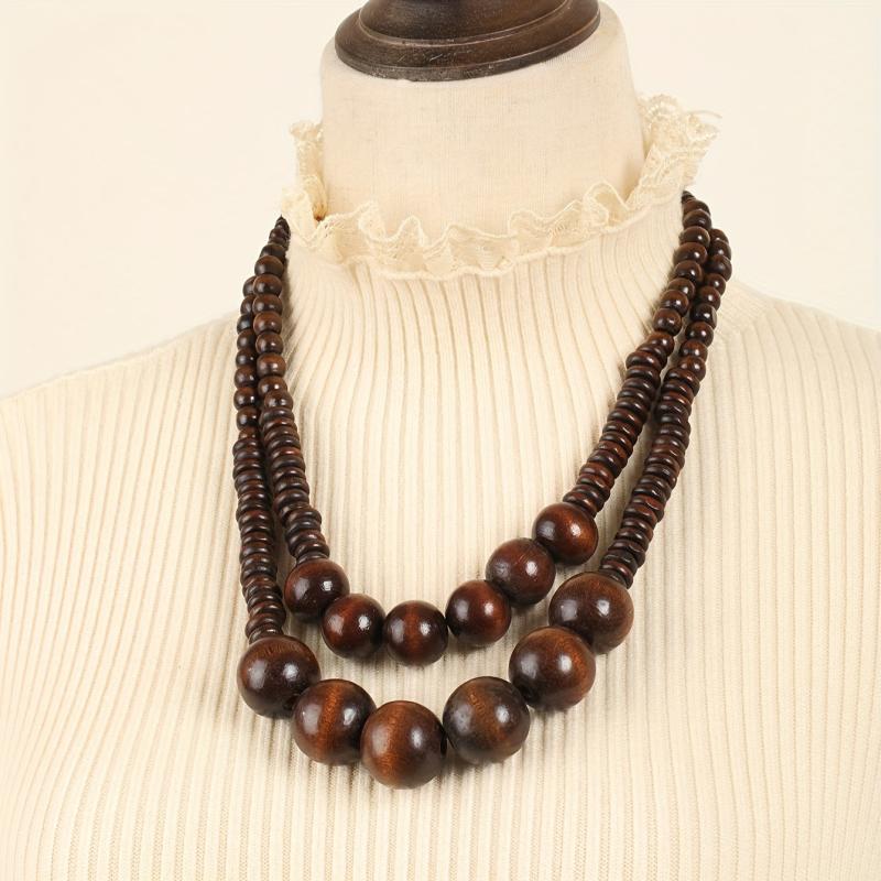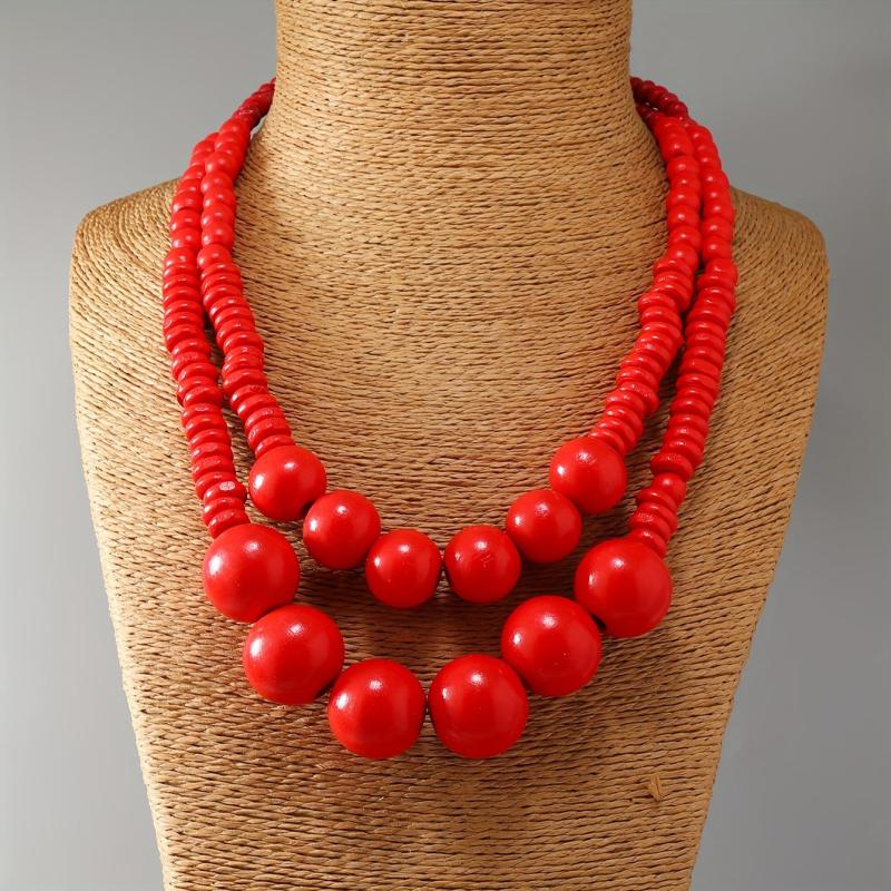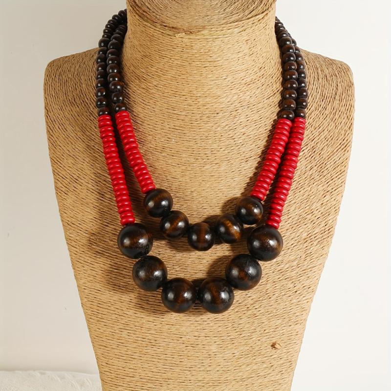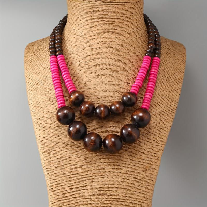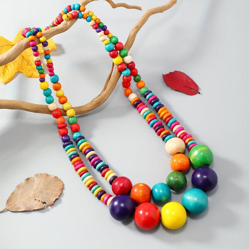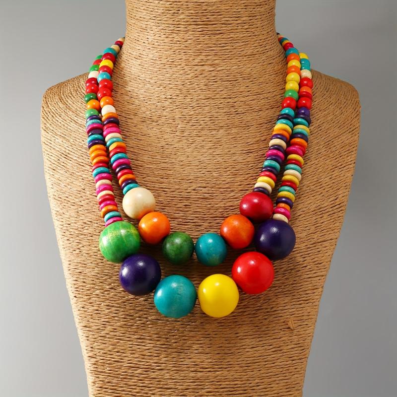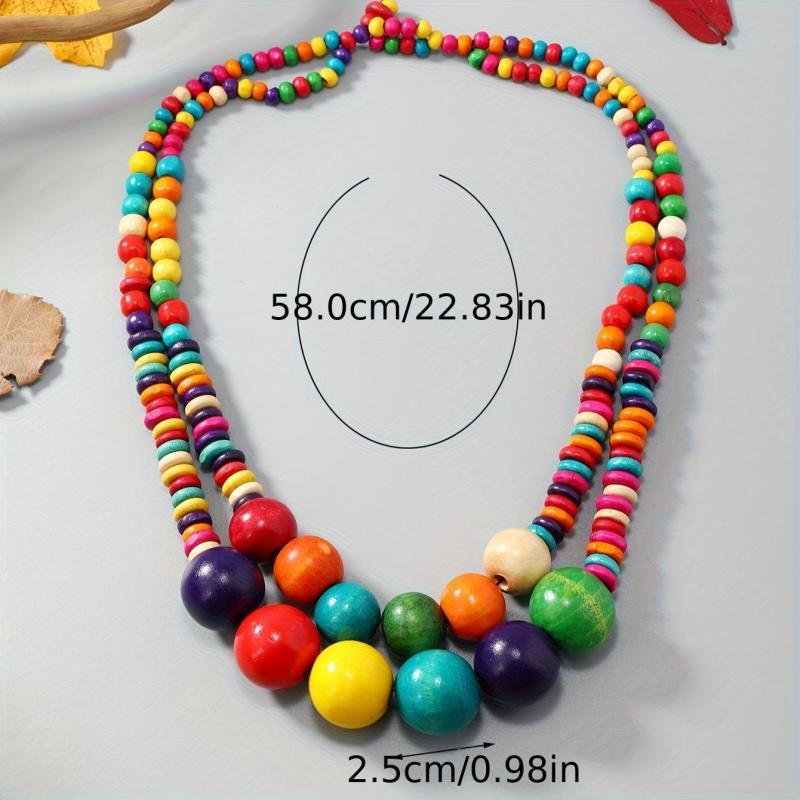 This double layer bohemian necklace features vibrant colors with recycled coconut wood beads and a striped pattern. It adds a fun and unique touch to your outfit.
