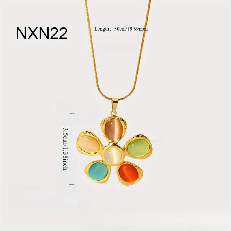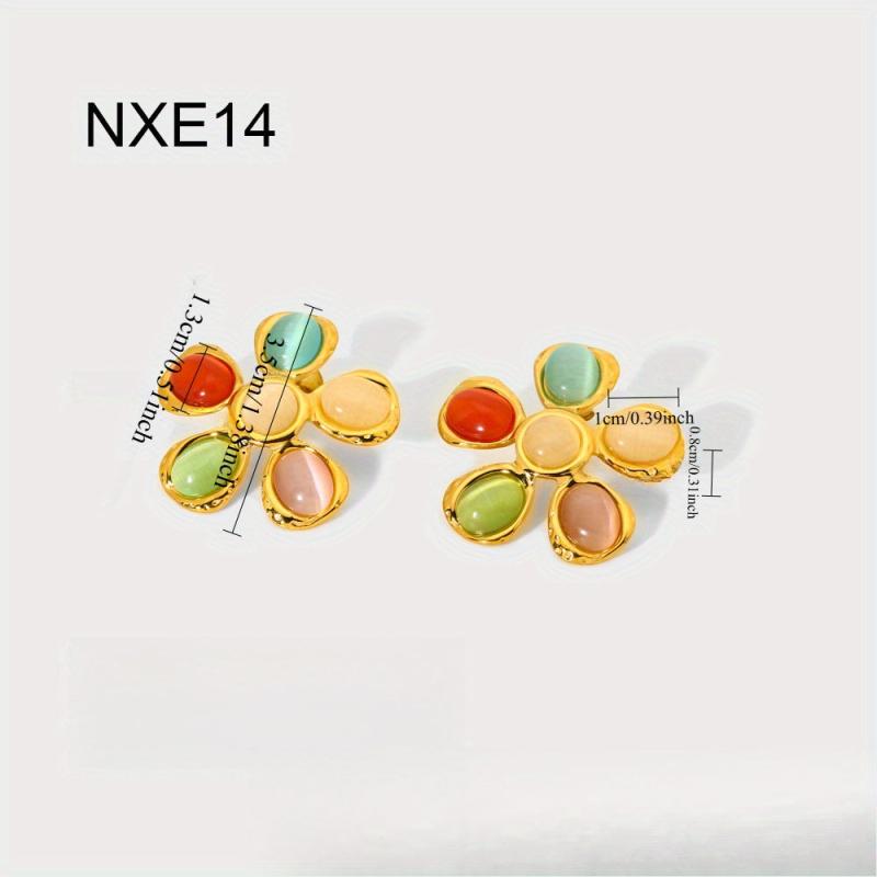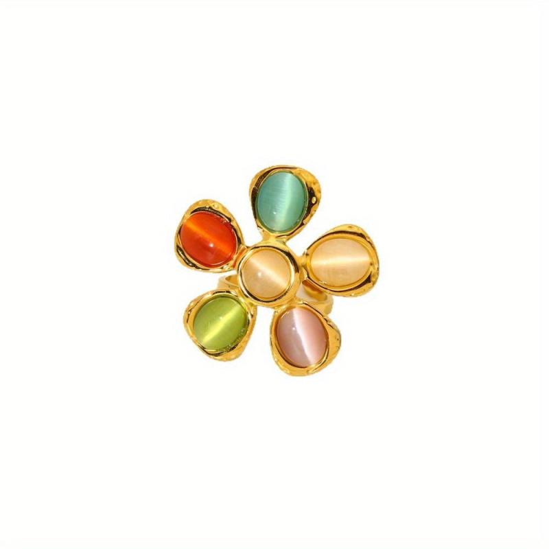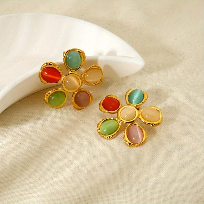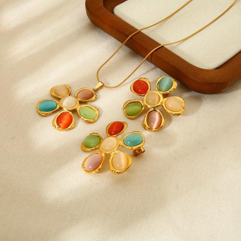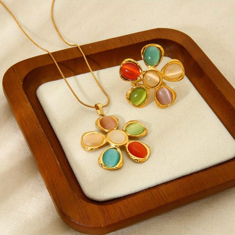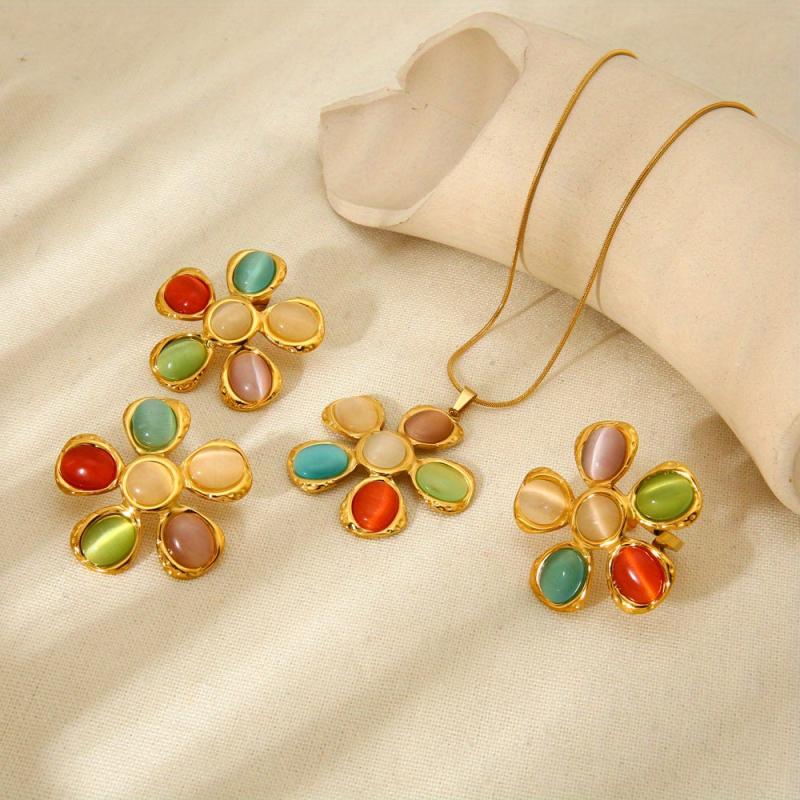 Add a pop of color and style to your outfit with this fashionable set including earrings, ring, and necklace. Featuring colorful cat eye glass, hammered flower design, and plated stainless steel.