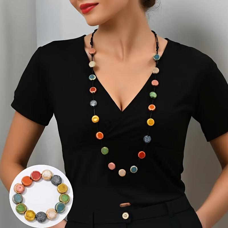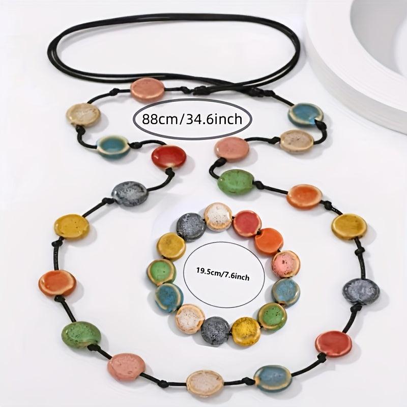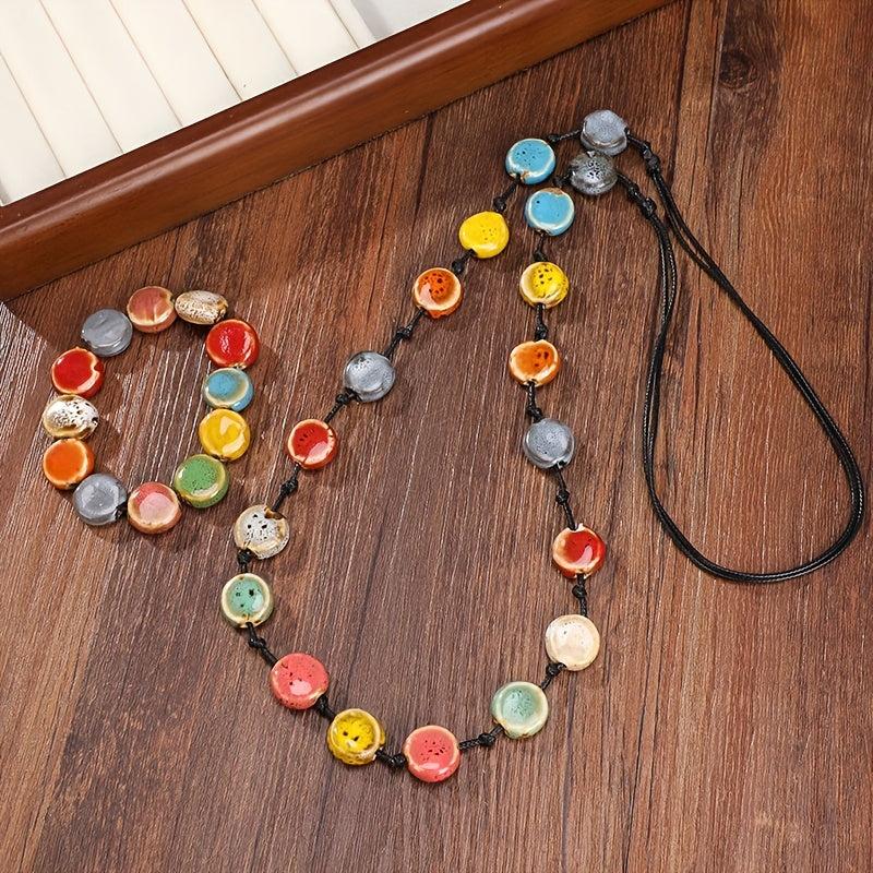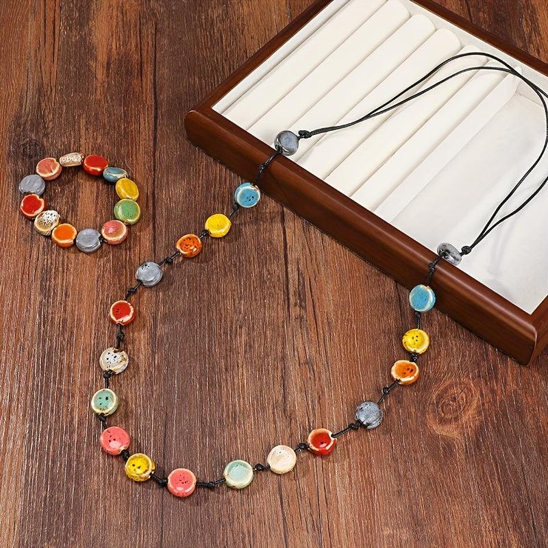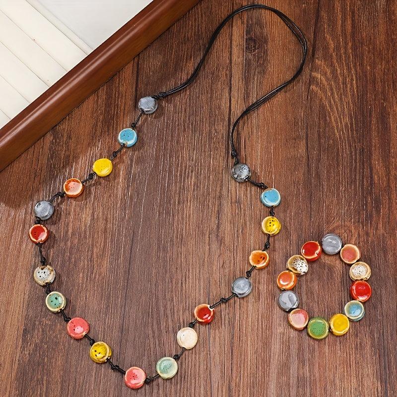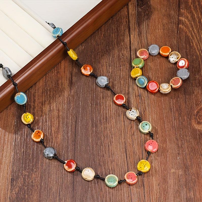 Add a pop of color to your outfit with this vibrant ceramic necklace and bracelet set. Perfect for parties or casual wear, these colorful bead designs are sure to make a statement.