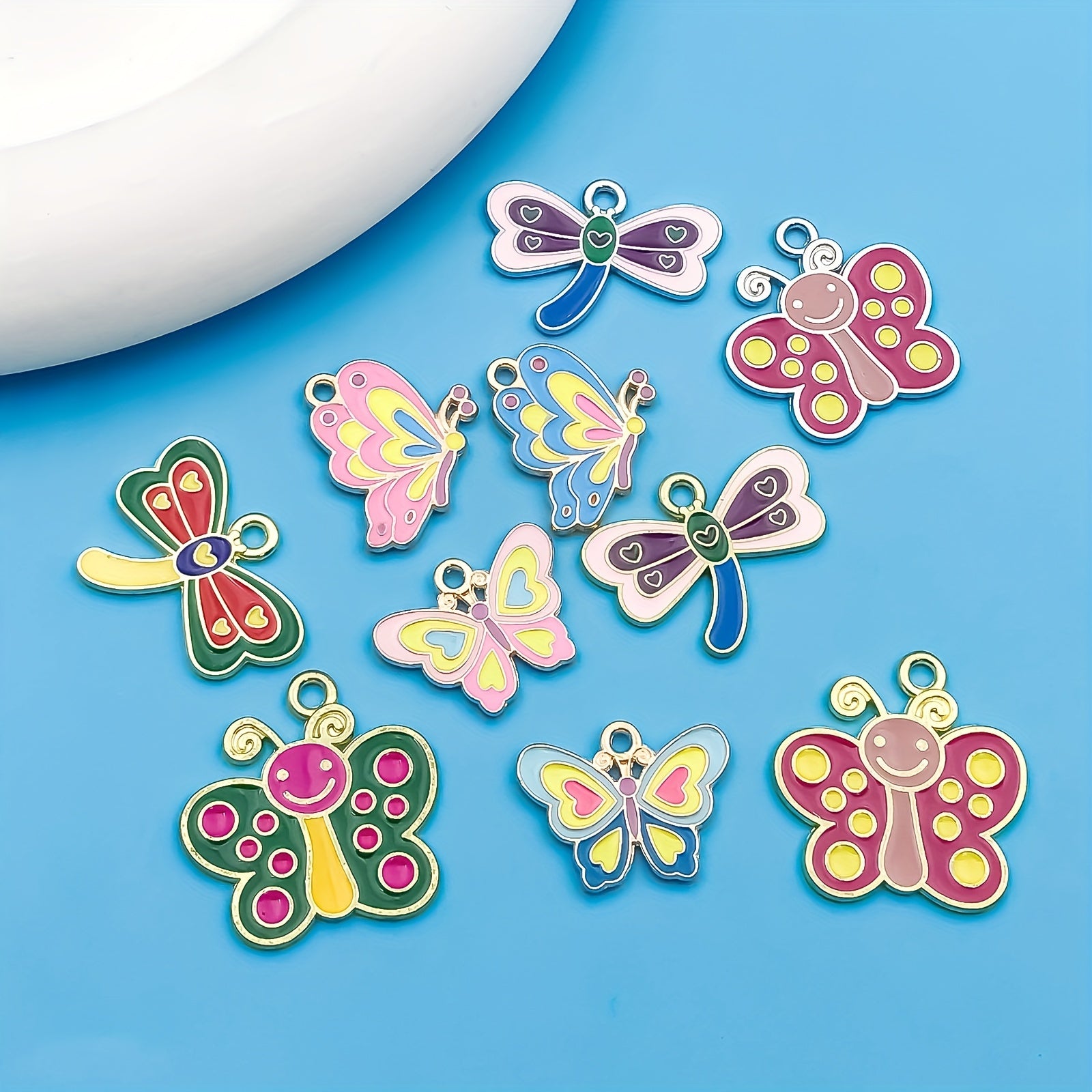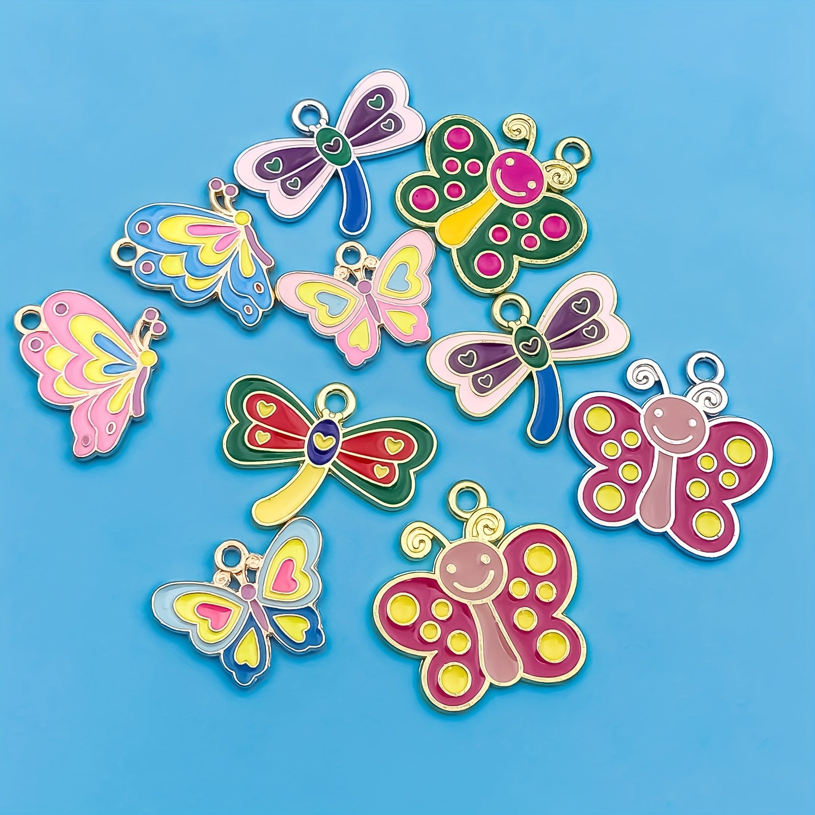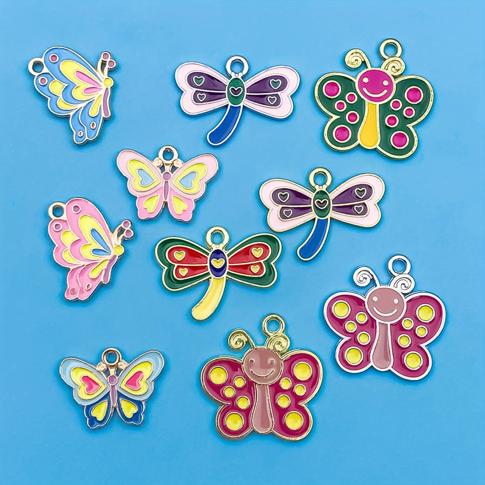 This set includes 10 small pendants in assorted dragonfly and butterfly designs, perfect for adding a pop of color to your jewelry creations. Each pendant is made of high-quality alloy with enamel detailing.