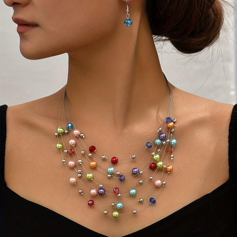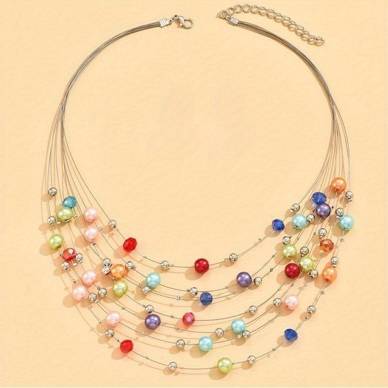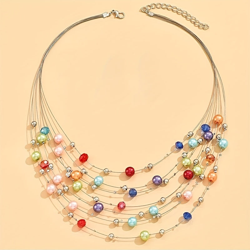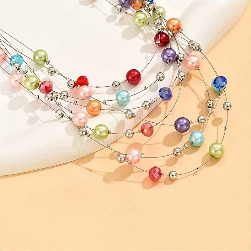 Enhance your holiday look with this stylish Bohemian multilayer necklace featuring colorful faux pearls and crystal beads. Perfect for adding an ethnic touch to your outfit.