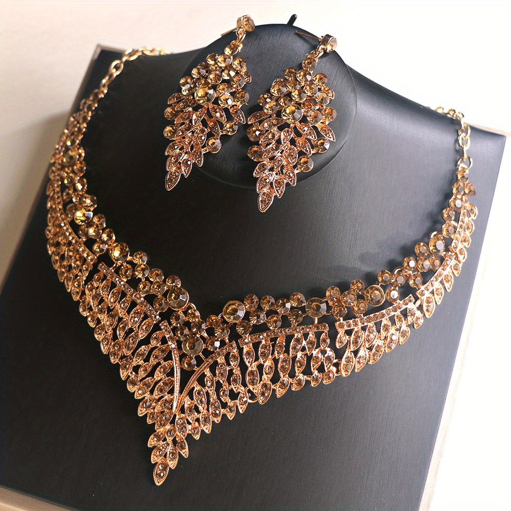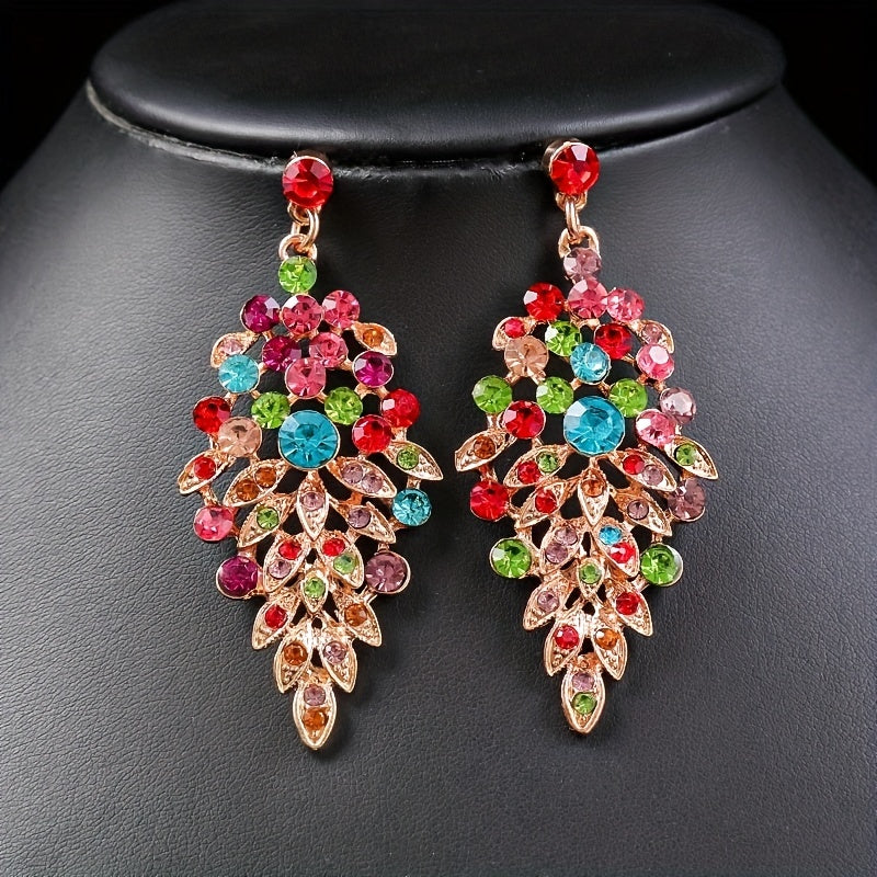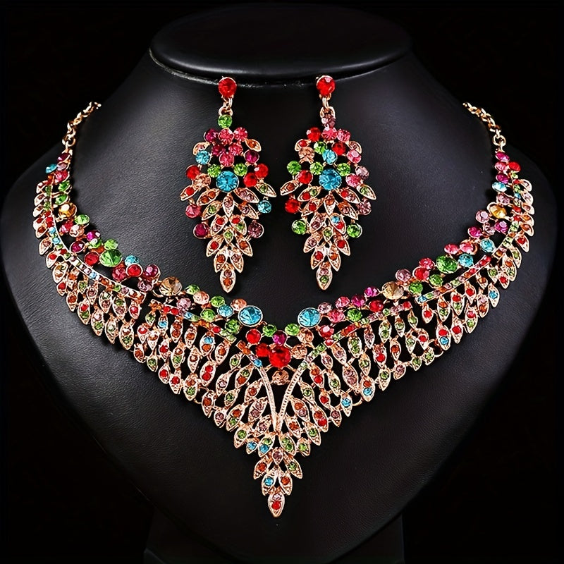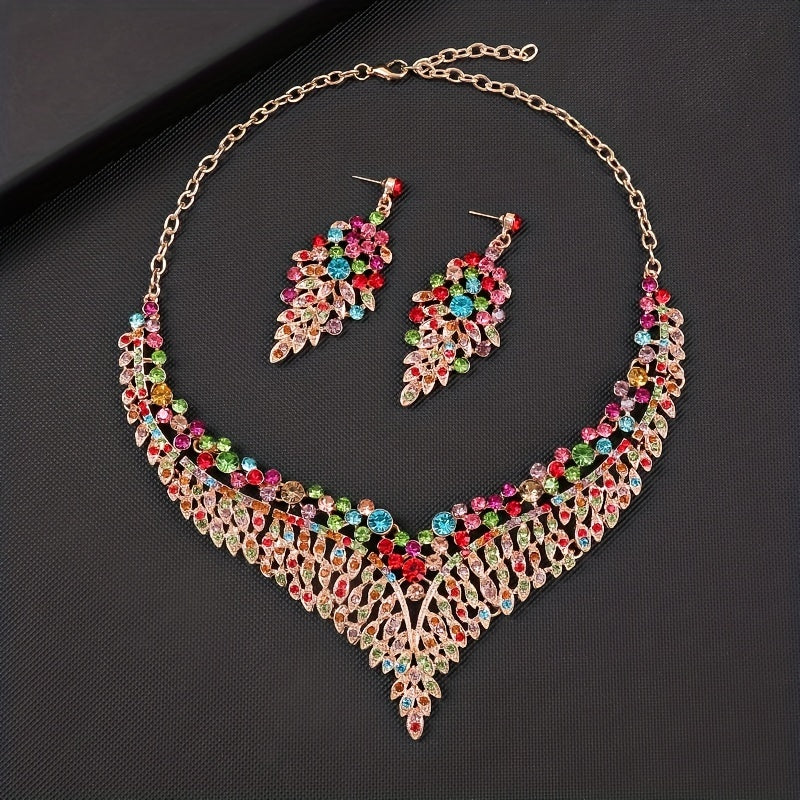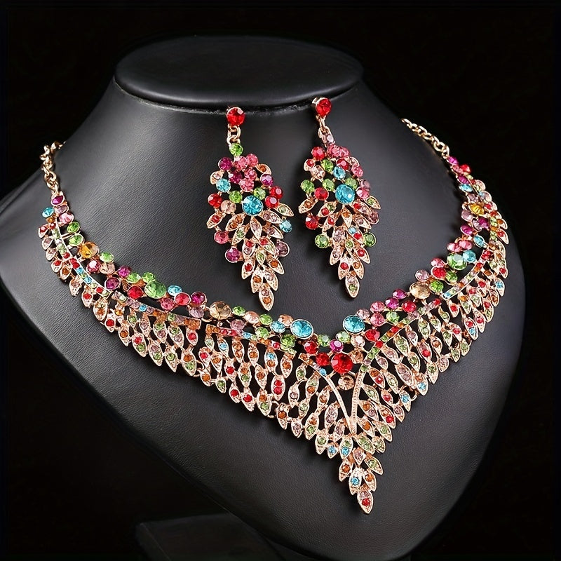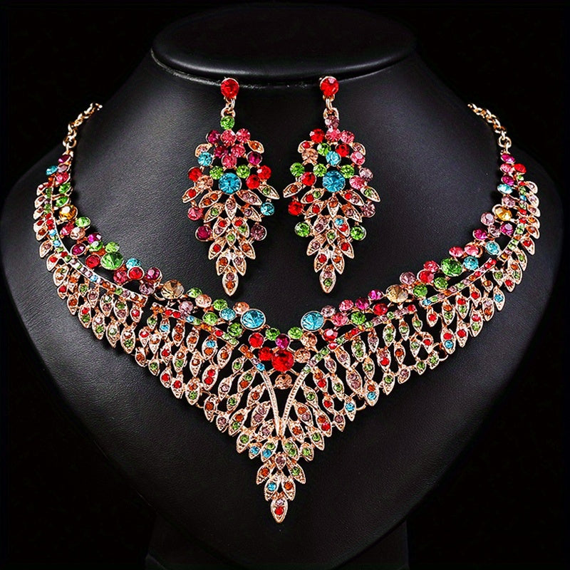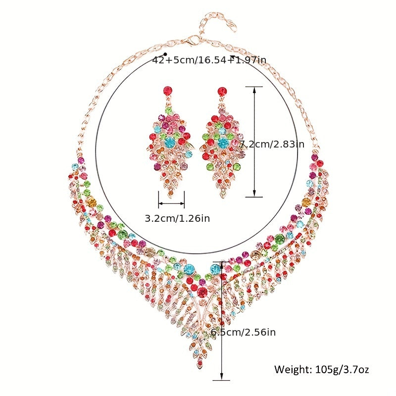 Make a bold statement with this retro colorful flower crystal chunky necklace and earrings set. Perfect for bridal, wedding, or party wear.
