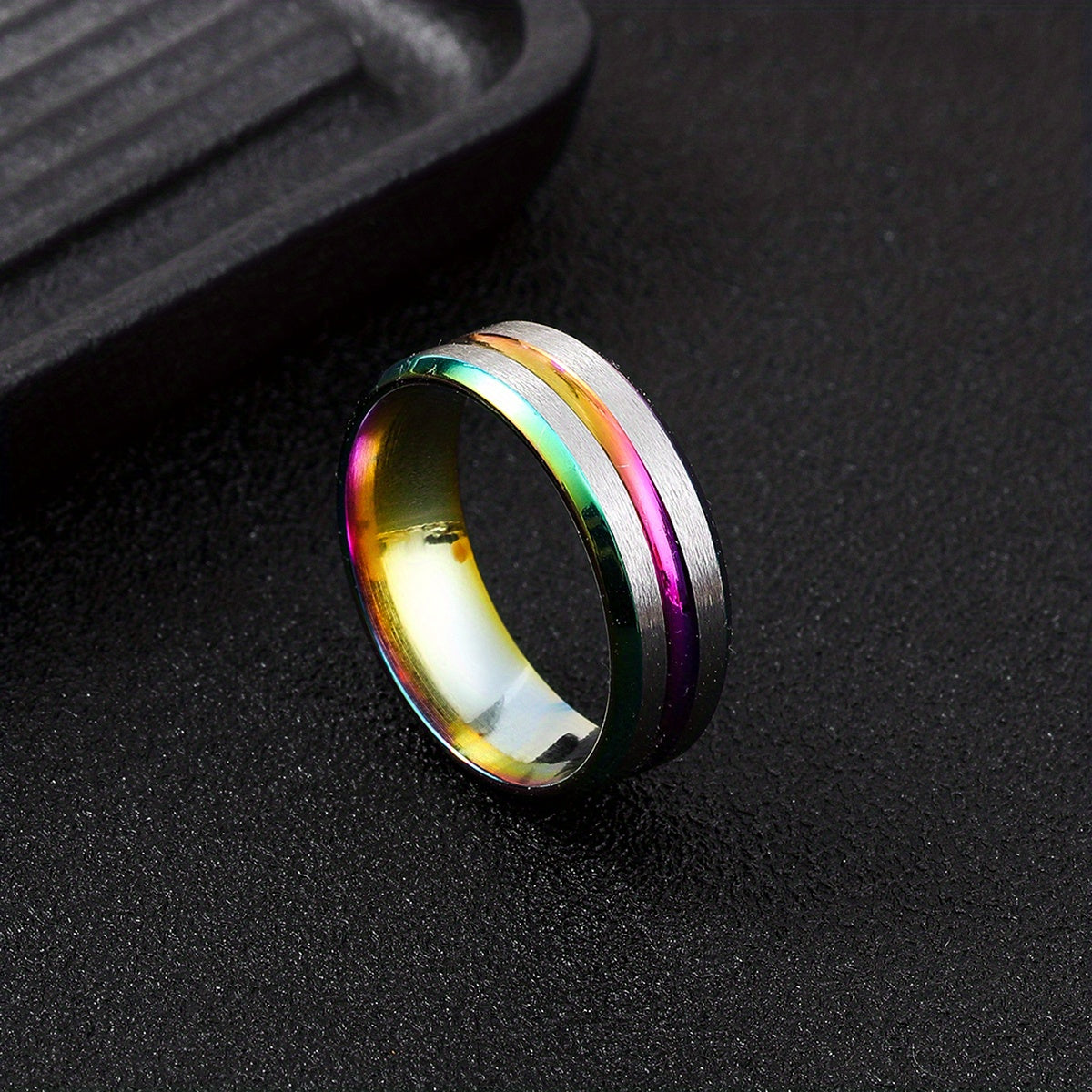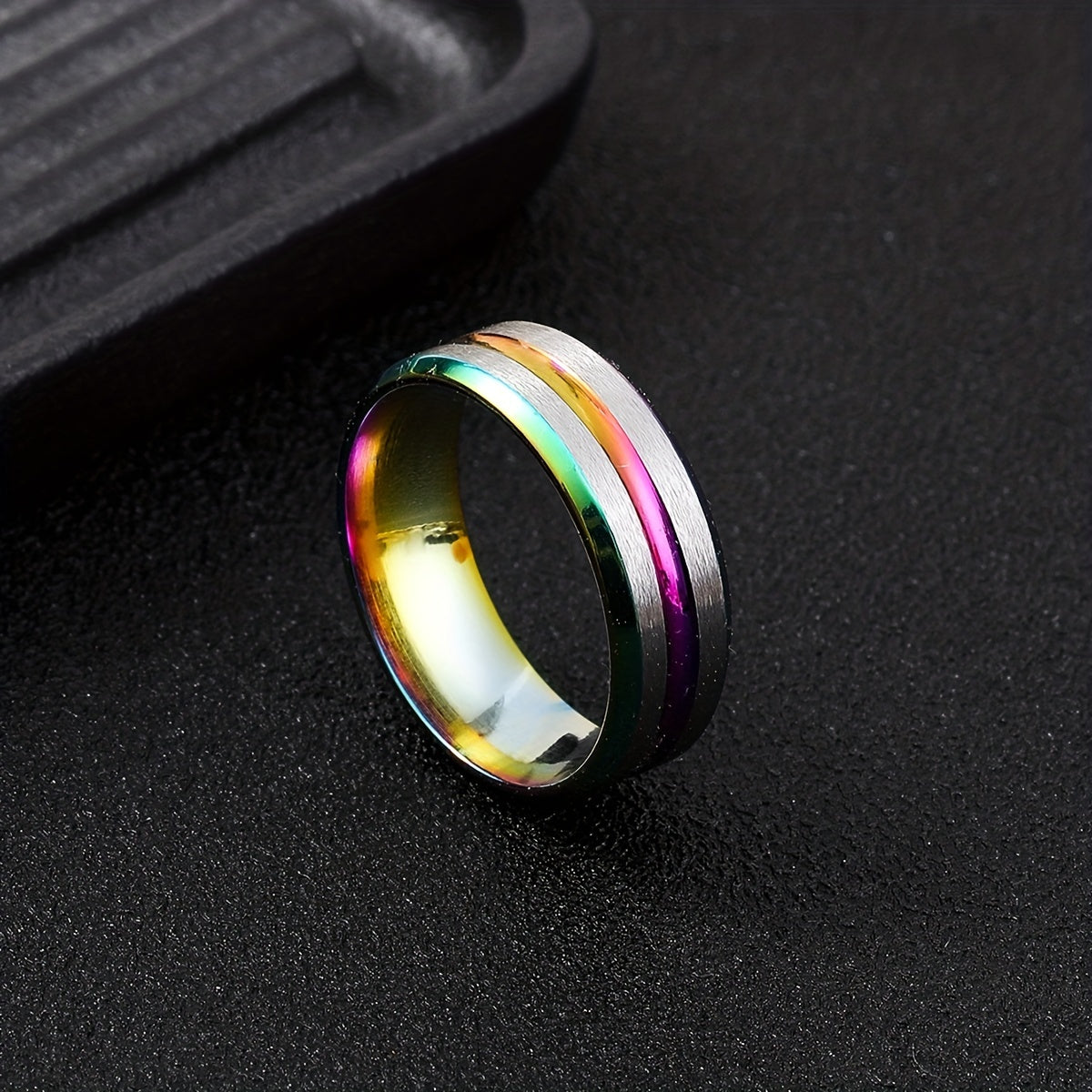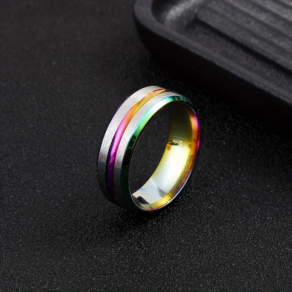 Add a pop of color and style to your look with this stainless steel ring featuring vibrant grooves.