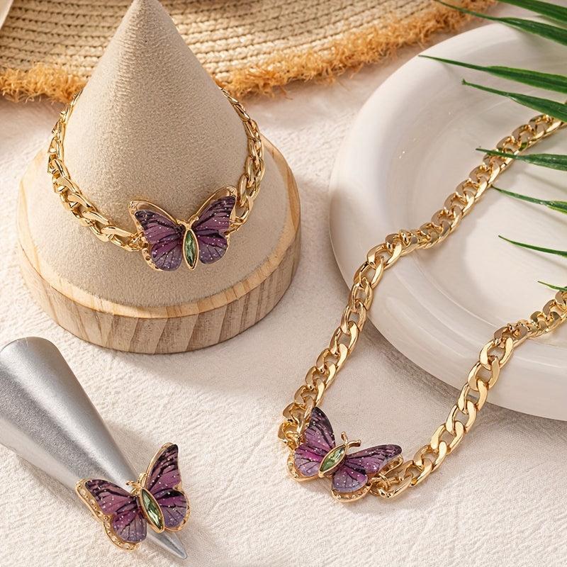 Accessorize with this three-piece set featuring acrylic butterfly pendant on metal chain. Lightweight and perfect for a vacation. Set includes necklace, bracelet, and ring.