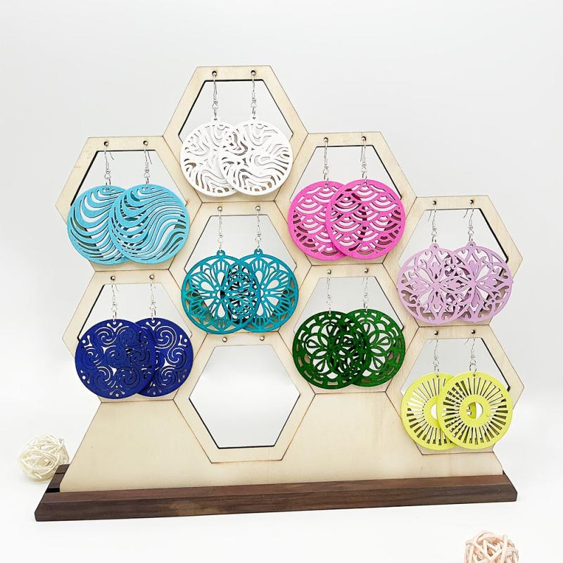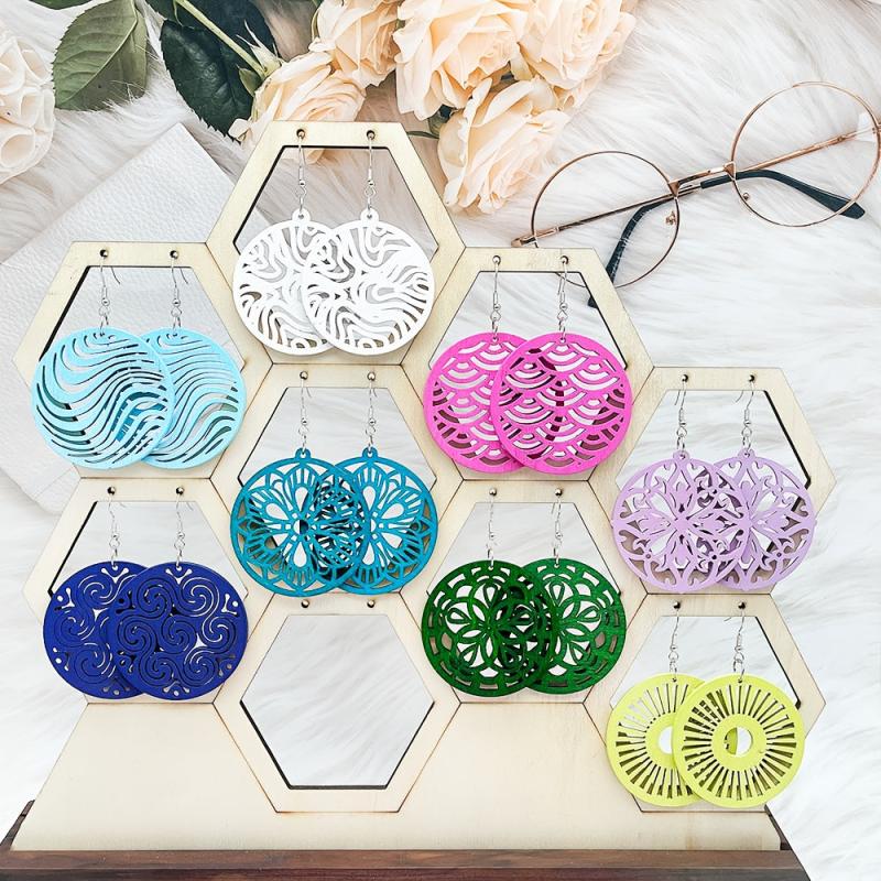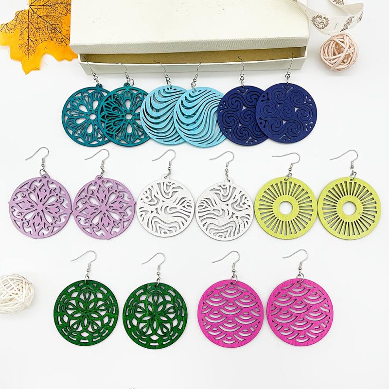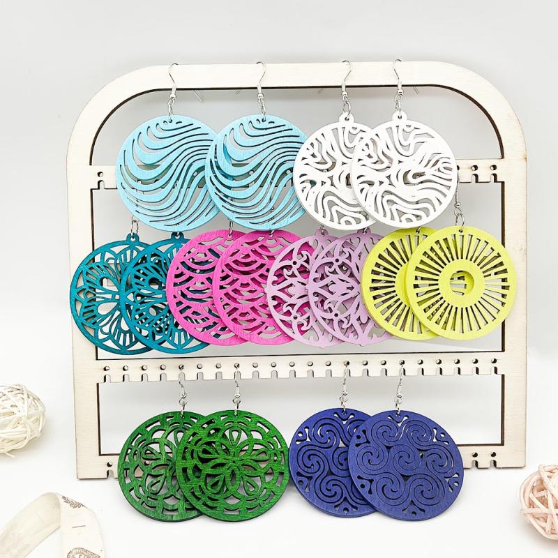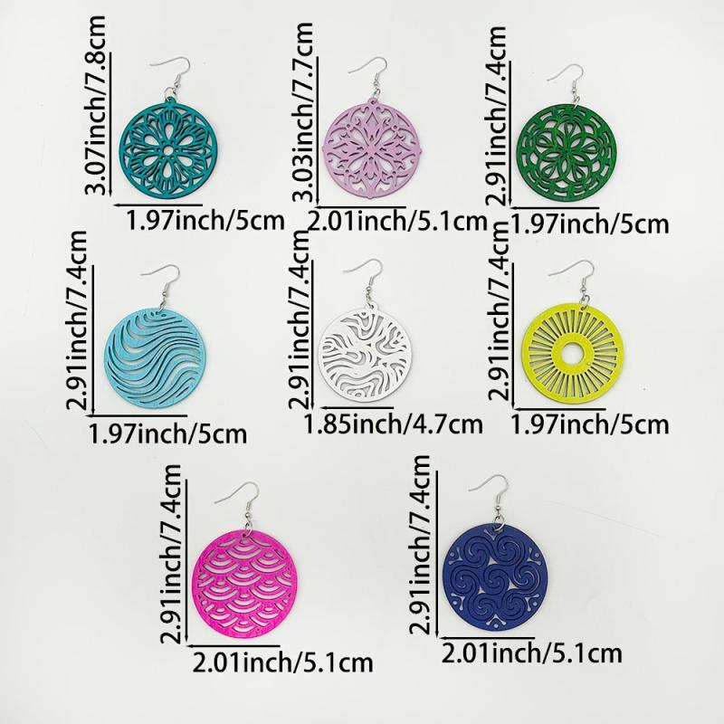 Add a touch of bohemian style to your look with this 8 pair set of colorful hollow wooden pendant earrings. These earrings are versatile and can be worn with a variety of outfits for a fashionable daily accessory.