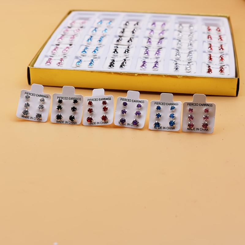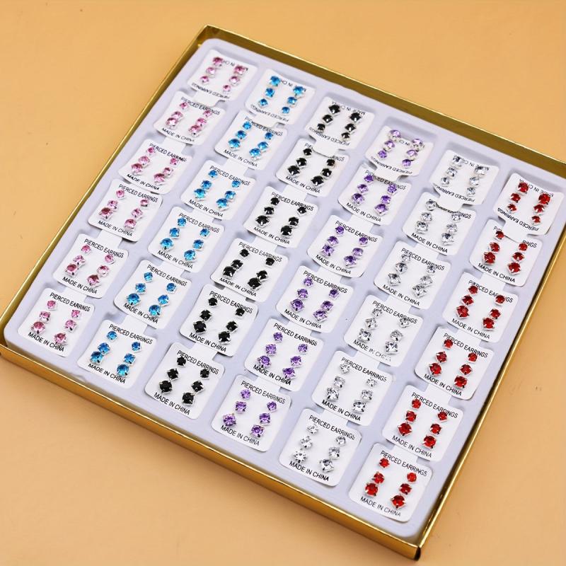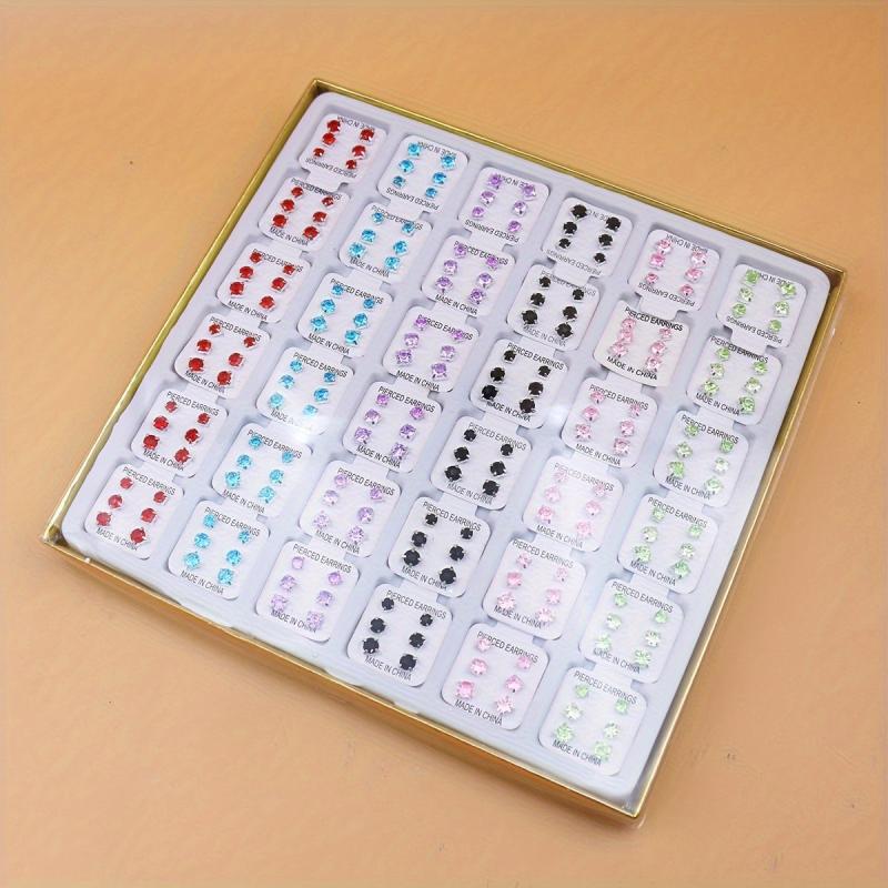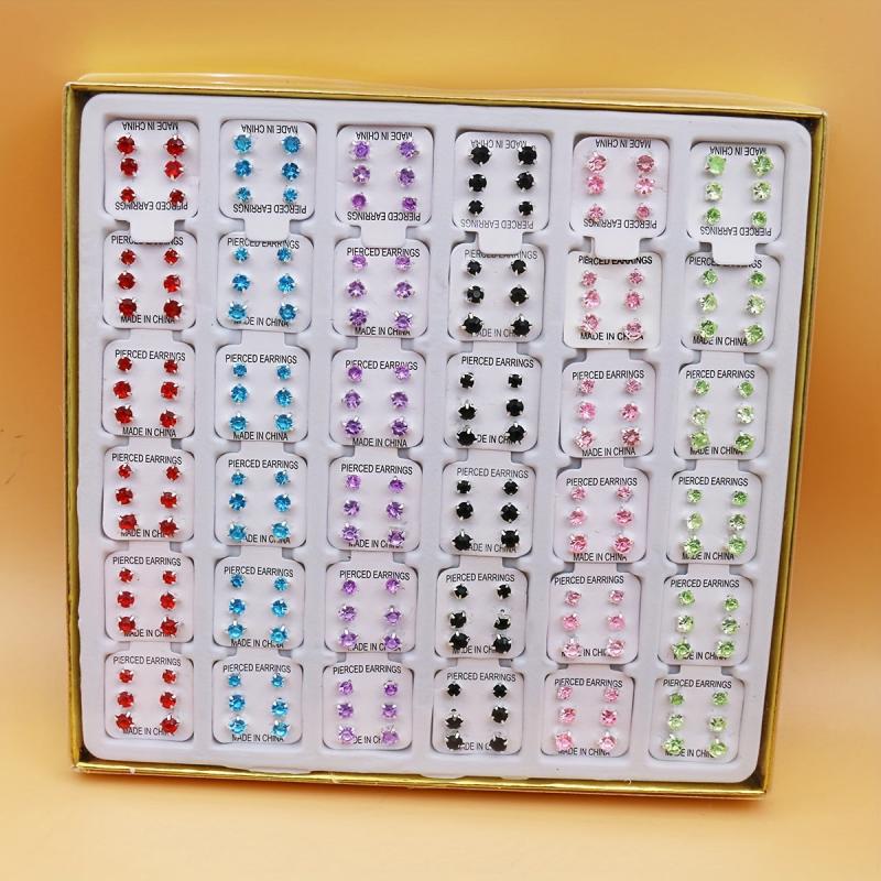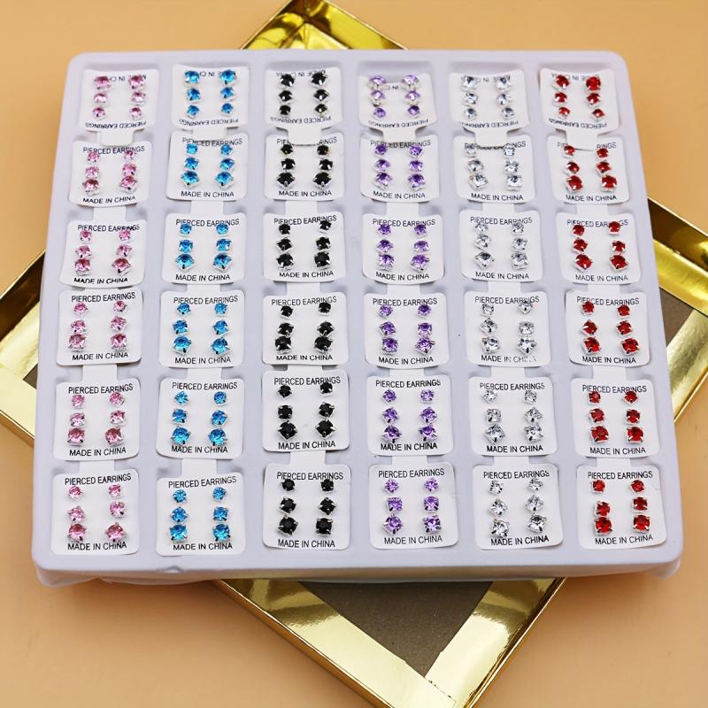 This set includes 108 pairs of colorful rhinestone earrings with four-prong clips. The rhinestones come in a variety of sizes and colors for a fun and unique look.