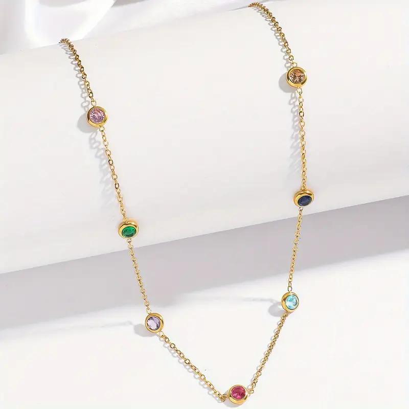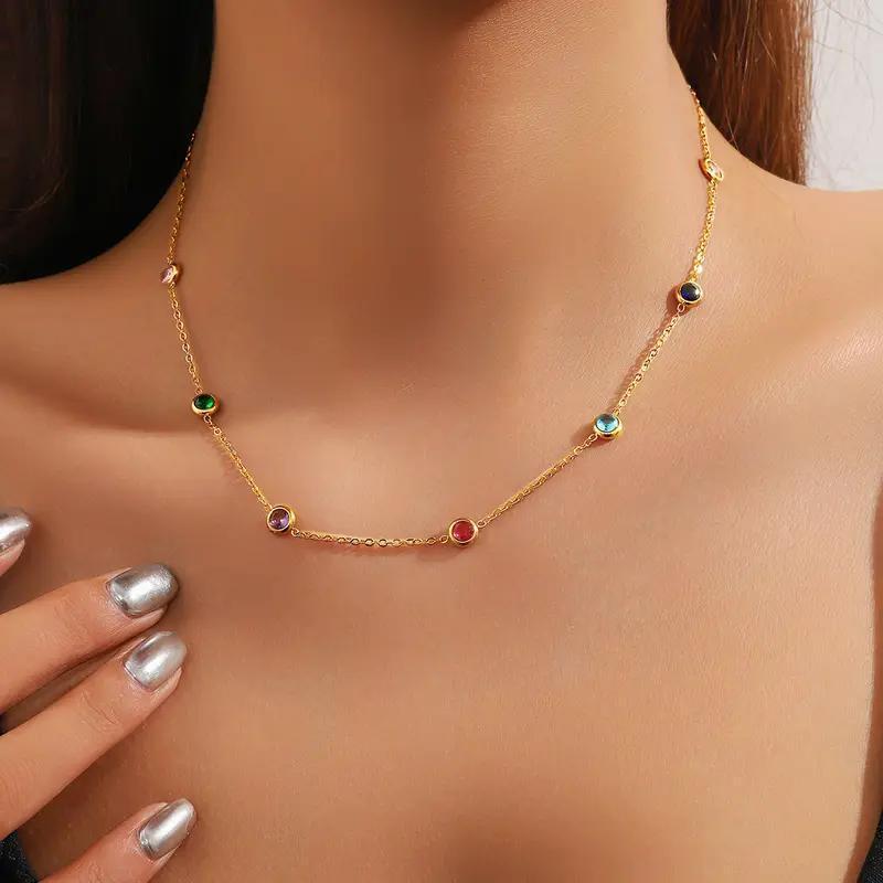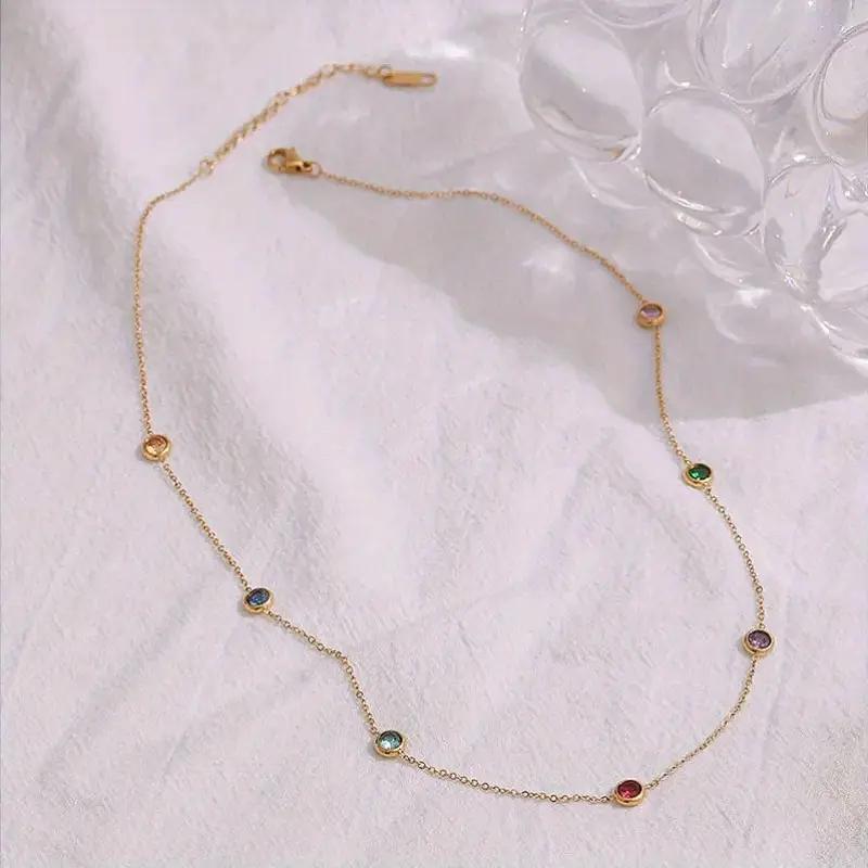 Add a touch of elegance to your outfit with this minimalist stainless steel necklace featuring a colorful rhinestone gemstone pendant. Perfect for casual attire and makes a great Valentine's Day gift.