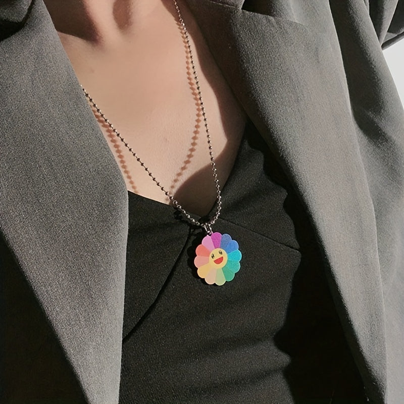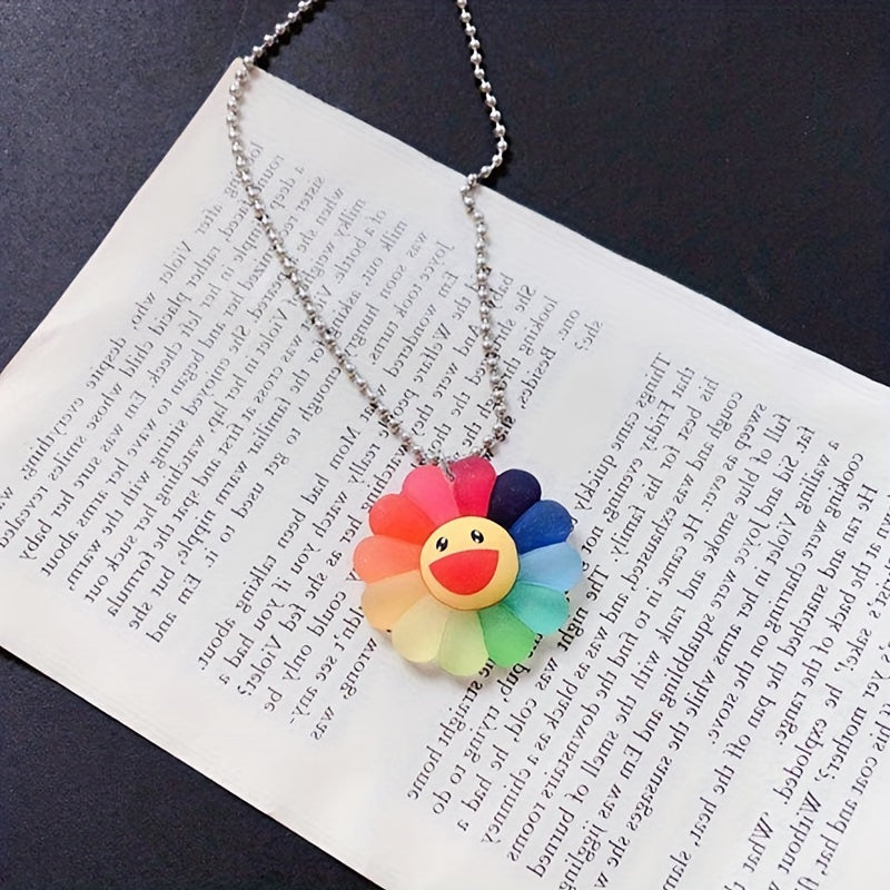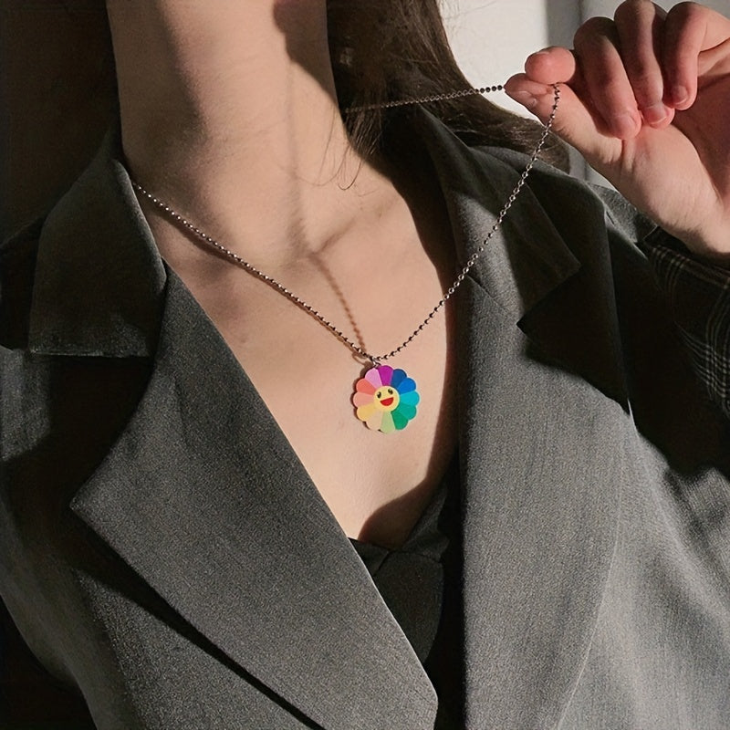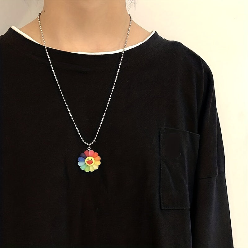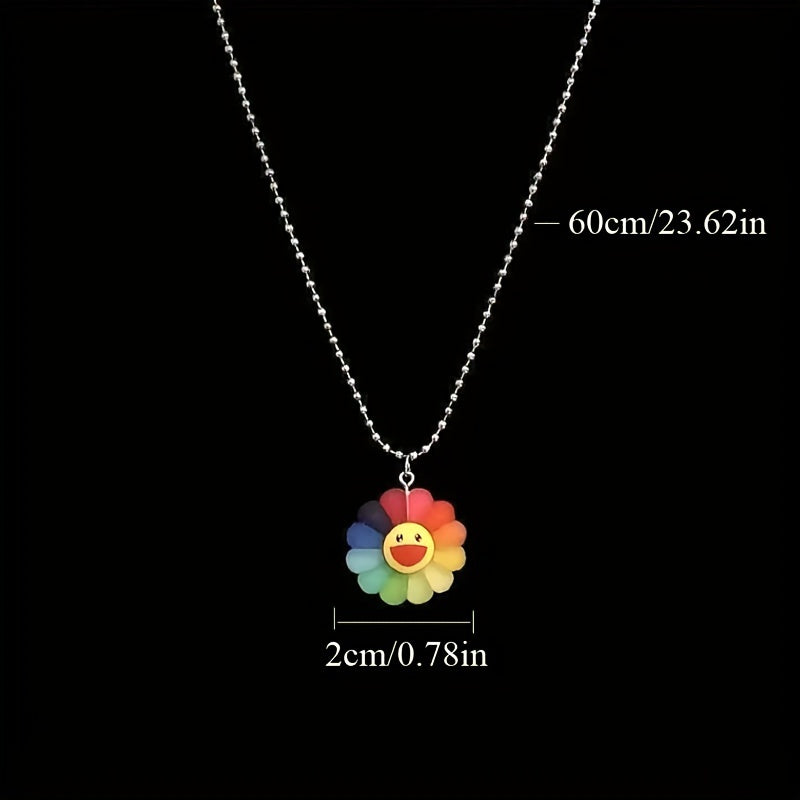 This necklace features a charming design with a colorful sunflower and happy face pendant, suitable for both men and women.