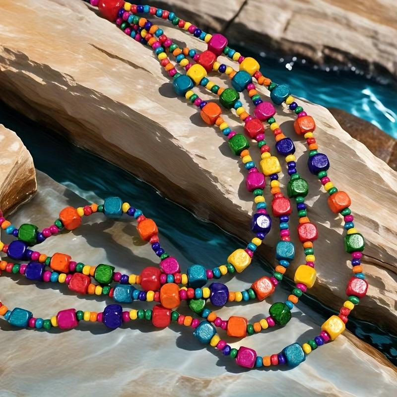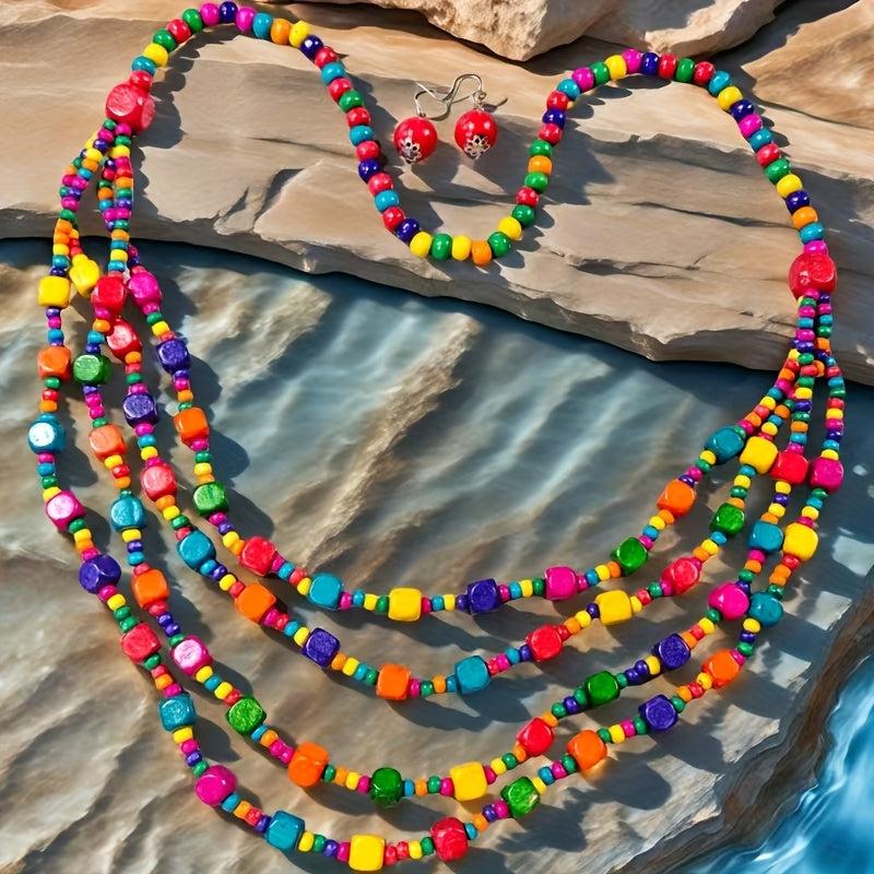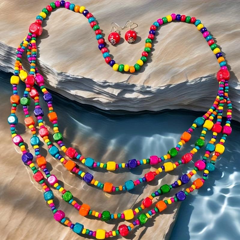 Add a pop of color to your outfit with this stunning Middle Eastern-inspired necklace and earrings set. The small square wooden beads come in a variety of vibrant colors, creating a beautiful bohemian look.