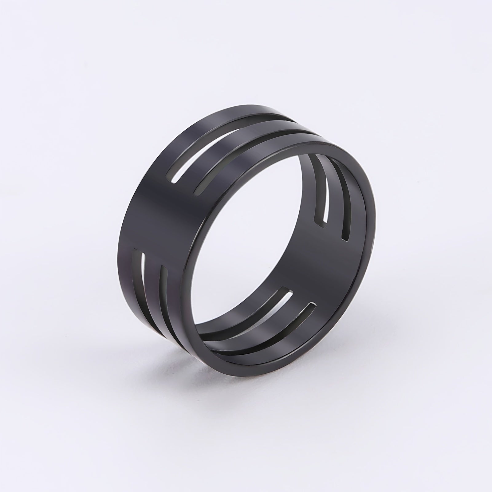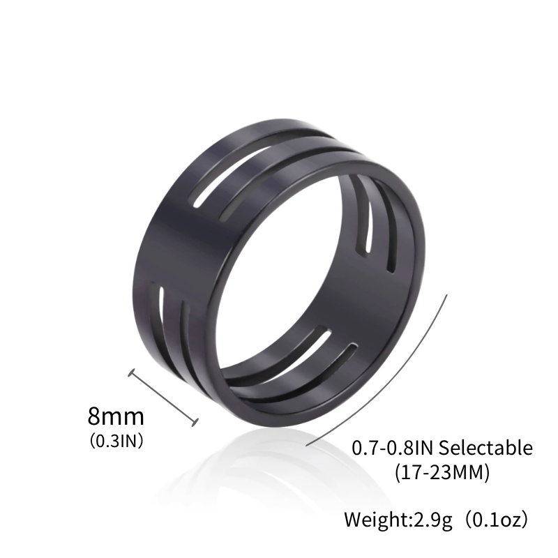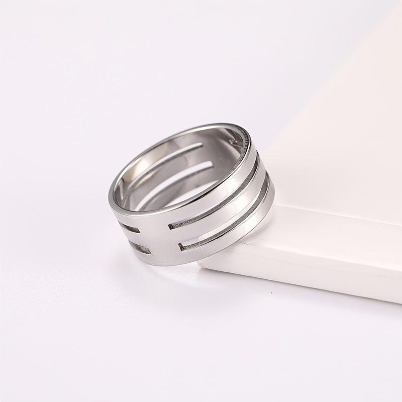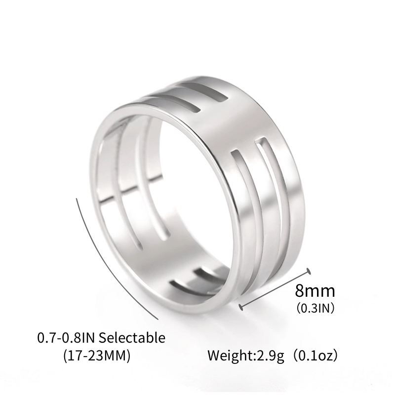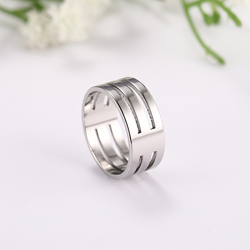 This stainless steel couple ring features two empty three bars design, mirror polished finish, non-fading and non-allergic properties.