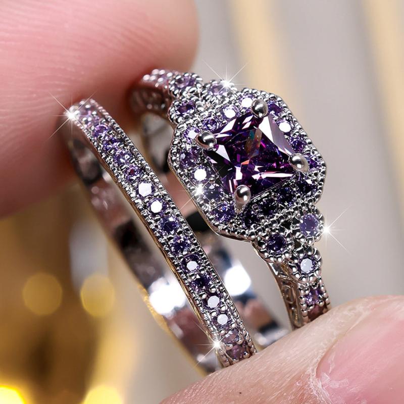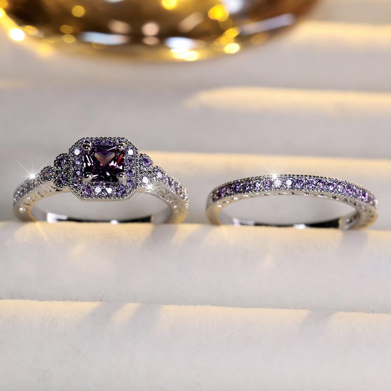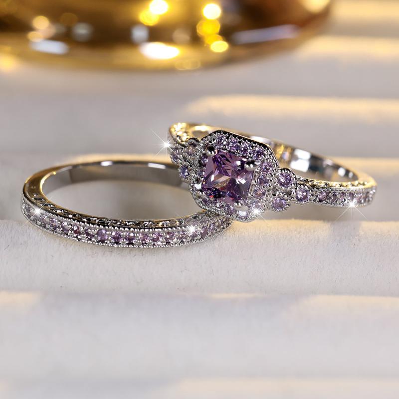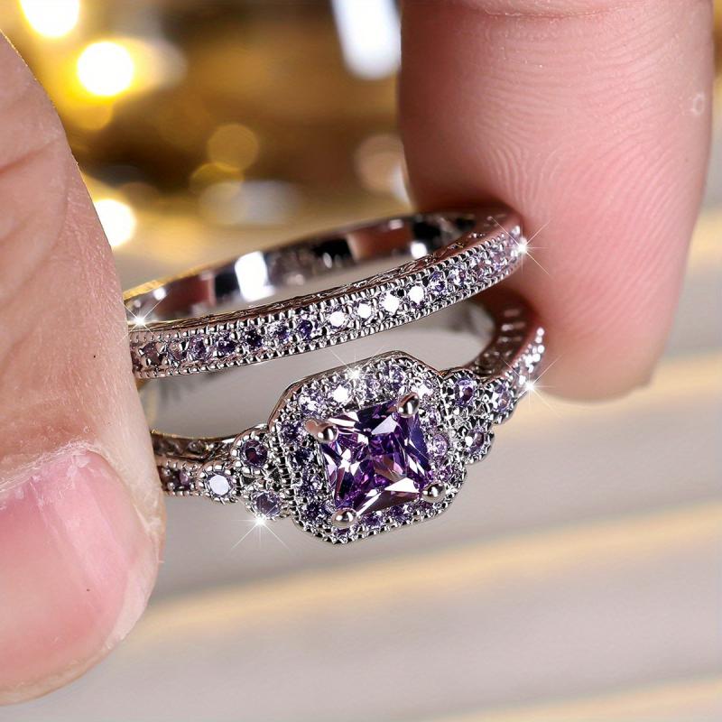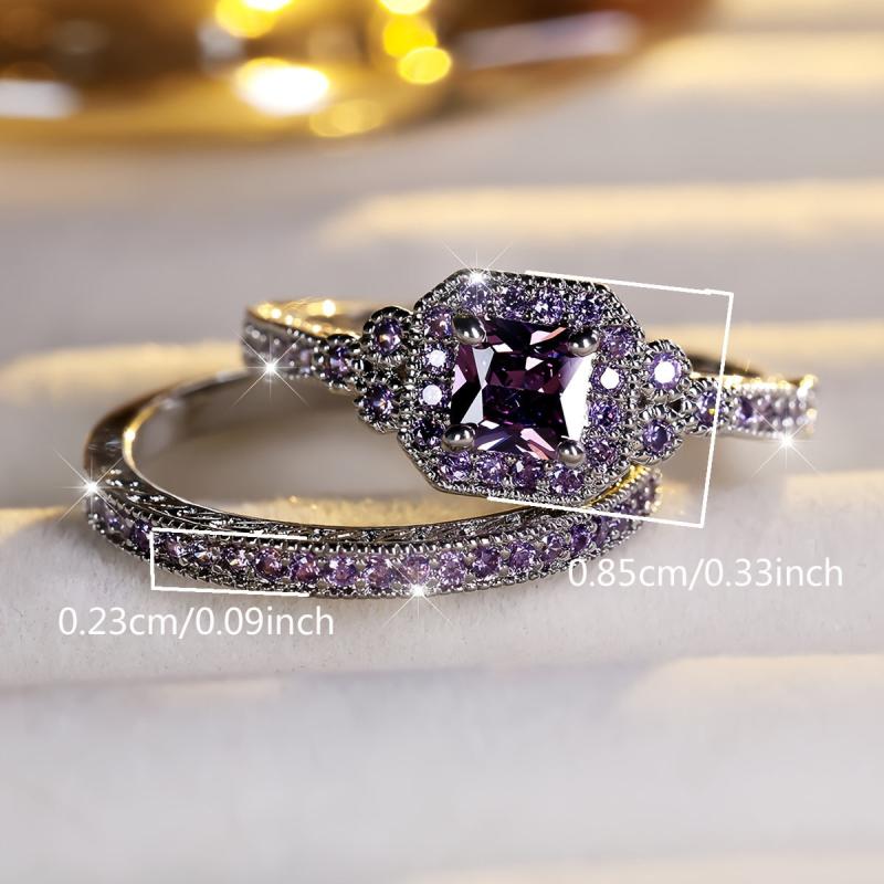 This all season fit ring set features a copper base with synthetic cubic zirconia stones in a glitter style design. Perfect for engagement and wedding.
