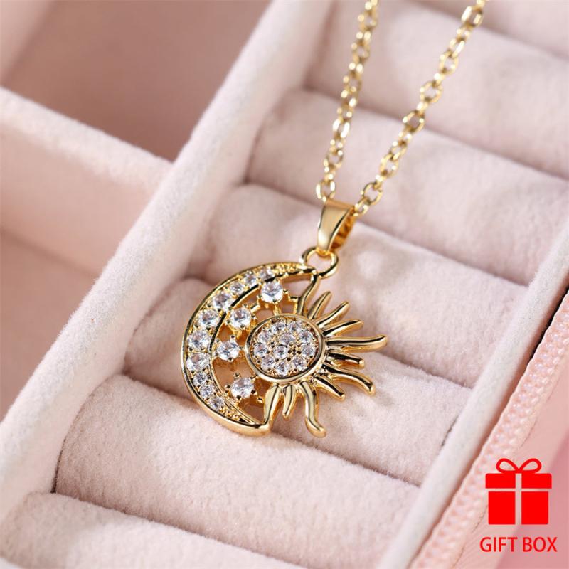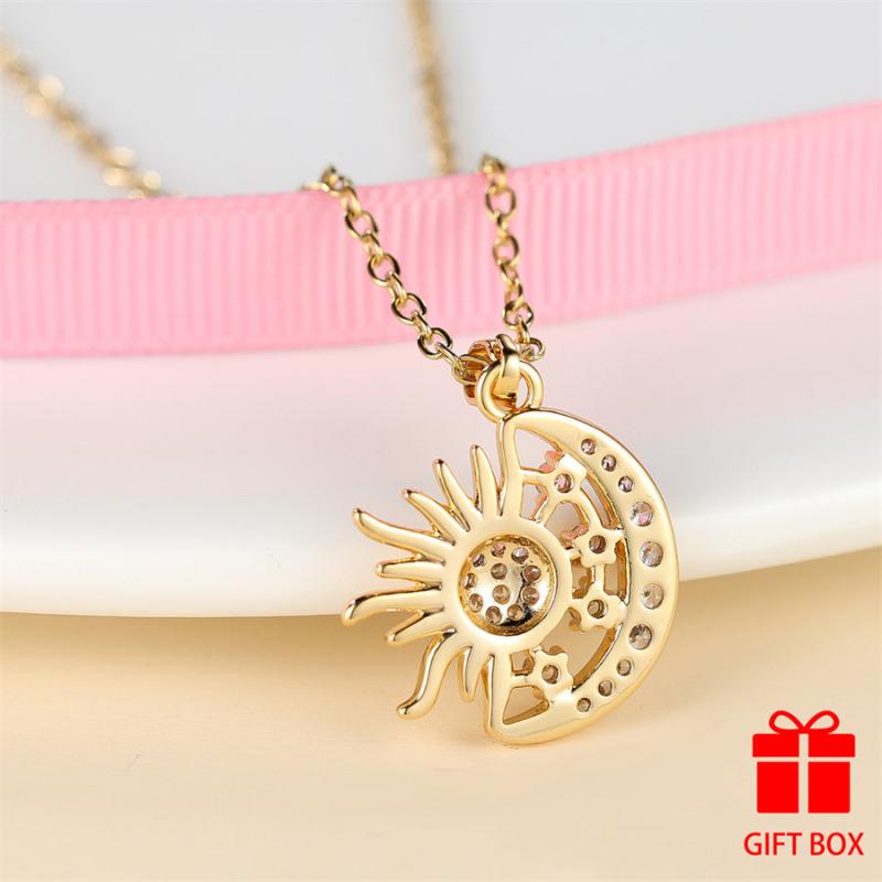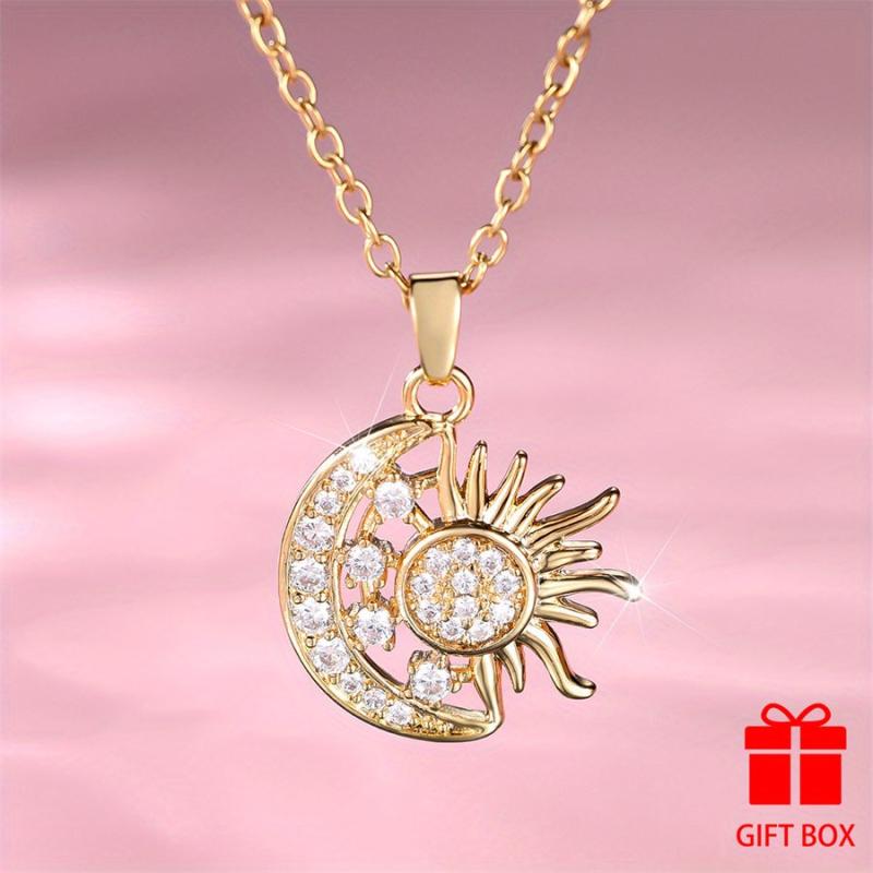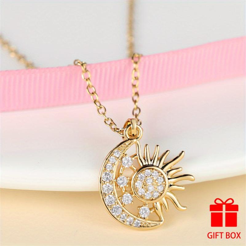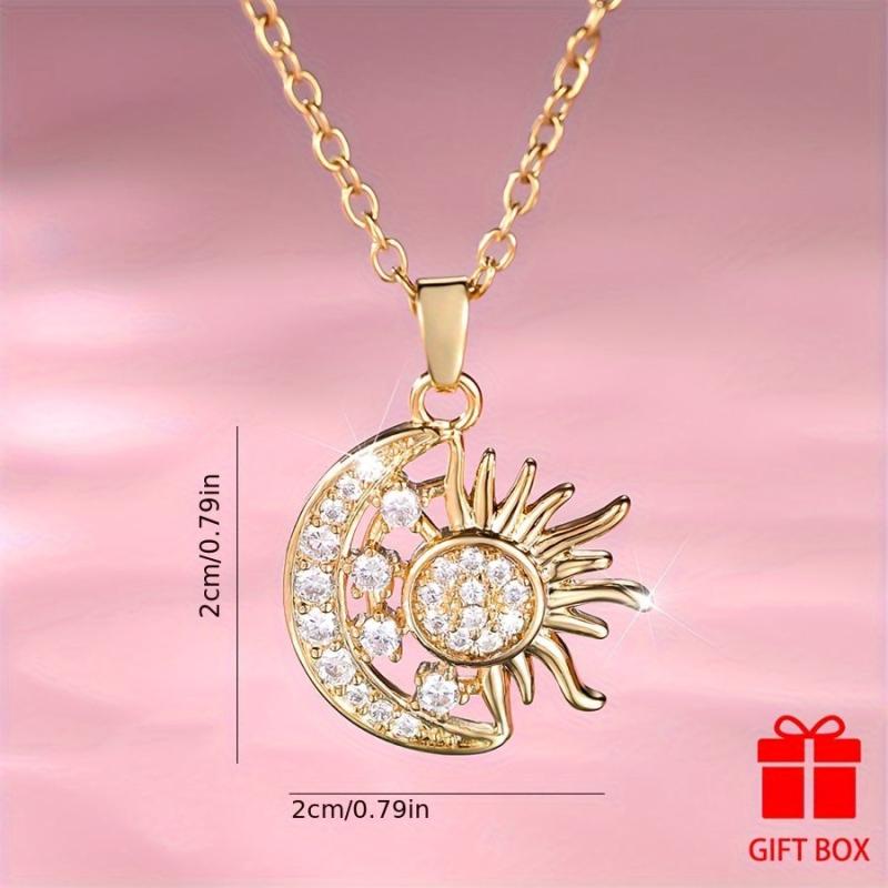 This elegant copper pendant necklace features a synthetic zirconia moon and sun design, making it ideal for daily wear and a perfect Valentine's gift. Suitable for all seasons.