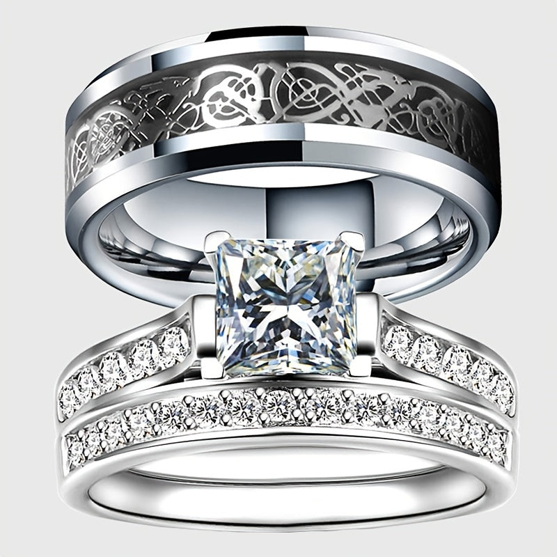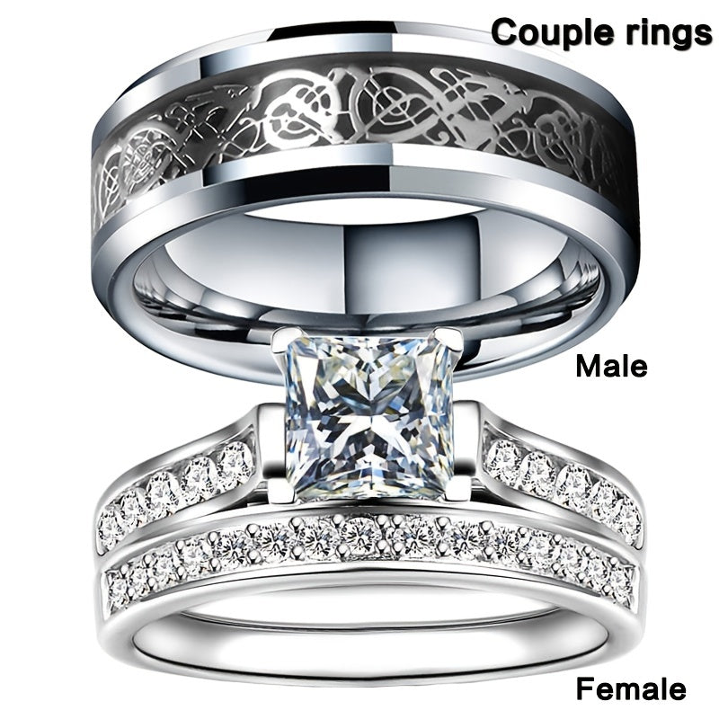 This couple ring set includes a women's engagement ring and a men's stainless steel wedding ring. Perfect for expressing your love and commitment to each other.