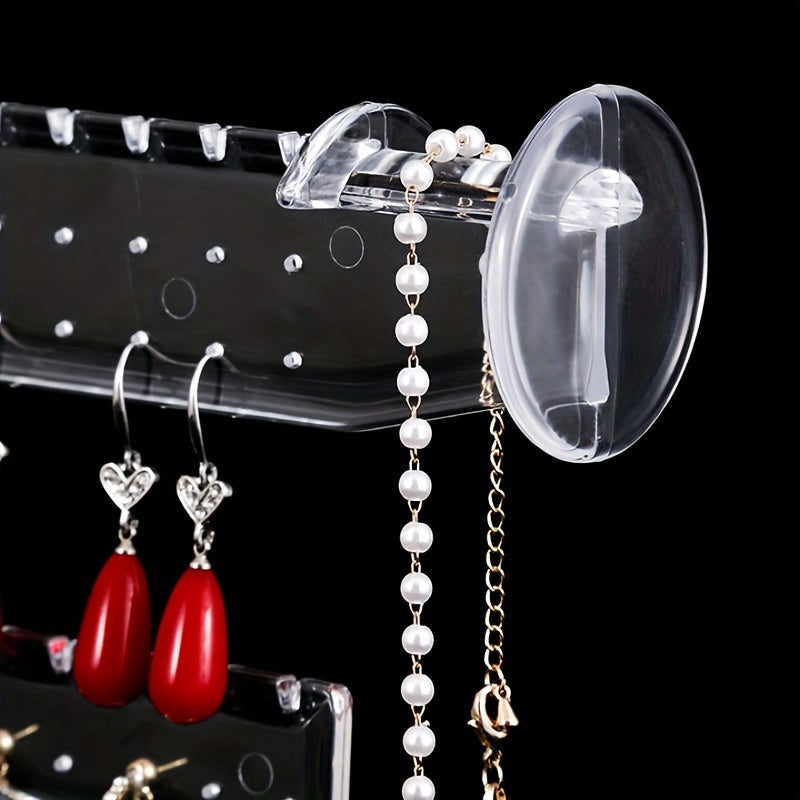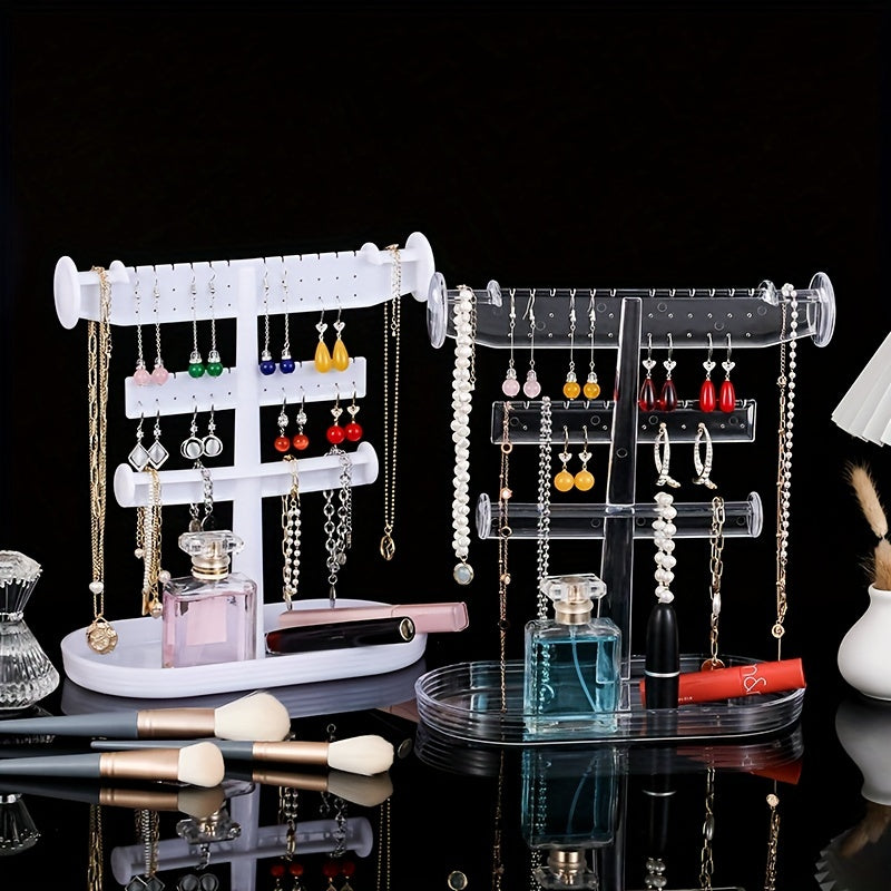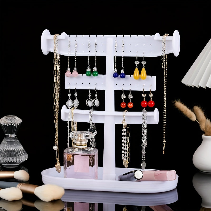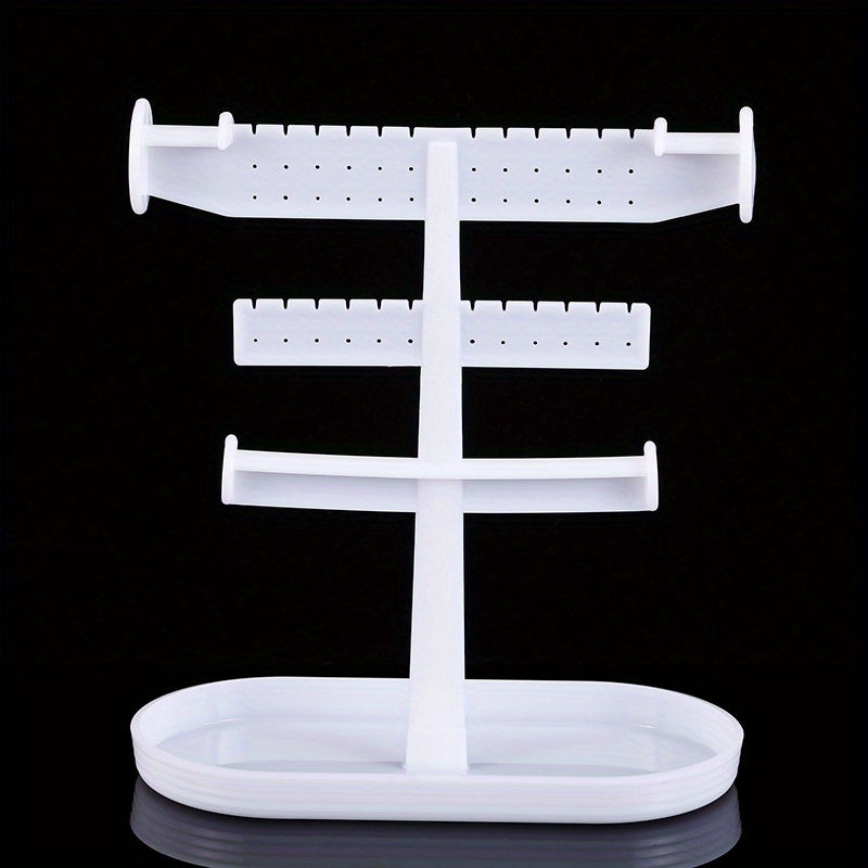 This plastic organizing storage rack is perfect for showcasing and organizing your jewelry collection. It can hold bracelets, necklaces, studs, earrings, and more.