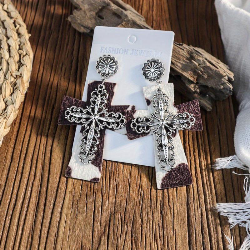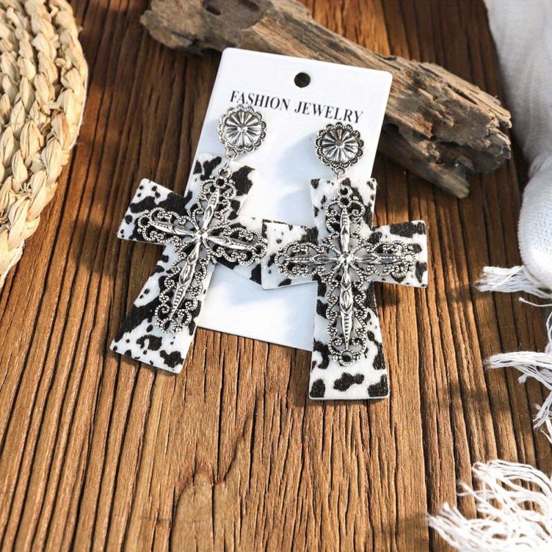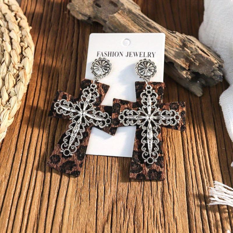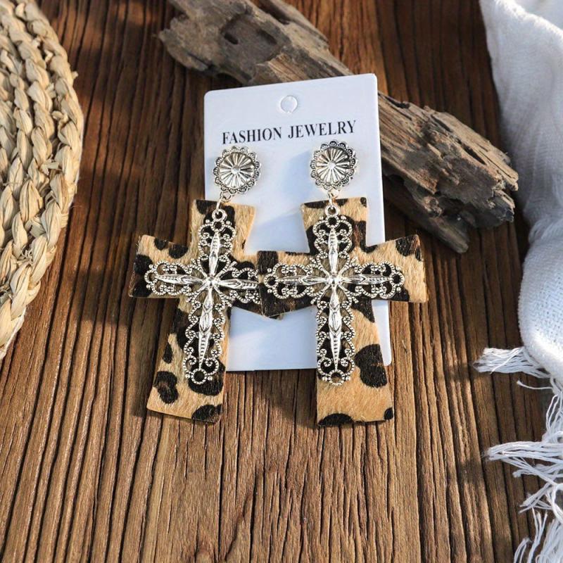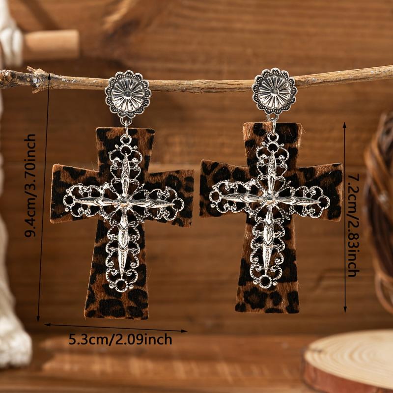 These Western cowgirl bohemian cross drop earrings feature a combination of leopard print and cowhide texture with intricate cross motif for a retro vintage look. Ideal for everyday wear.