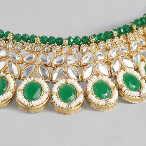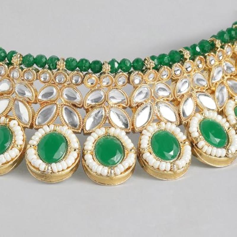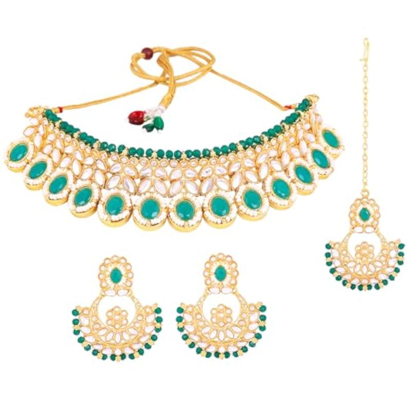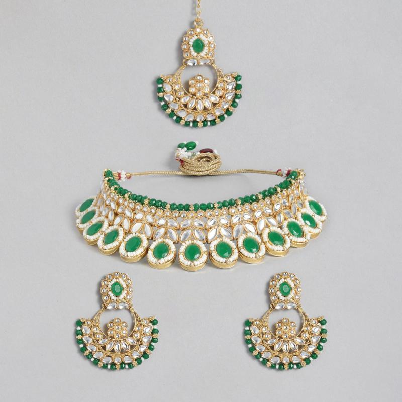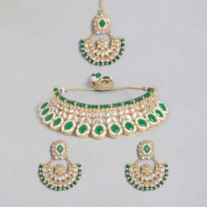 Elegant choker necklace set adorned with studded crystals and beading, complete with a matching maang tikka for a stunning look.