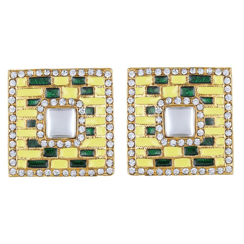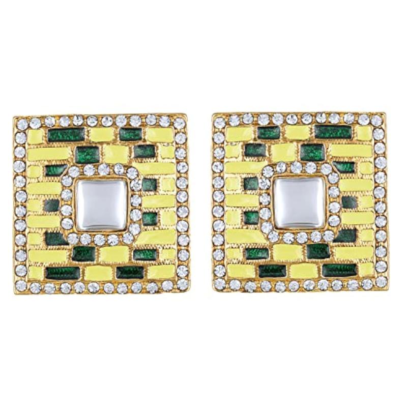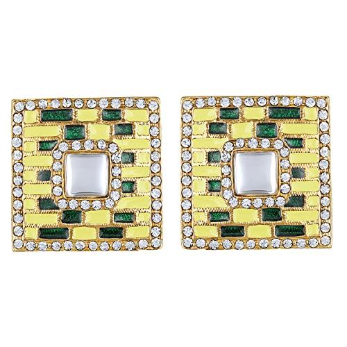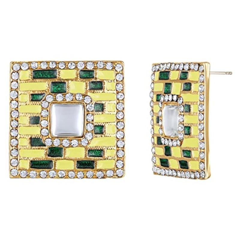Elegant square dangler earrings featuring crystals and vibrant yellow/green Meenakari enamel detailing.
