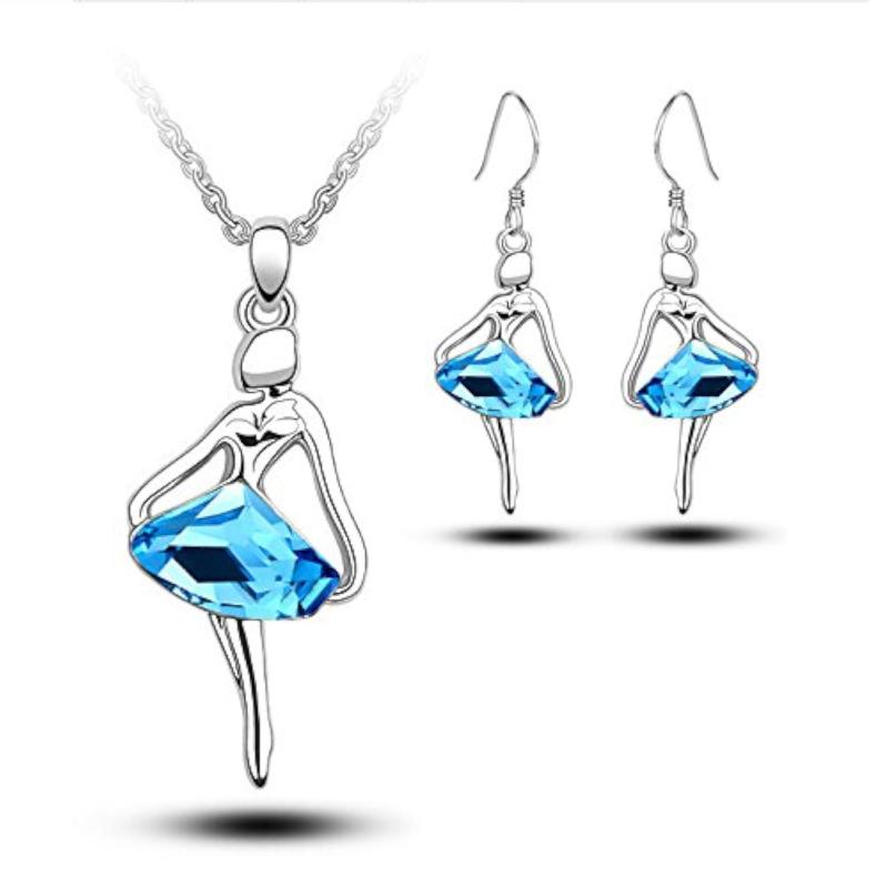 Elegant jewelry set featuring crystal pendant necklace, matching bangle bracelet, and stunning earrings.