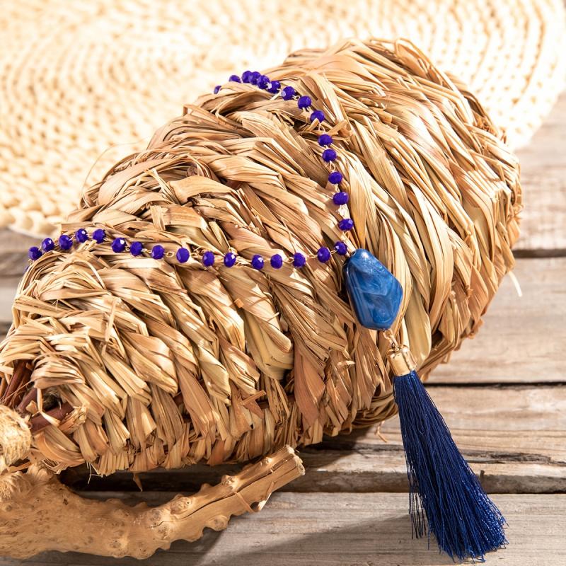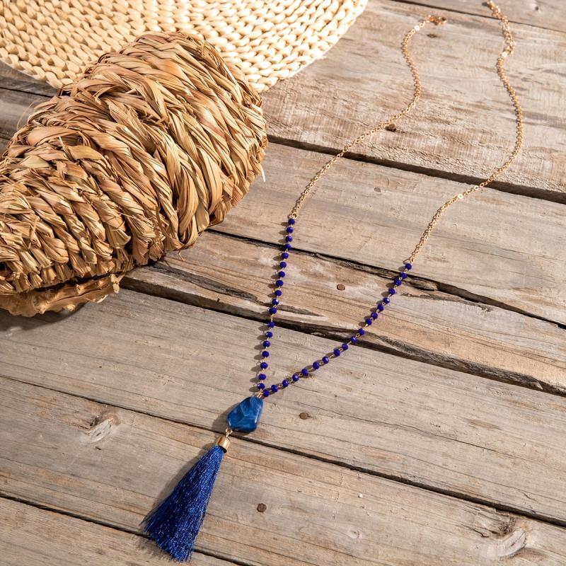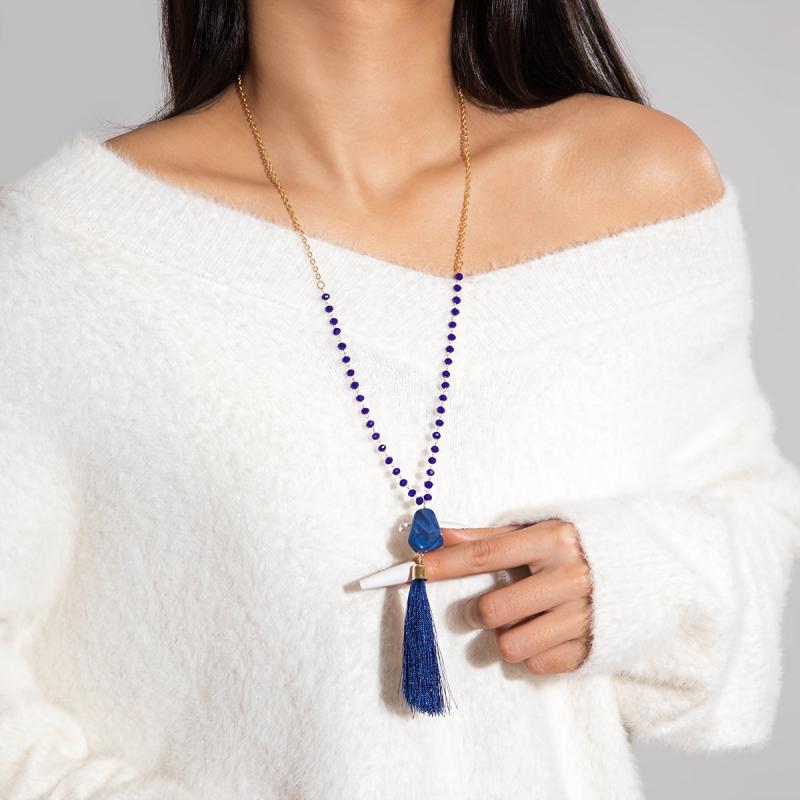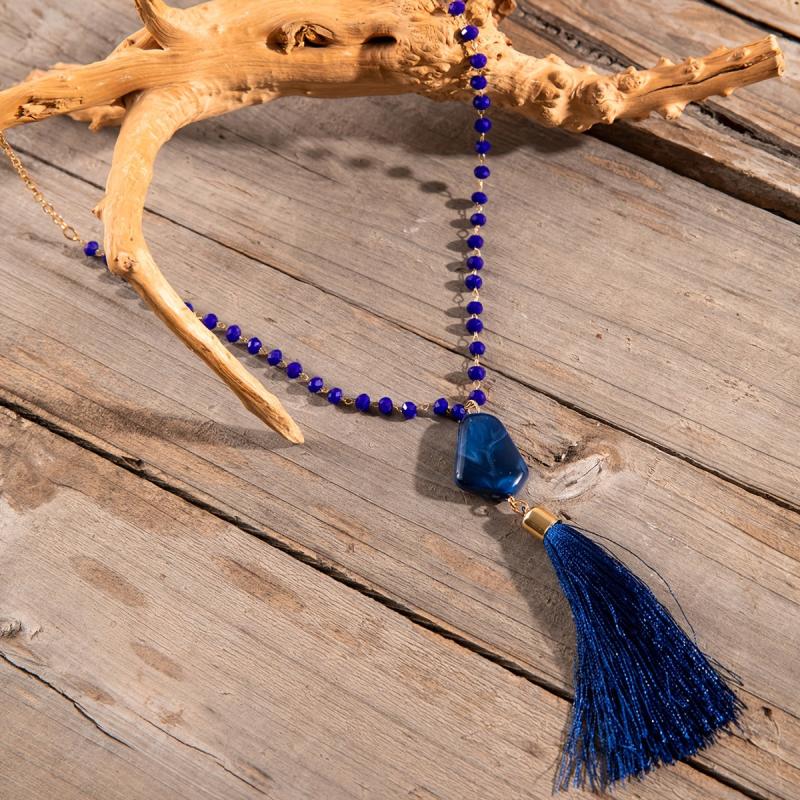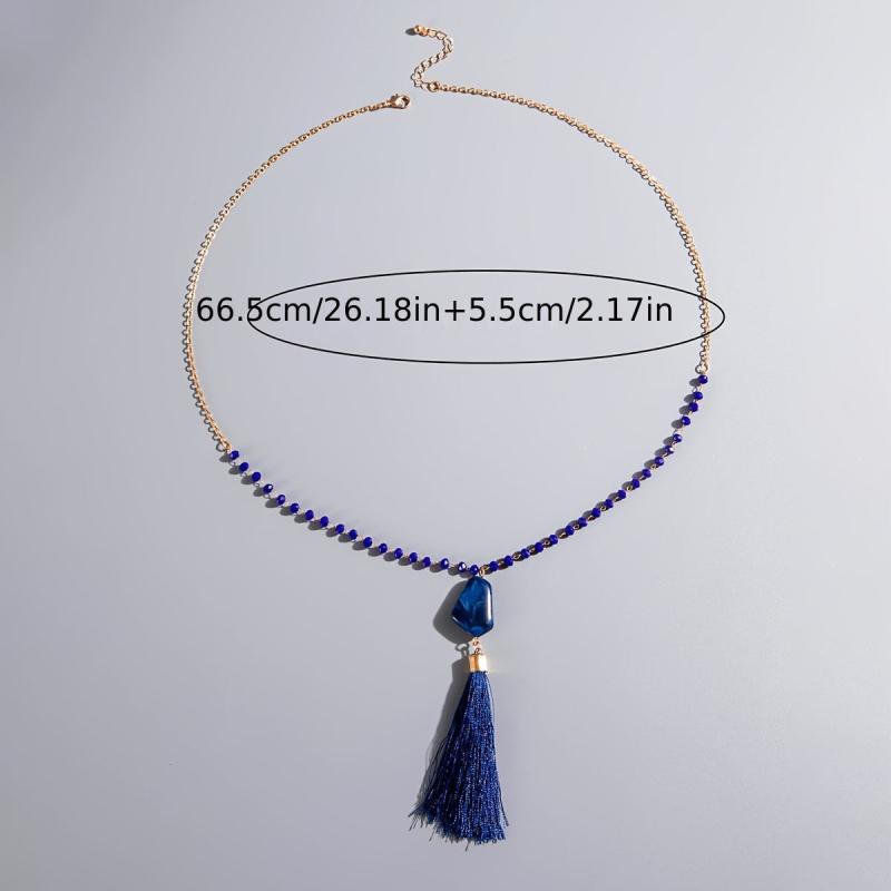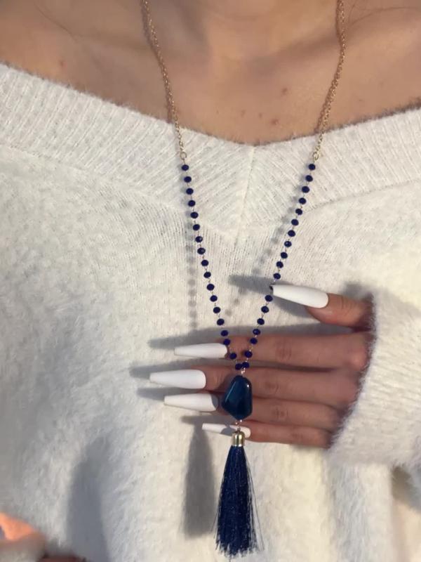 Elegant pendant featuring a unique crystal-like stone design on a polyester fiber cord with tassels. Great for prom or special occasions.