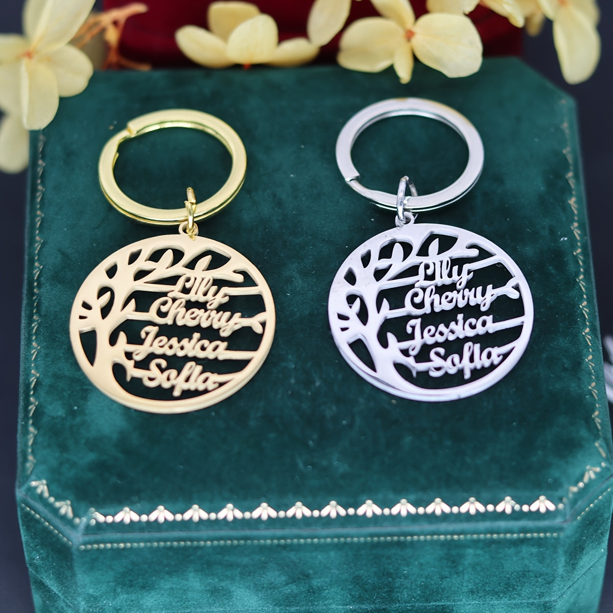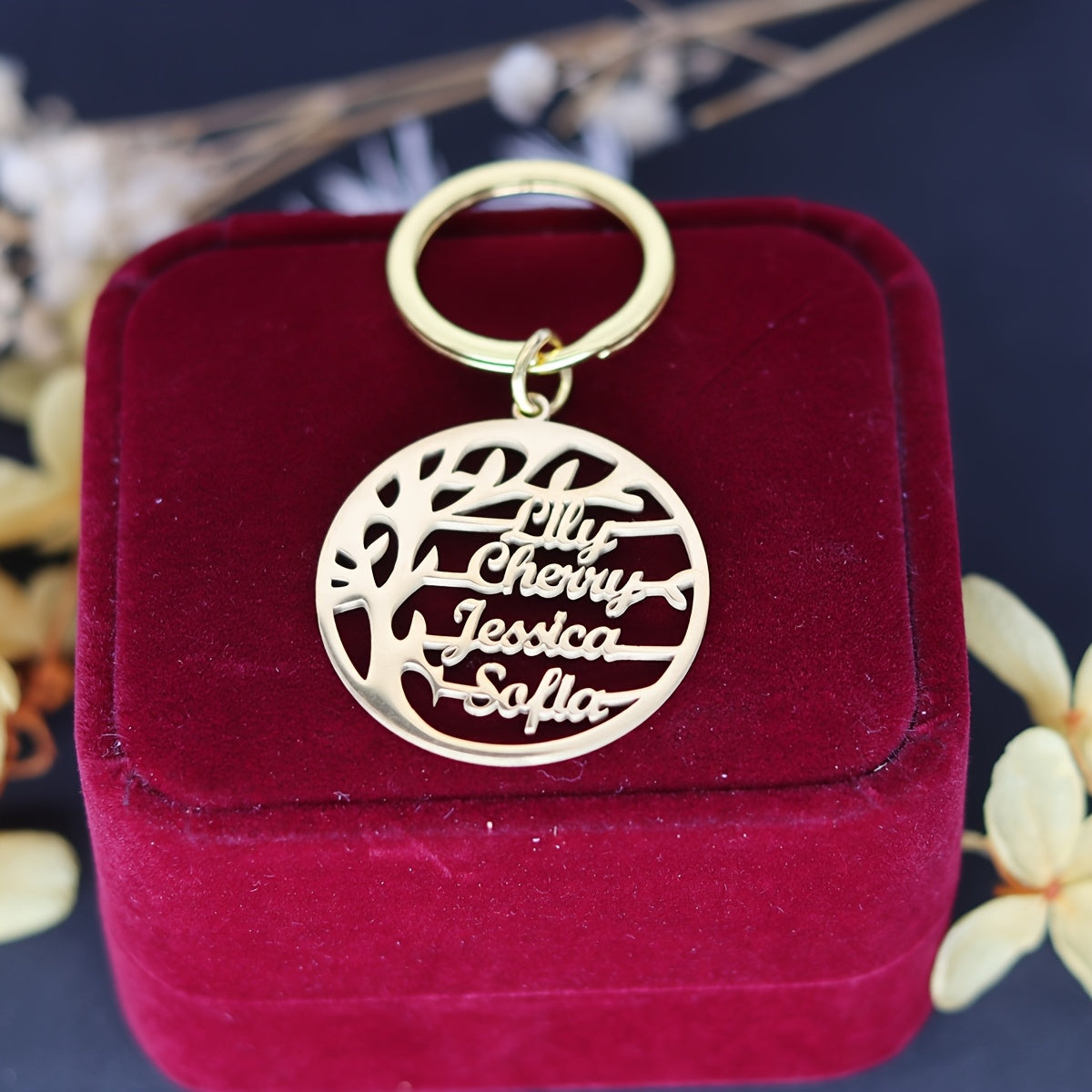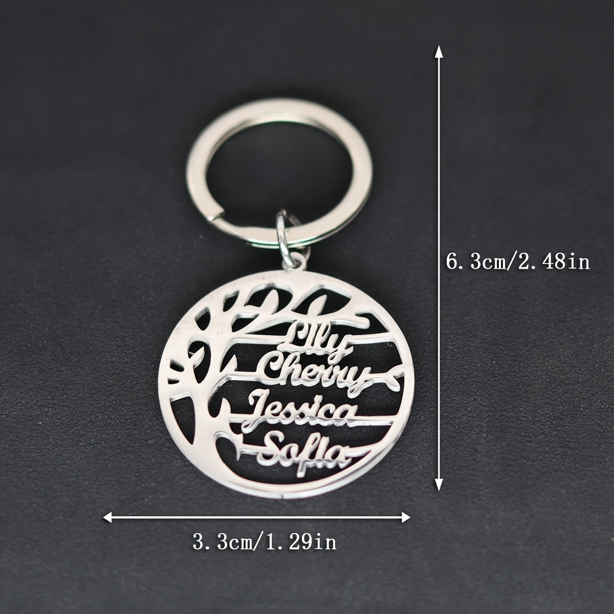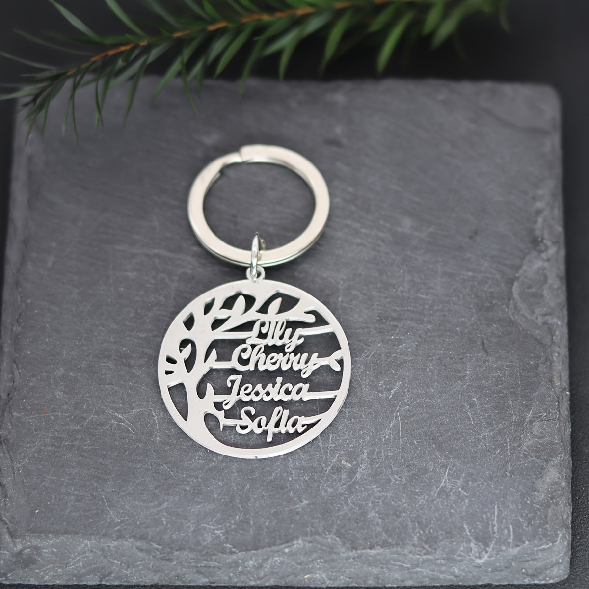 Personalized family tree keychain with 4 names, made of high-quality stainless steel. Great Christmas gift idea for family members.