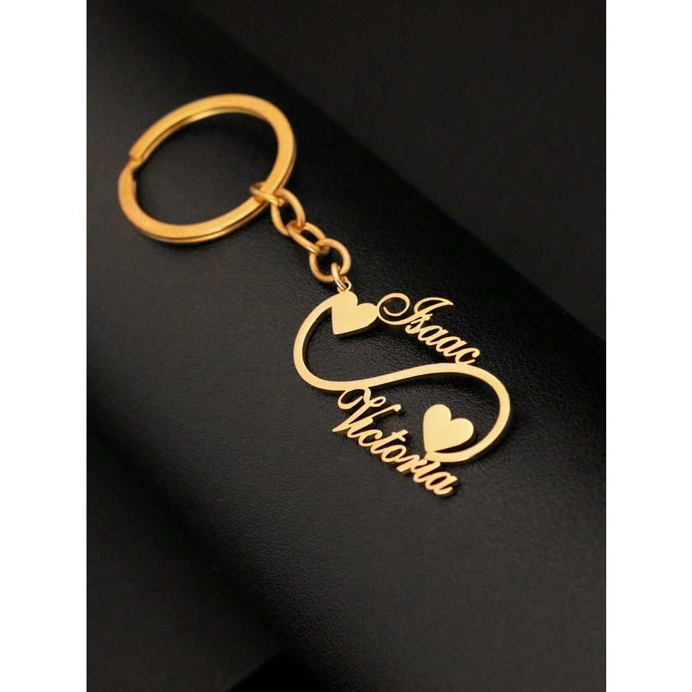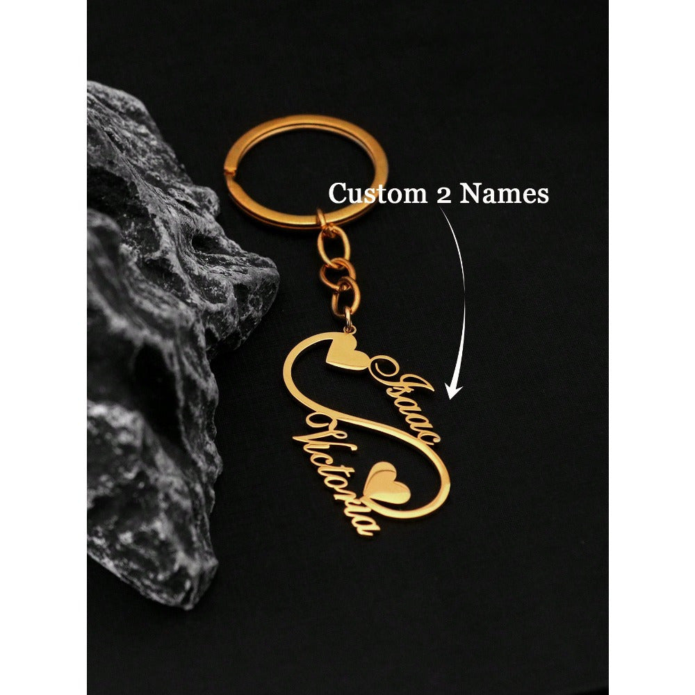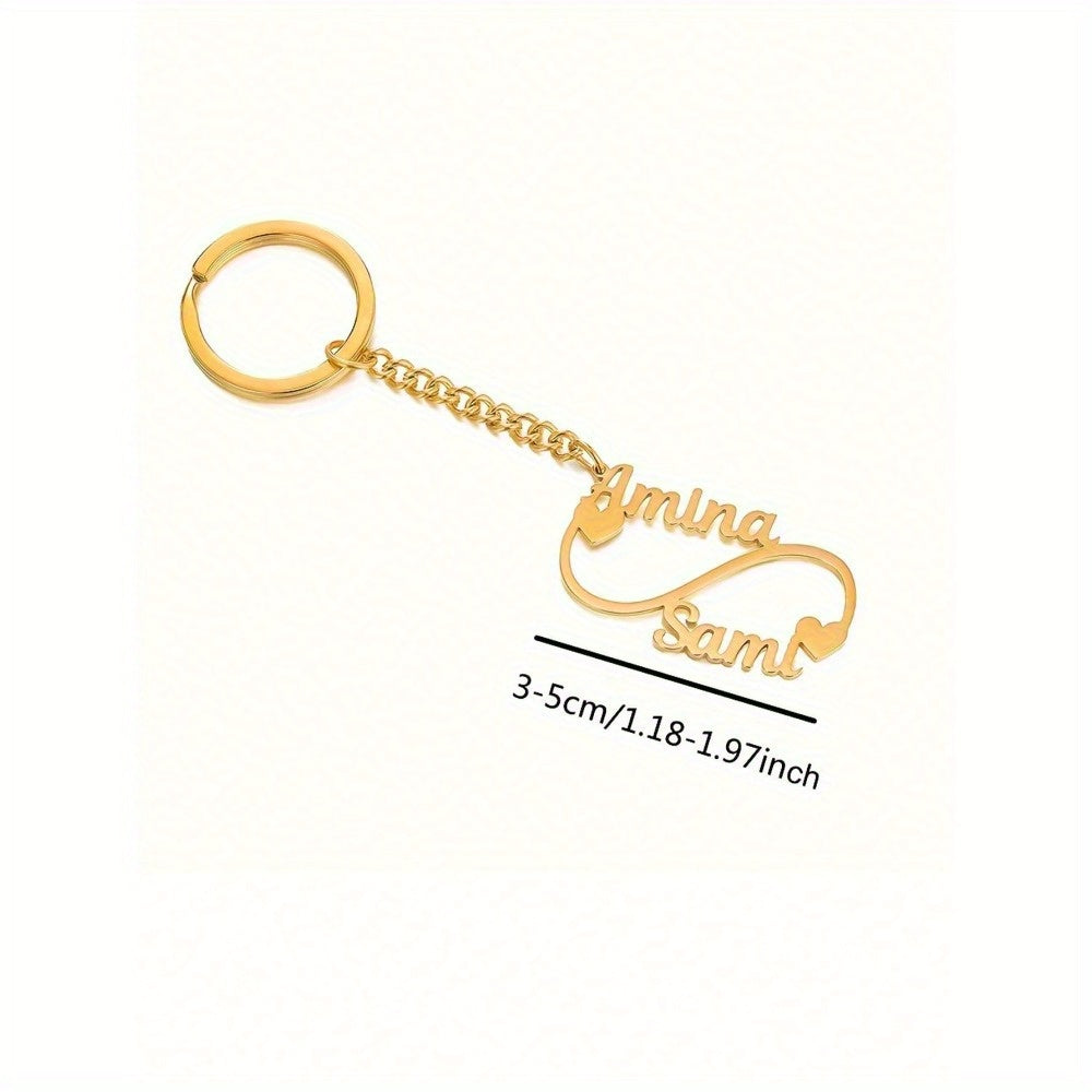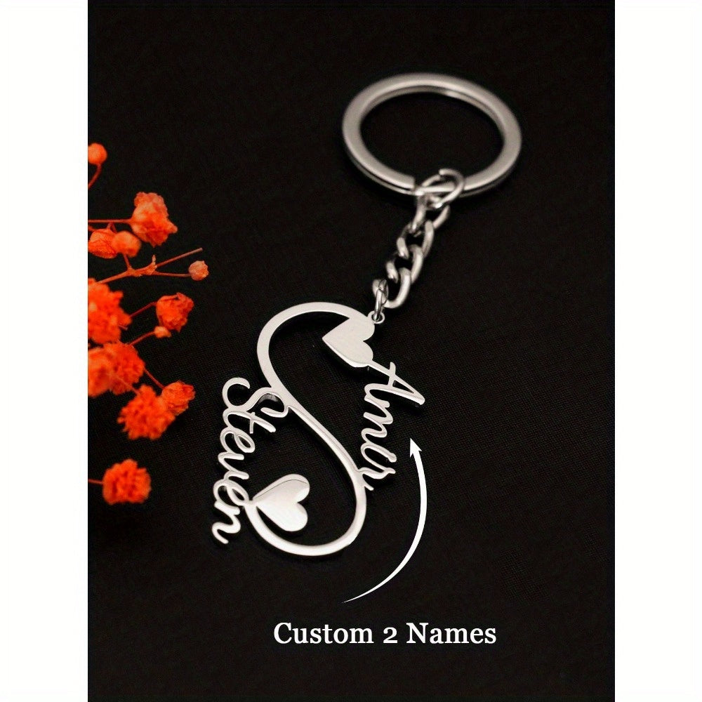 Personalize your style with this stylish stainless steel double heart symbol name keychain. Use it as a keychain or backpack pendant for a decorative touch.