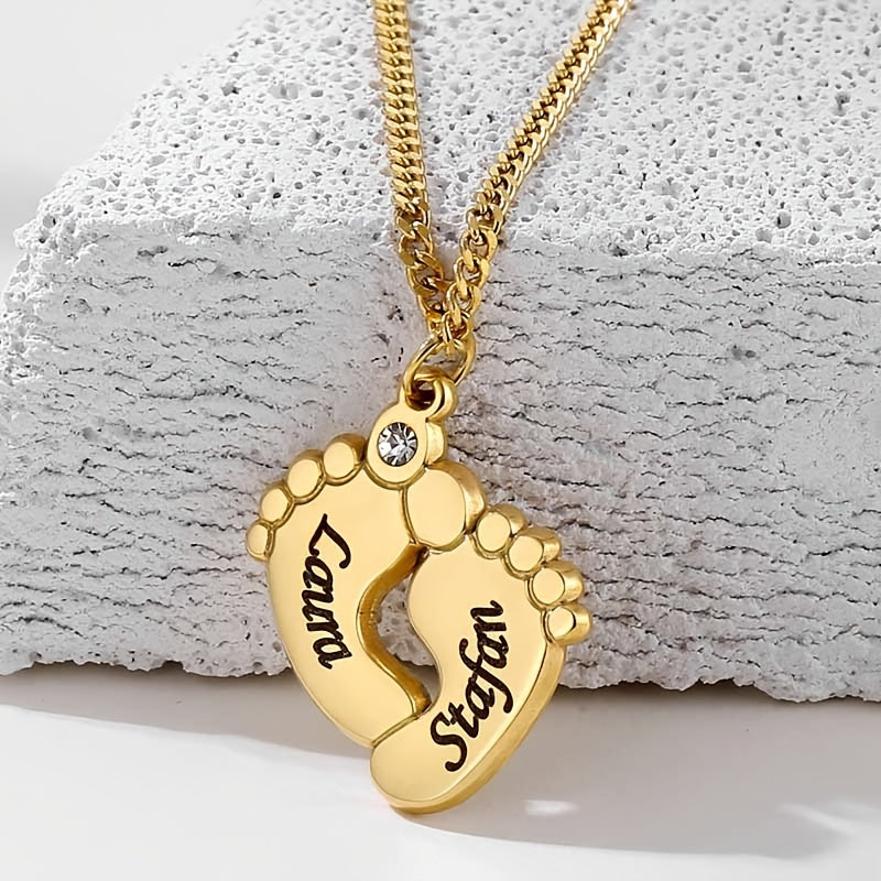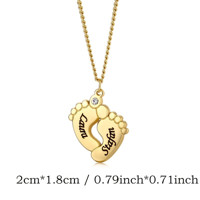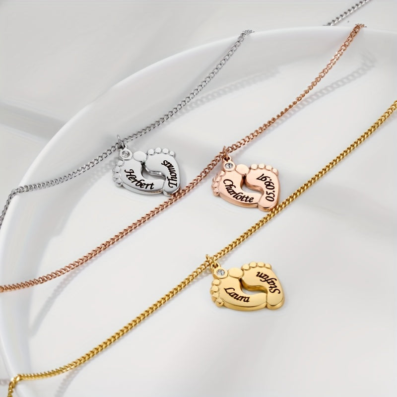 This stainless steel necklace features personalized engraving of baby's name and date with cute footprints pendant. A DIY crystal jewelry perfect for kids and mothers.
